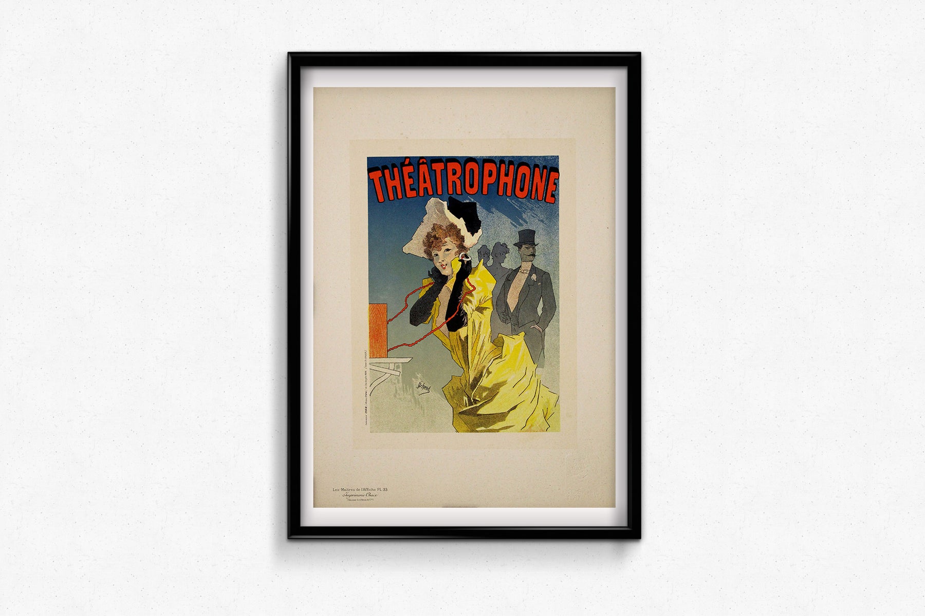 Le théâtrophone permettait aux abonnés d'écouter en direct des représentations d'opéra et de théâtre par téléphone – une merveille d'ingéniosité de la Belle Époque. La composition de Chéret saisit cette innovation avec une virtuosité dynamique : une élégante femme se penche vers un combiné téléphonique, transportée par le son, tandis que des notes de musique et des couleurs tourbillonnent autour d'elle dans un vortex onirique. Le fond se fond dans une douce brume pastel, accentuant l'extase du sujet et l'expérience magique que promet l'appareil.