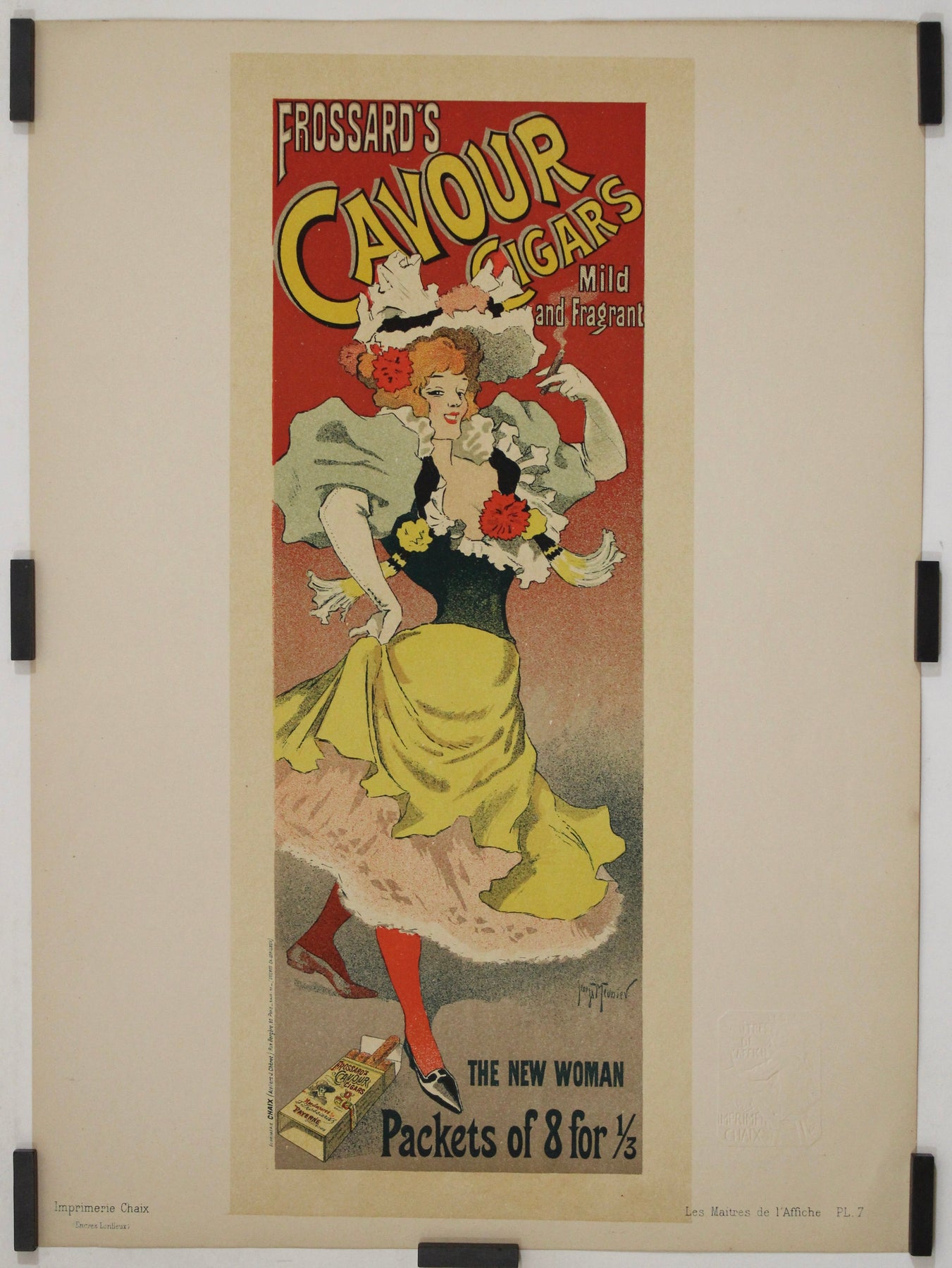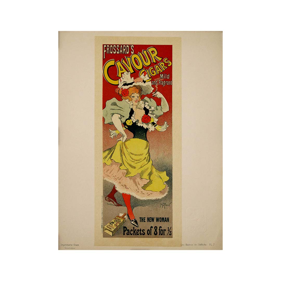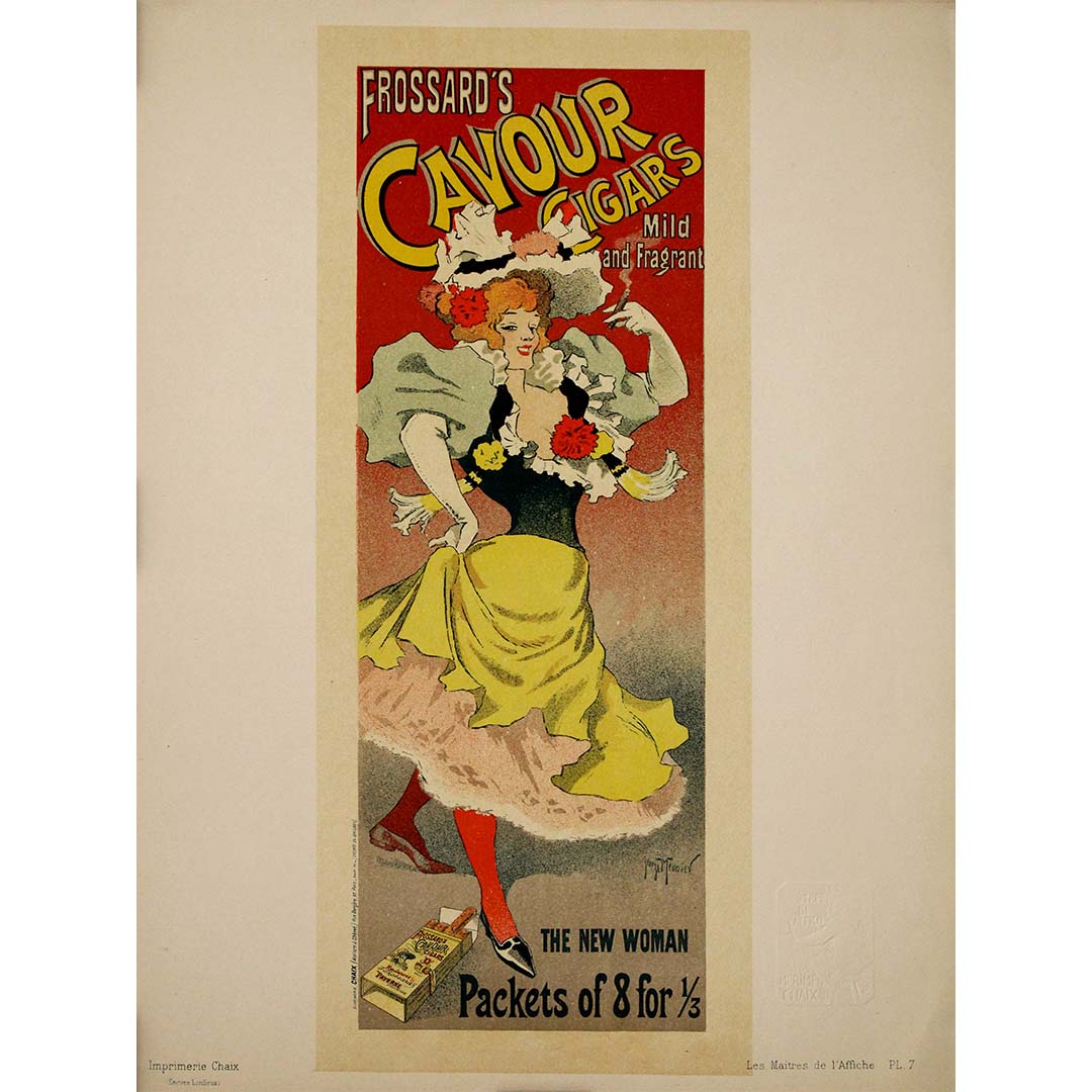Dans la série « Les Maîtres de l'Affiche » , la lithographie de Georges Meunier, « Cigares Frossard's Cavour – Doux et Parfumés », est un chef-d'œuvre de l'art publicitaire de la Belle Époque. Datant de 1896, elle illustre à merveille le style de vie raffiné et le goût sophistiqué associés à la culture du cigare à la fin du XIXe siècle.