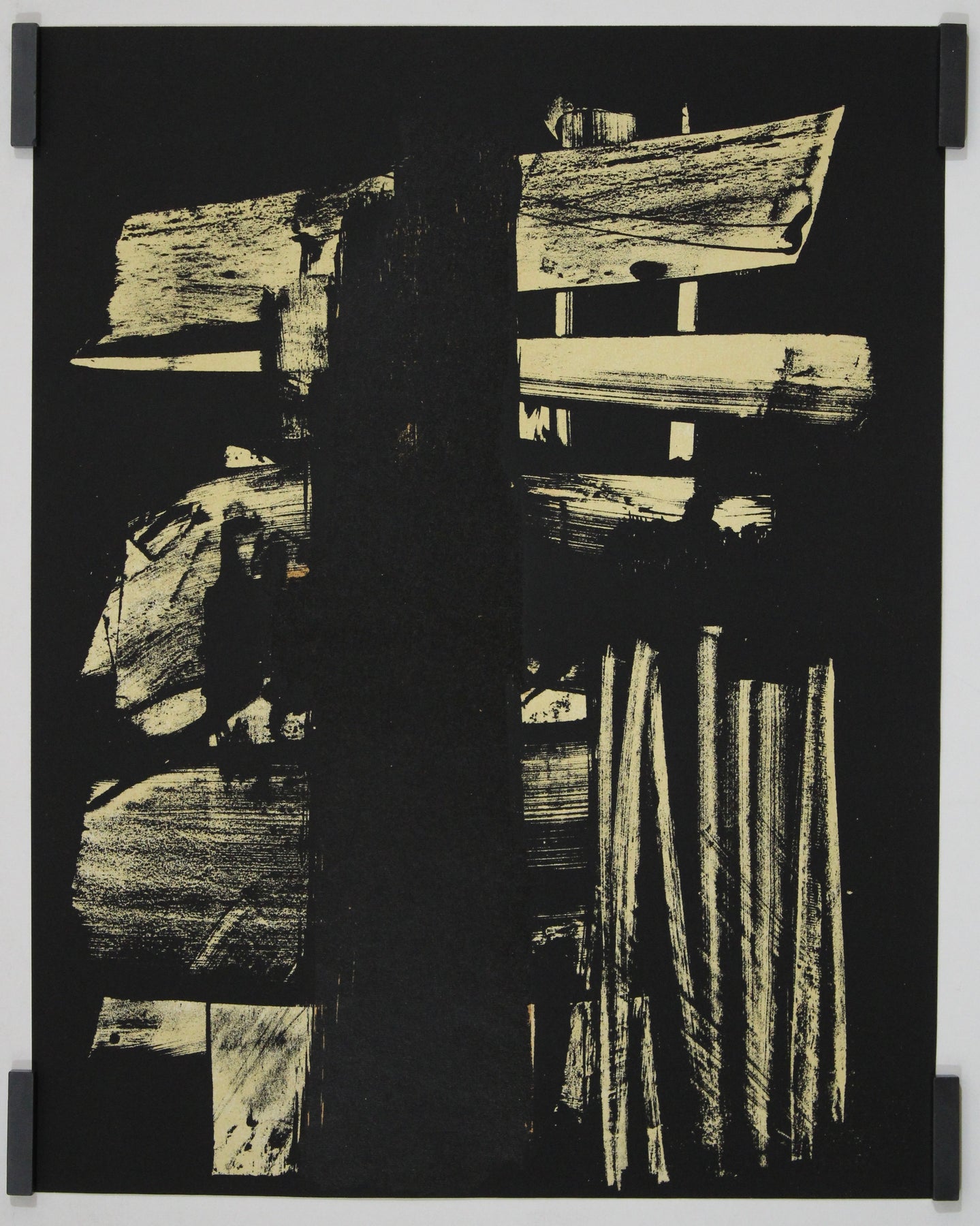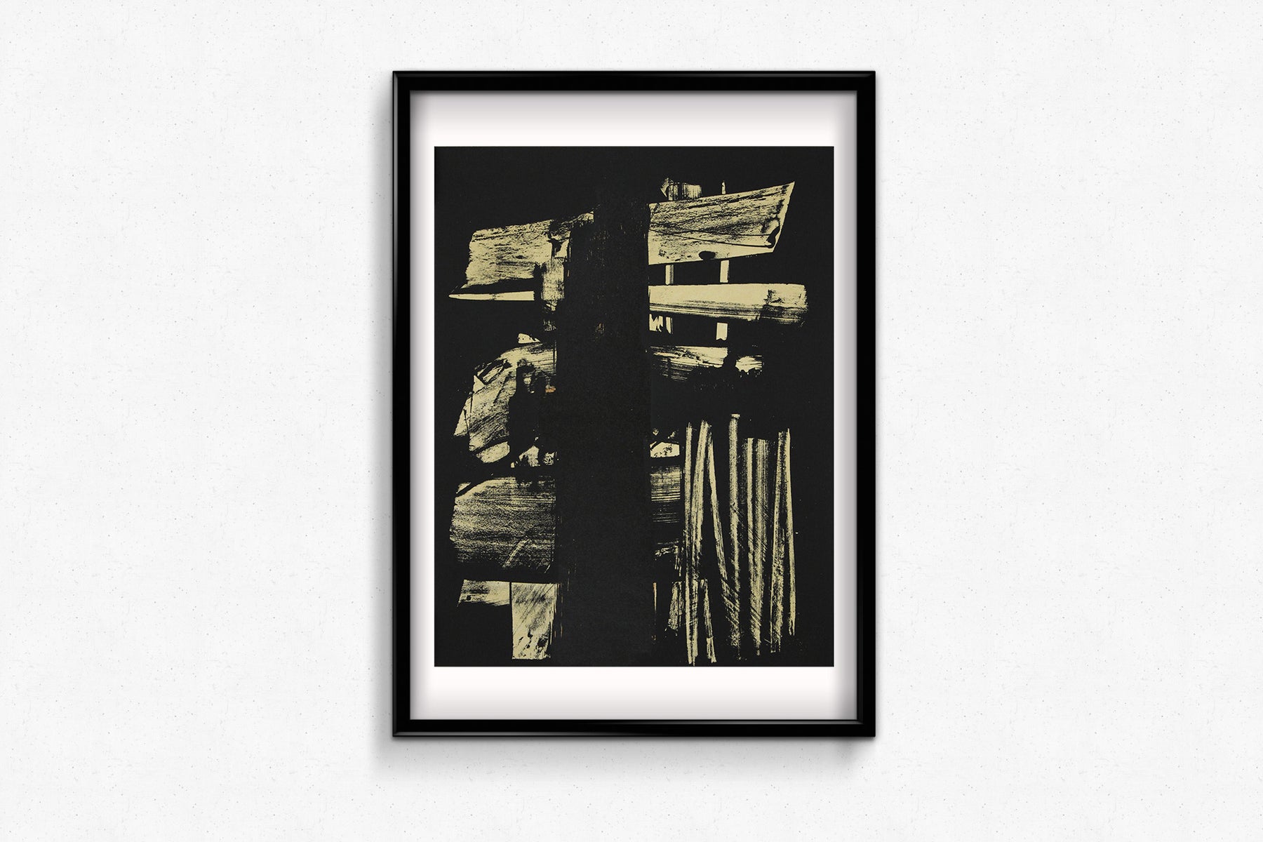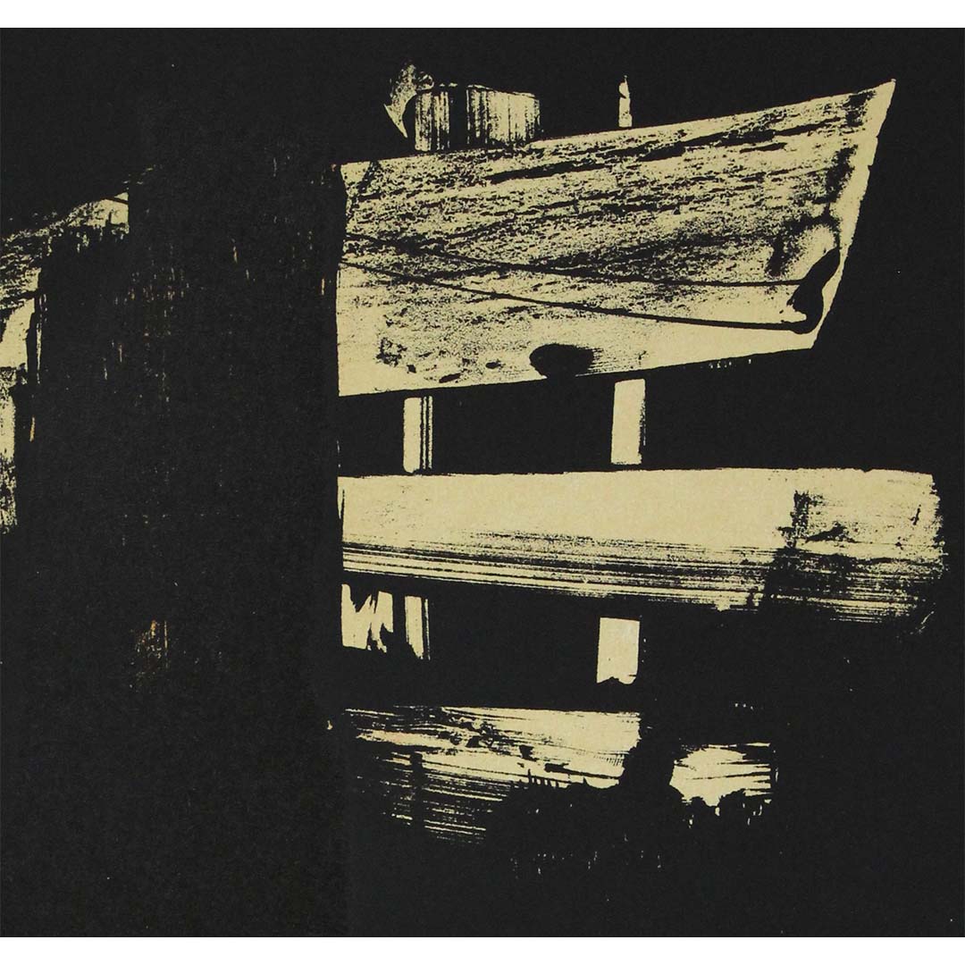 Soulages, surnommé le « peintre du noir », métamorphose ici le vide en forme. Des traits audacieux et gestuels d'encre noire profonde dominent la composition, superposés sur un papier crème clair. Les marques semblent à la fois spontanées et délibérées, brutales et harmonieuses. Le jeu des textures et des ombres confère à l'œuvre une présence quasi sculpturale.