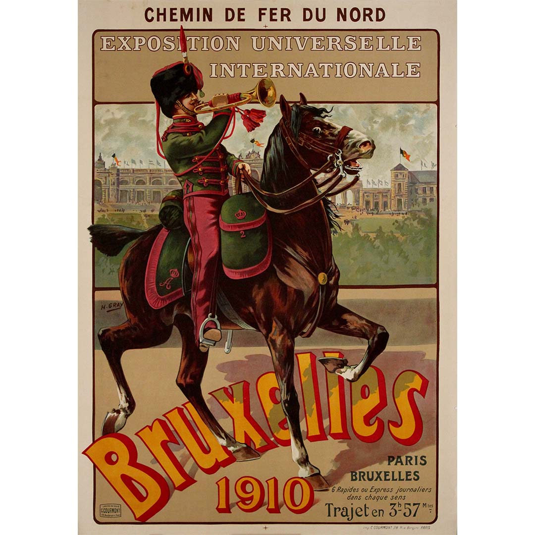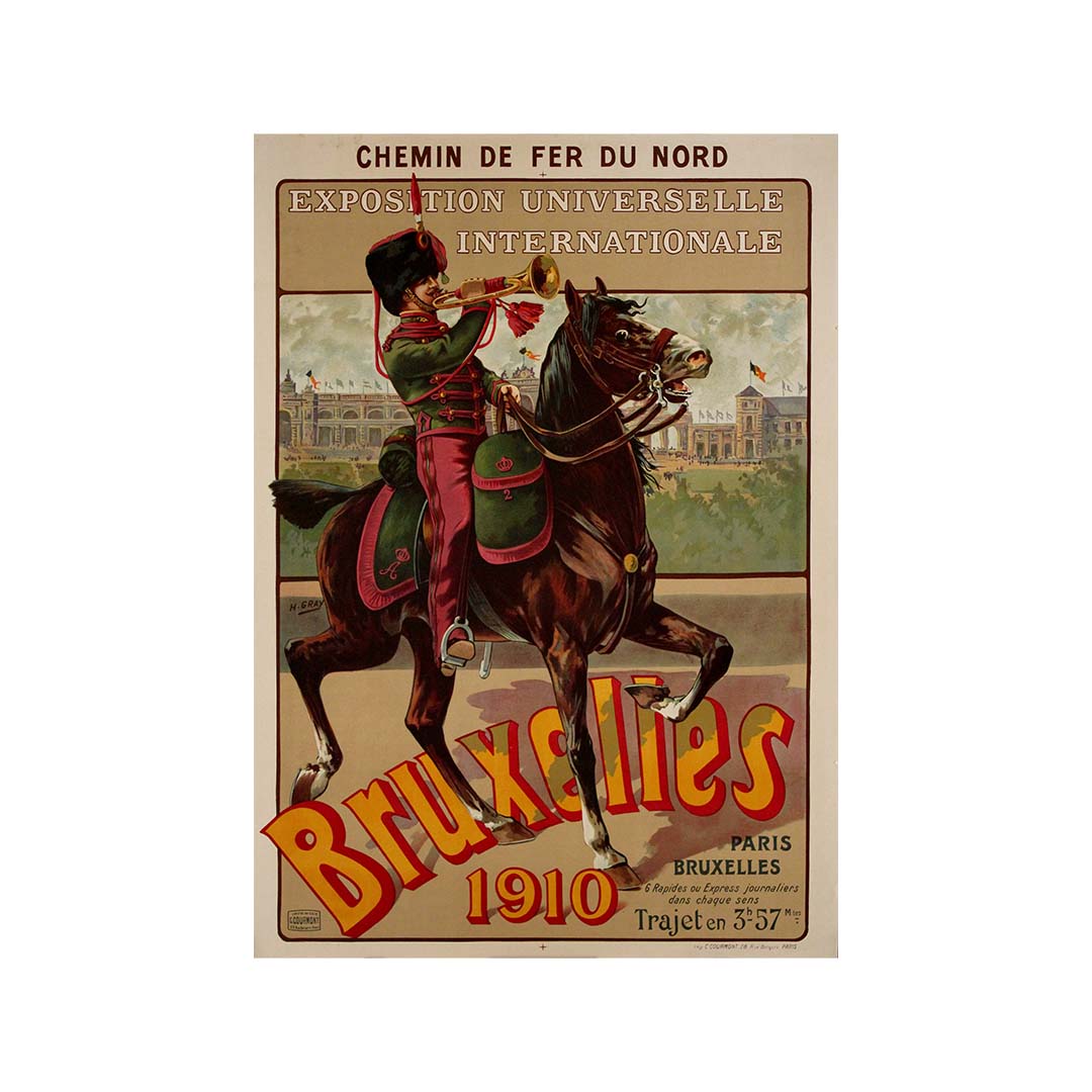 L'affiche originale de 1910, conçue par Henri Gray pour l'Exposition universelle de Bruxelles et réalisée pour le Chemin de fer du Nord, est un exemple remarquable de l'art publicitaire du début du XXe siècle. Cette exposition, l'une des plus importantes au monde, présentait les progrès de l'industrie, de la technologie et de la culture. L'affiche de Gray utilise des couleurs vives et d'élégants éléments Art nouveau pour saisir la grandeur de l'événement. La représentation du train souligne le lien entre Paris et Bruxelles, promouvant le chemin de fer comme un moyen de transport moderne et efficace pour se rendre à cette prestigieuse exposition internationale.
