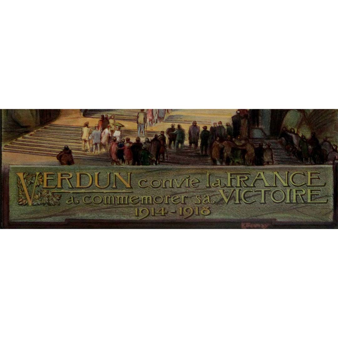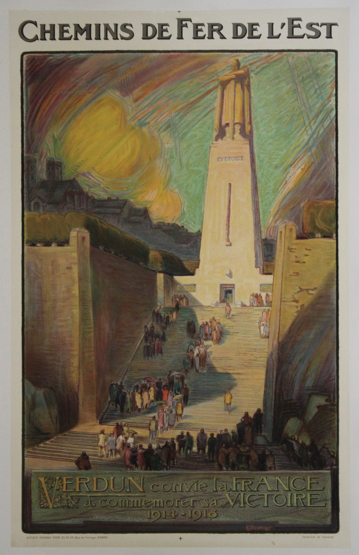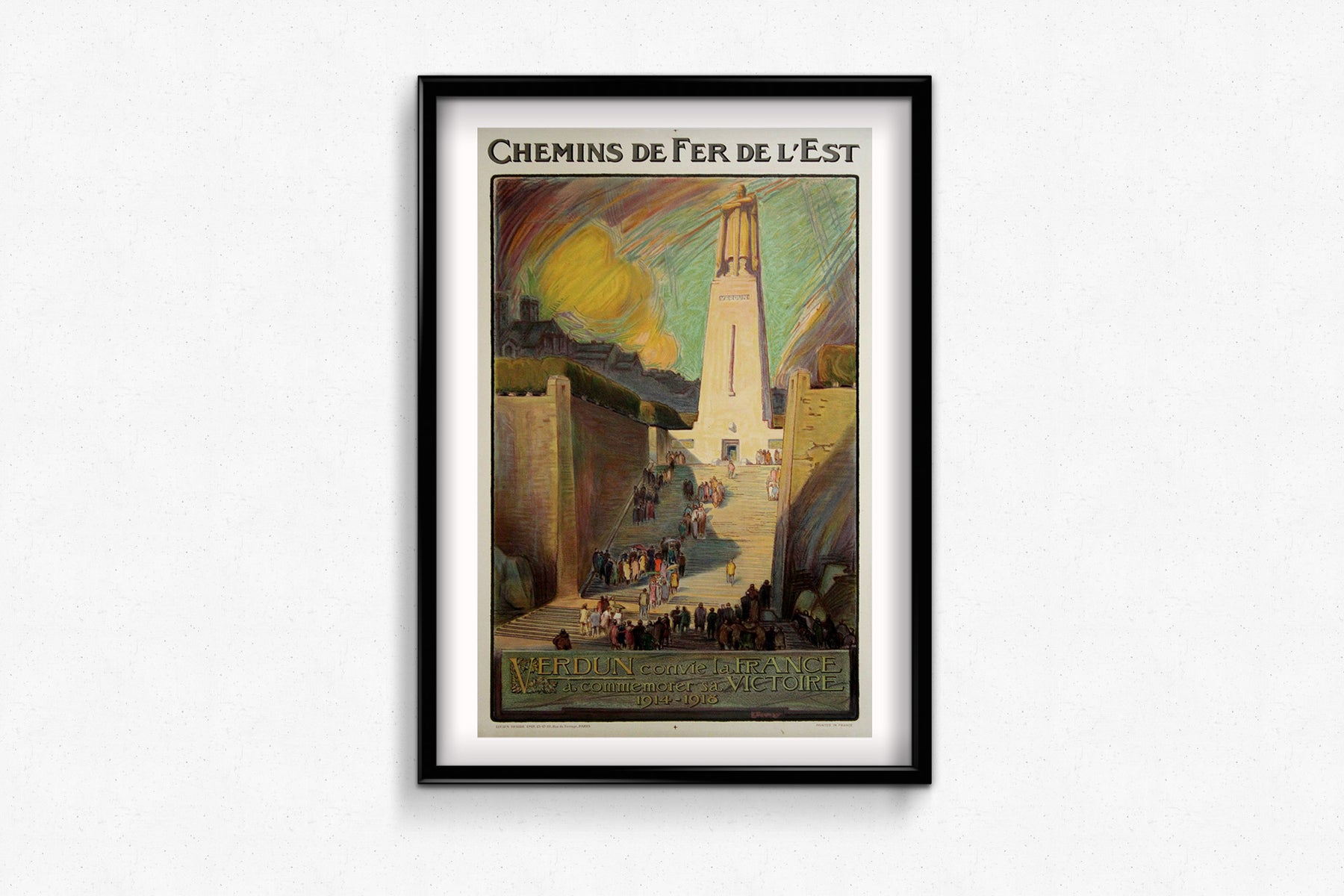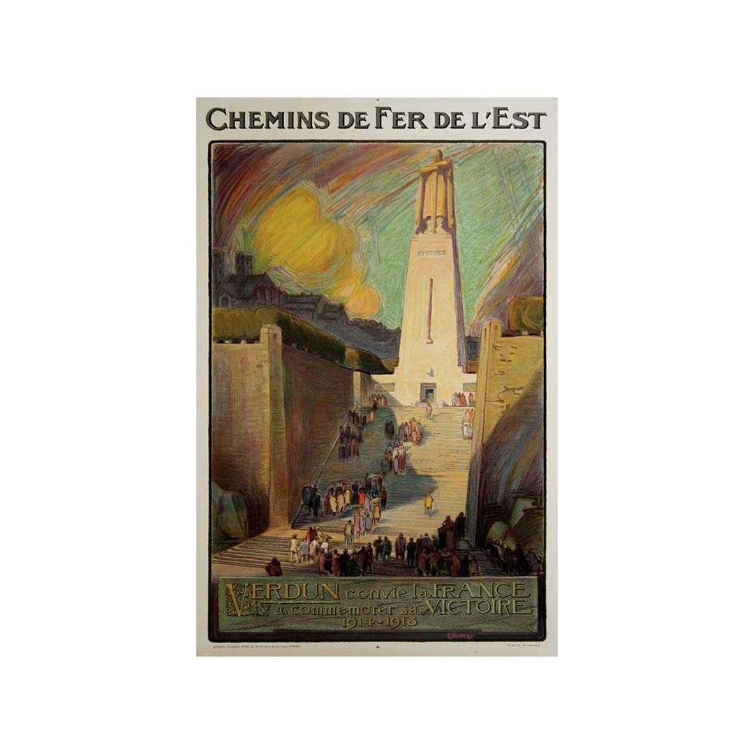 Publiée vers 1934, cette affiche originale de L.C. Besnay fut éditée par les Chemins de fer de l'Est pour promouvoir les voyages commémoratifs à Verdun, site emblématique de l'une des batailles les plus marquantes de la Première Guerre mondiale. Verdun était alors devenu un symbole national du sacrifice, de la résistance et de la victoire françaises.