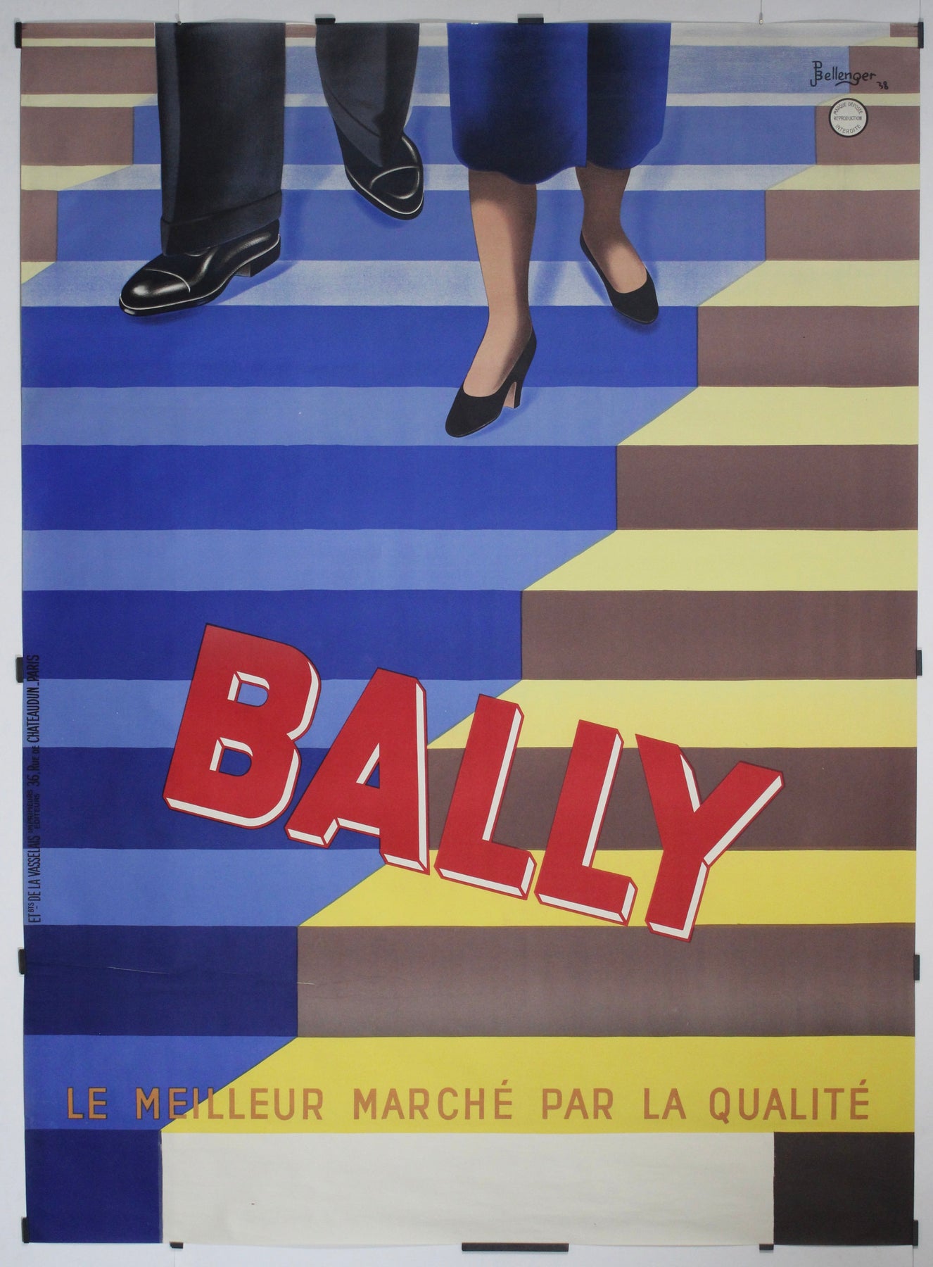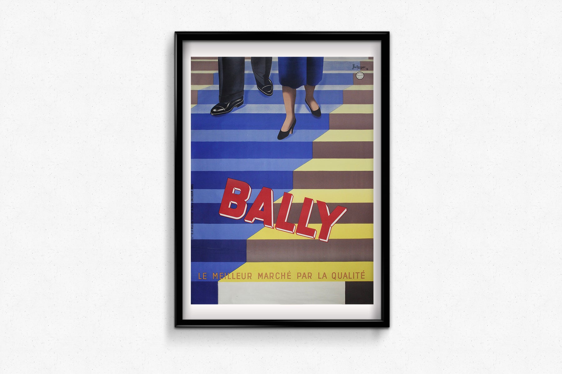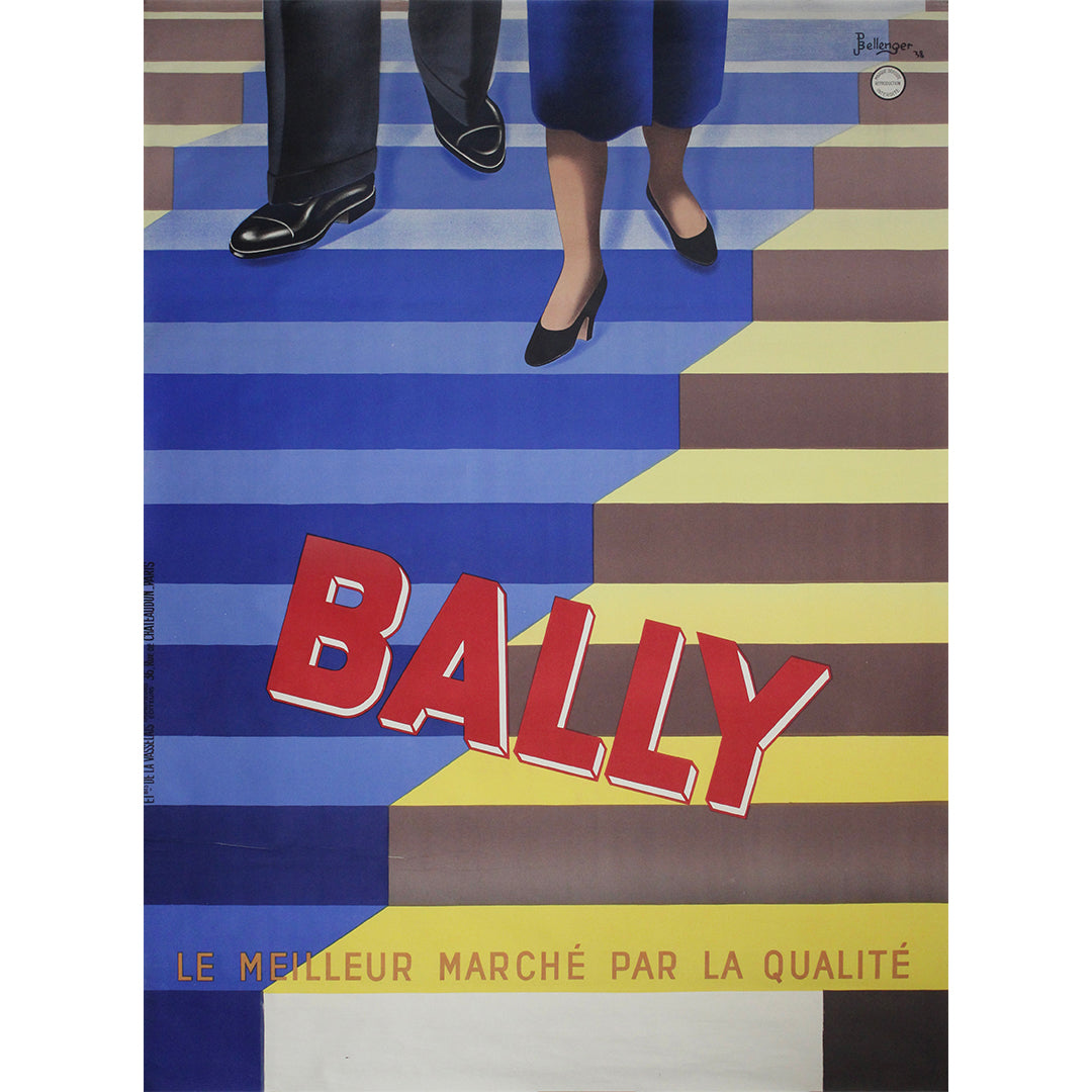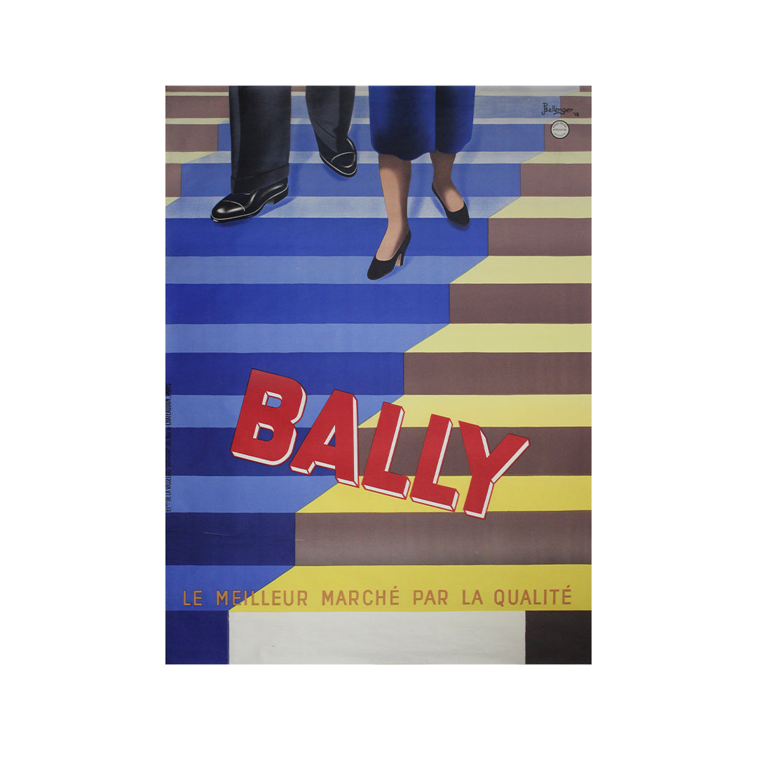 Le lettrage rouge vif « BALLY » semble gravir les marches, attirant le regard en diagonale sur l’affiche dans un geste qui évoque à la fois le mouvement et le raffinement. Le slogan, « Le meilleur marché par la qualité », résume avec concision l’identité de la marque : un luxe accessible, fruit d’un savoir-faire d’exception.
