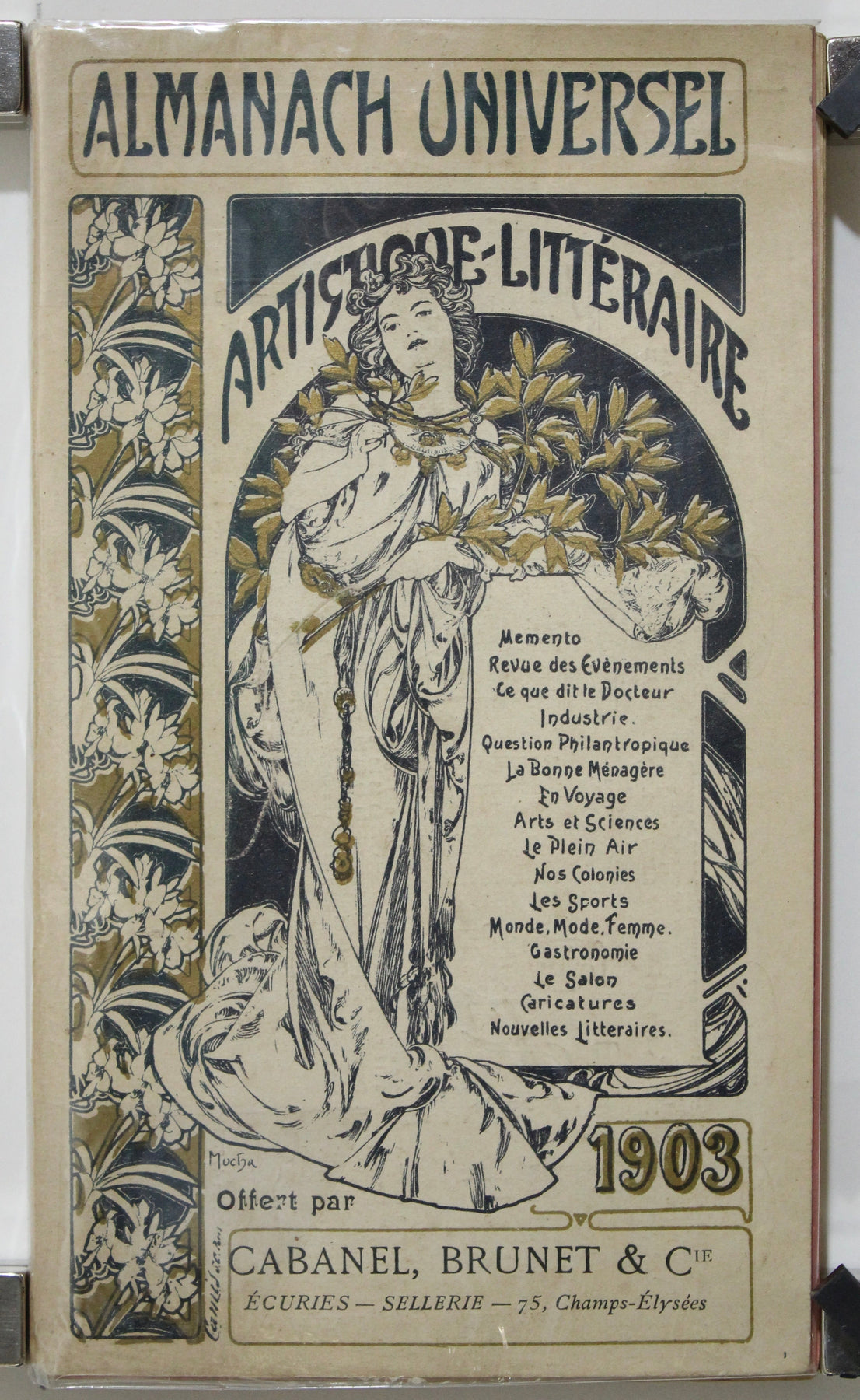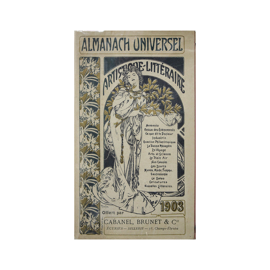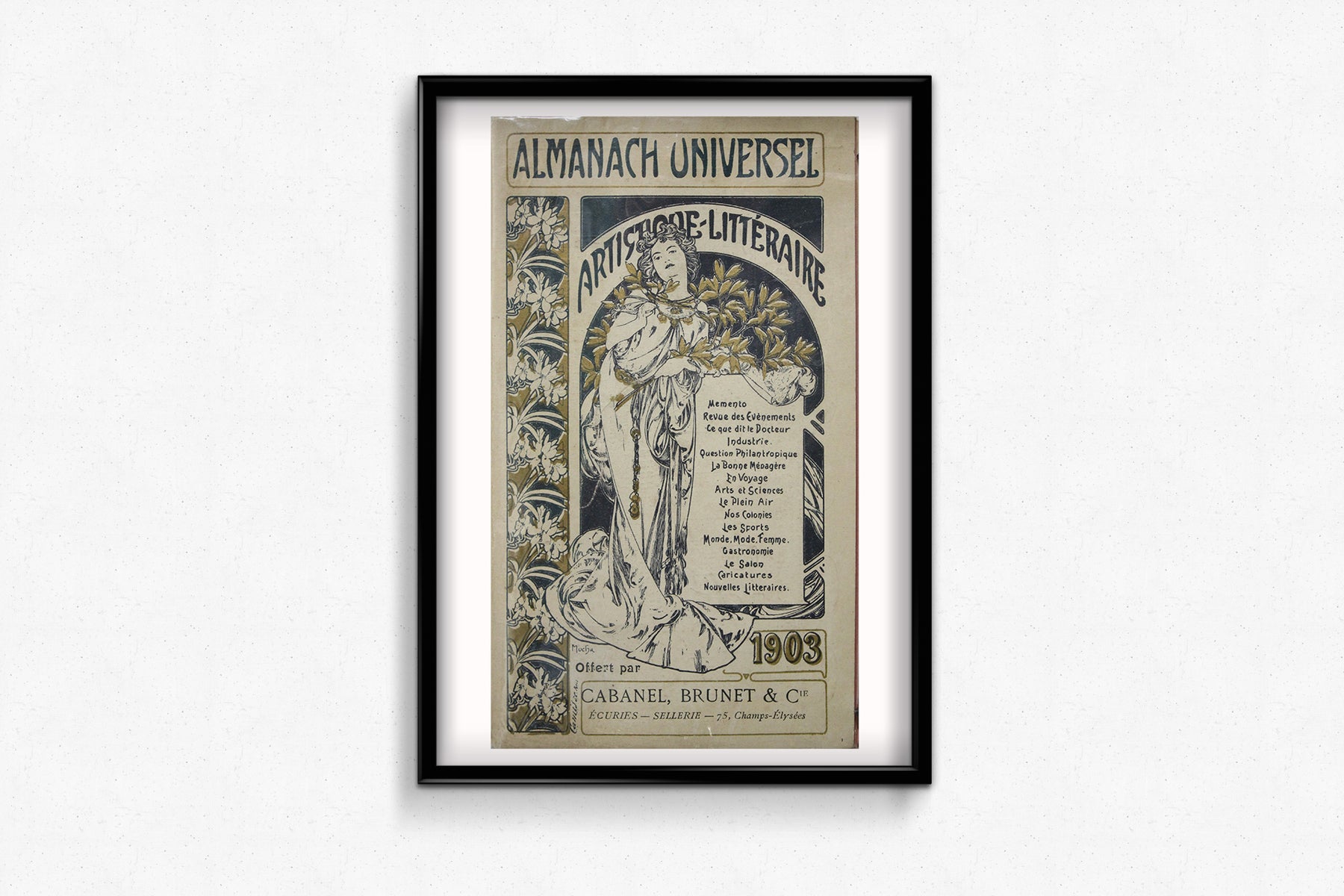 À l'aube du XXe siècle, Alphonse Mucha, maître de l'Art nouveau, créa cette couverture exquise pour l'édition de 1903 de l' Almanach Universel Artistique-Littéraire . Célébrant à la fois le raffinement artistique et l'épanouissement intellectuel, cet almanach était un recueil annuel richement illustré de littérature, de commentaires sociaux, de sciences, de voyages, de mode et d'arts décoratifs. Sa présentation somptueuse et son contenu témoignent d'une époque où l'édition et l'illustration étaient élevées au rang d'art majeur.