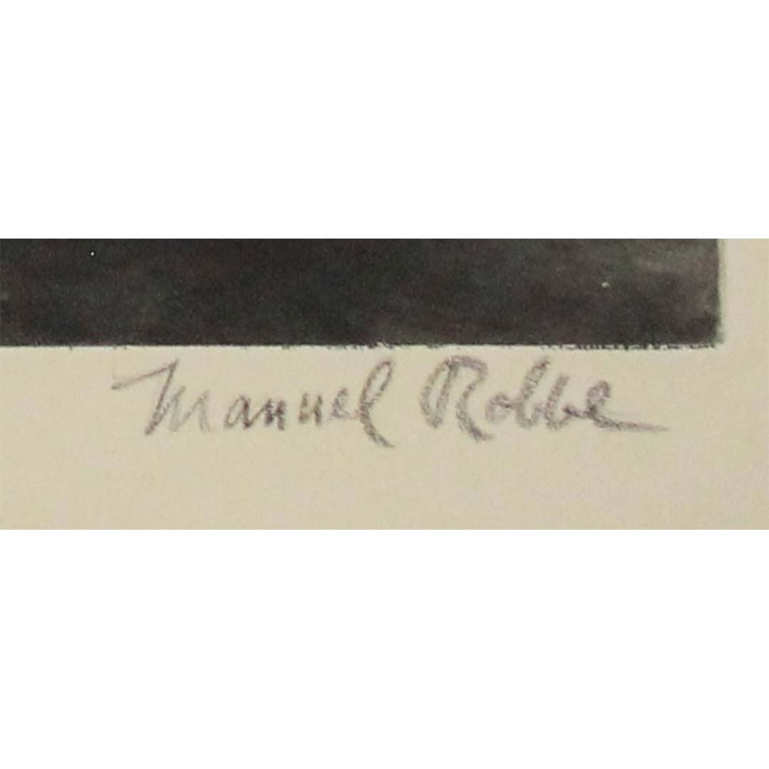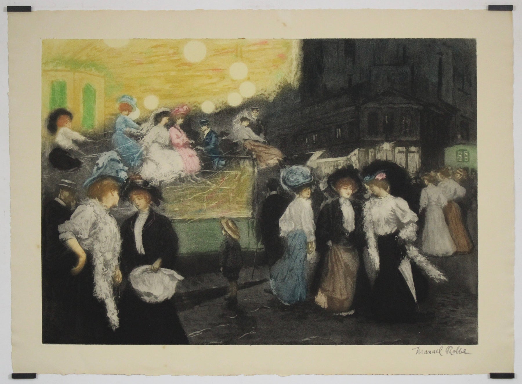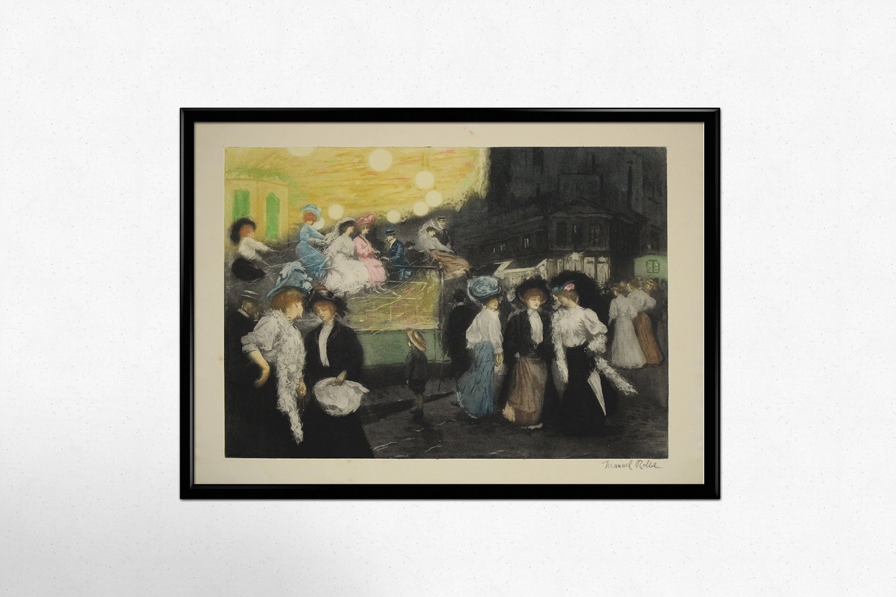 Dans cette lumineuse scène Belle Époque, Manuel Robbe pose son regard raffiné sur la place Blanche, l'un des quartiers les plus animés de Paris, situé au pied de Montmartre et célèbre pour sa proximité avec le Moulin Rouge. Intitulée « Le Manège », cette gravure à l'aquatinte, datant d'environ 1920, capture la joie et l'énergie de la vie parisienne au crépuscule.