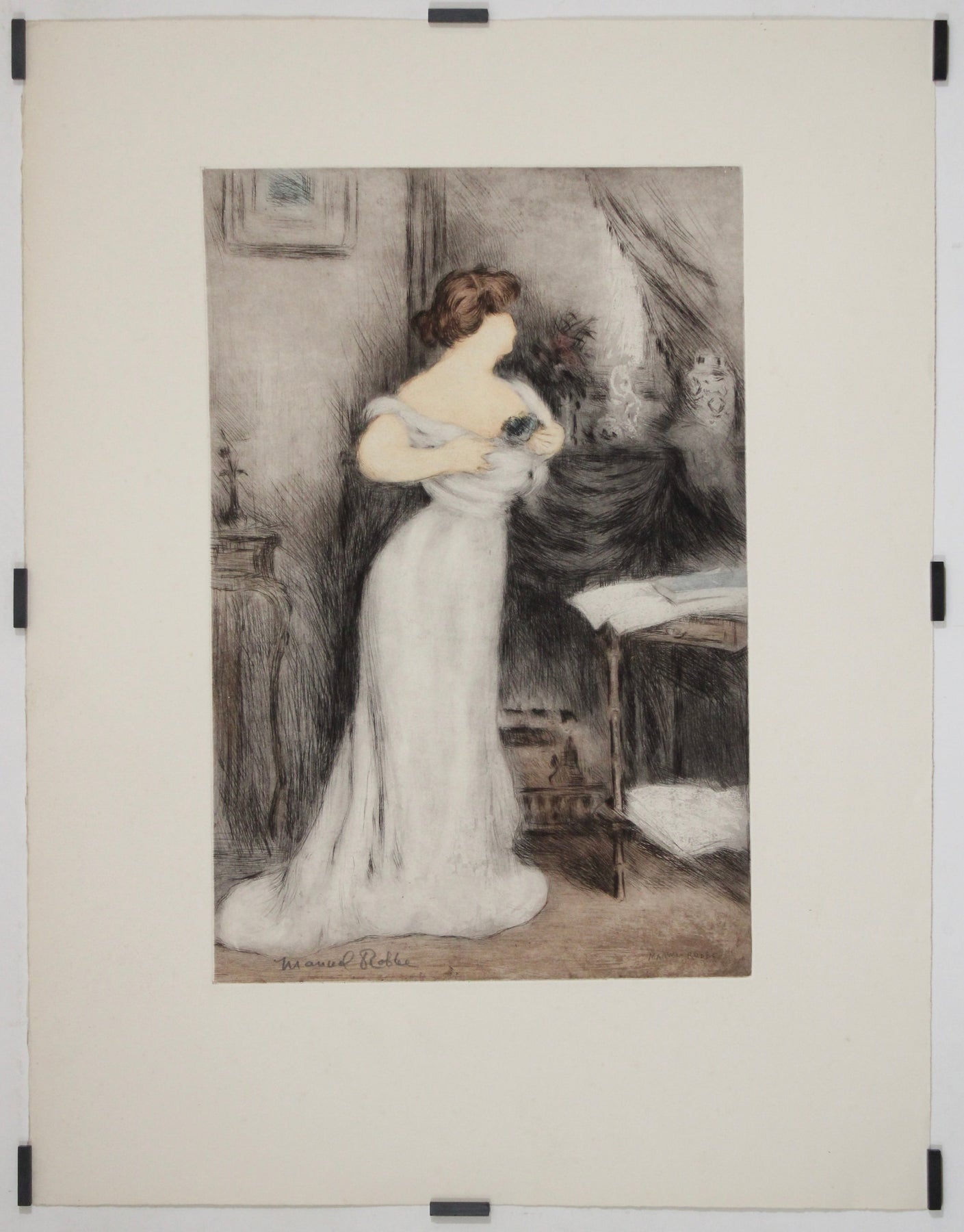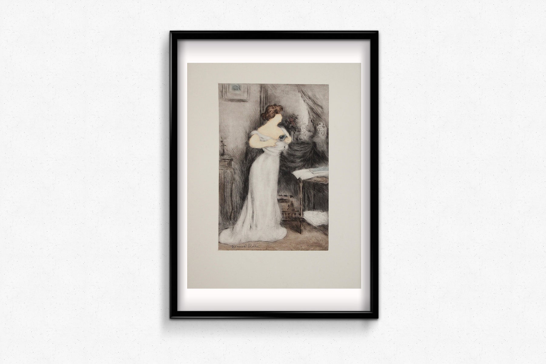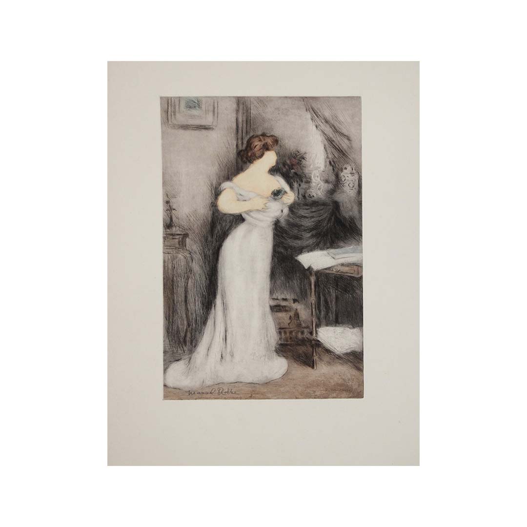 Dans cette scène d'intérieur intimiste, une jeune femme vêtue d'une élégante robe blanche serre délicatement un petit bouquet de violettes contre sa poitrine. La lumière tamisée, les draperies luxueuses et le mobilier légèrement opulent instaurent une atmosphère de nostalgie poétique. Robbe utilise l'aquatinte – une technique qu'il maîtrisait avec une finesse exceptionnelle – pour obtenir de subtiles transitions tonales, tandis que des touches de couleur dynamisent la scène, notamment les violettes.