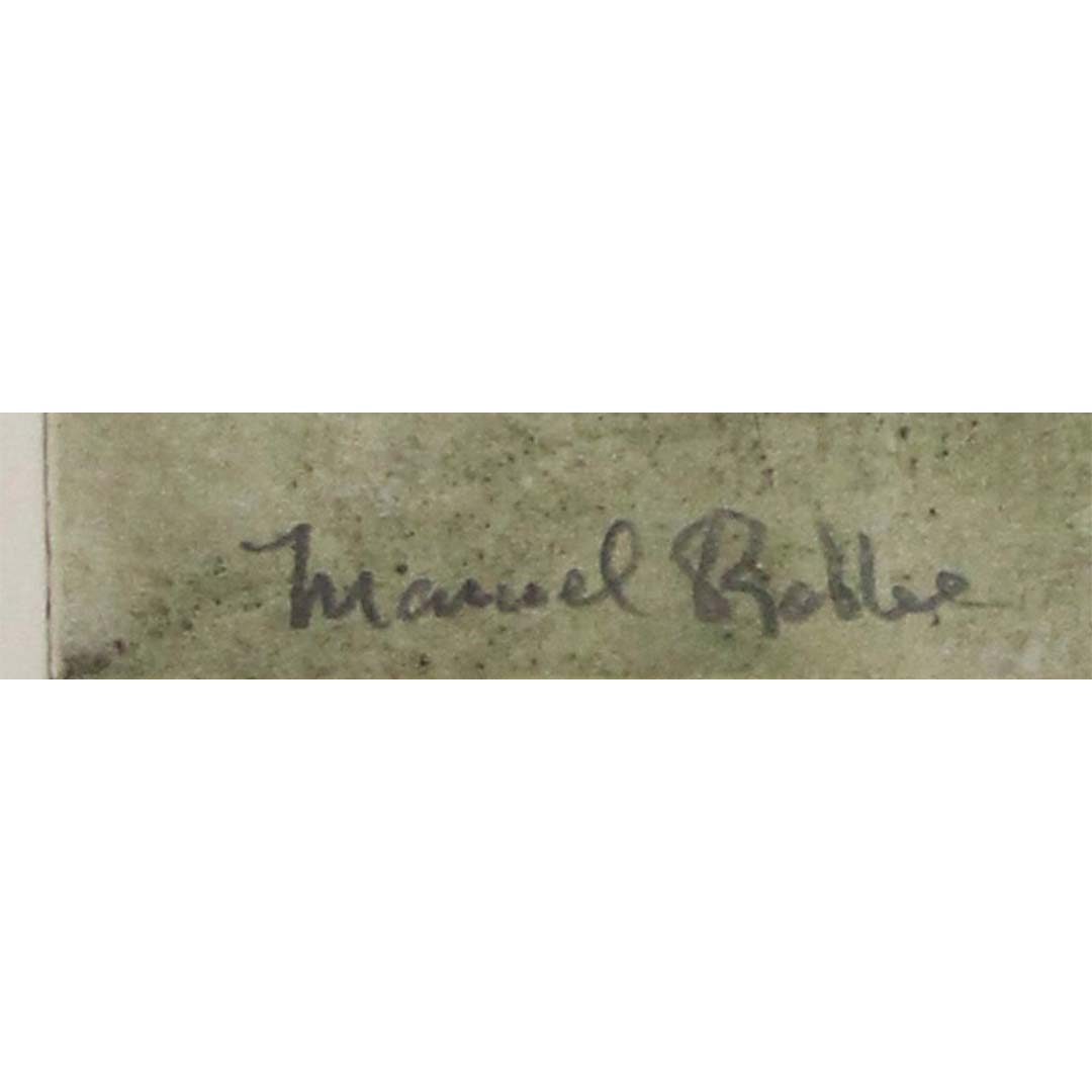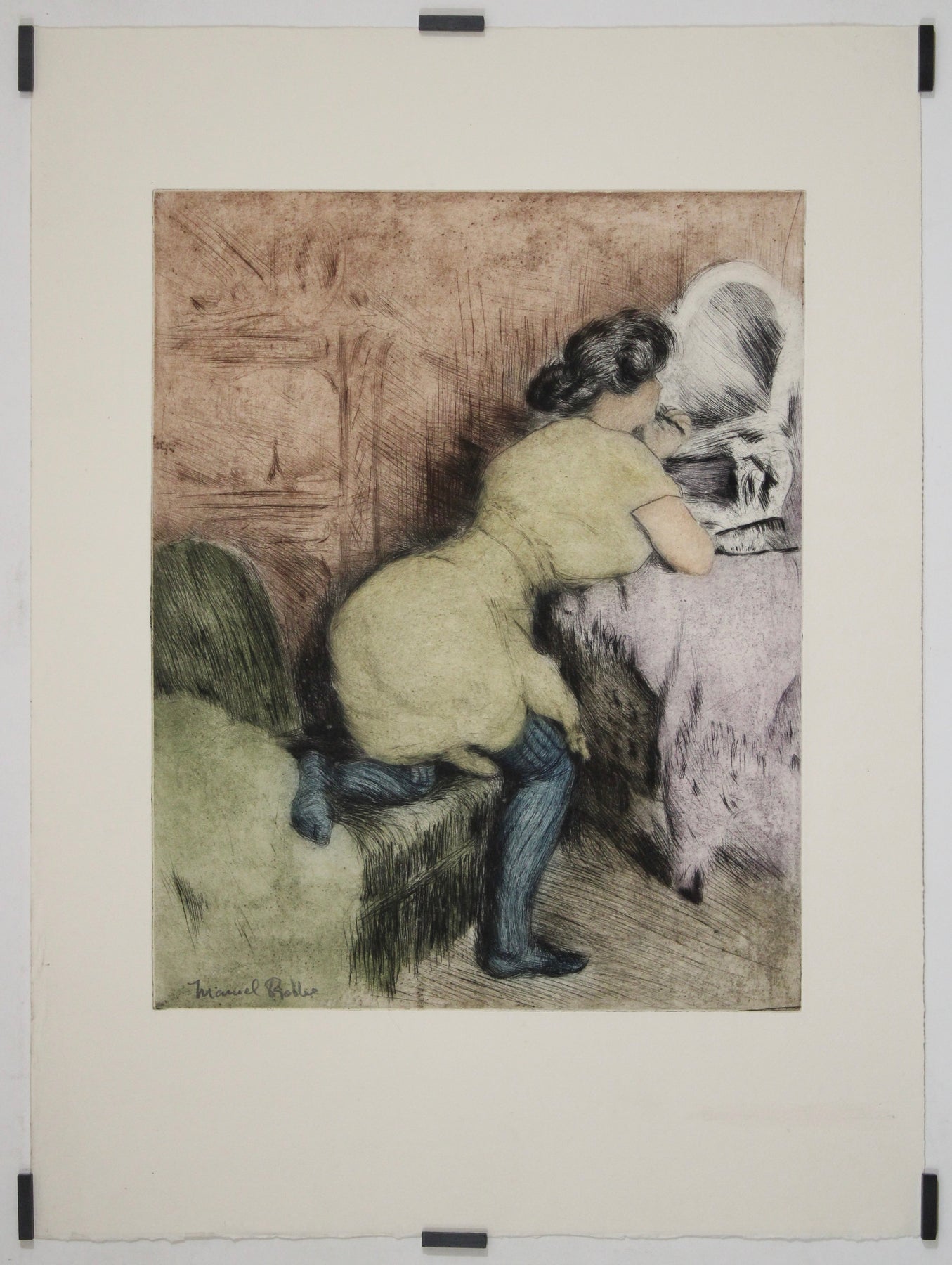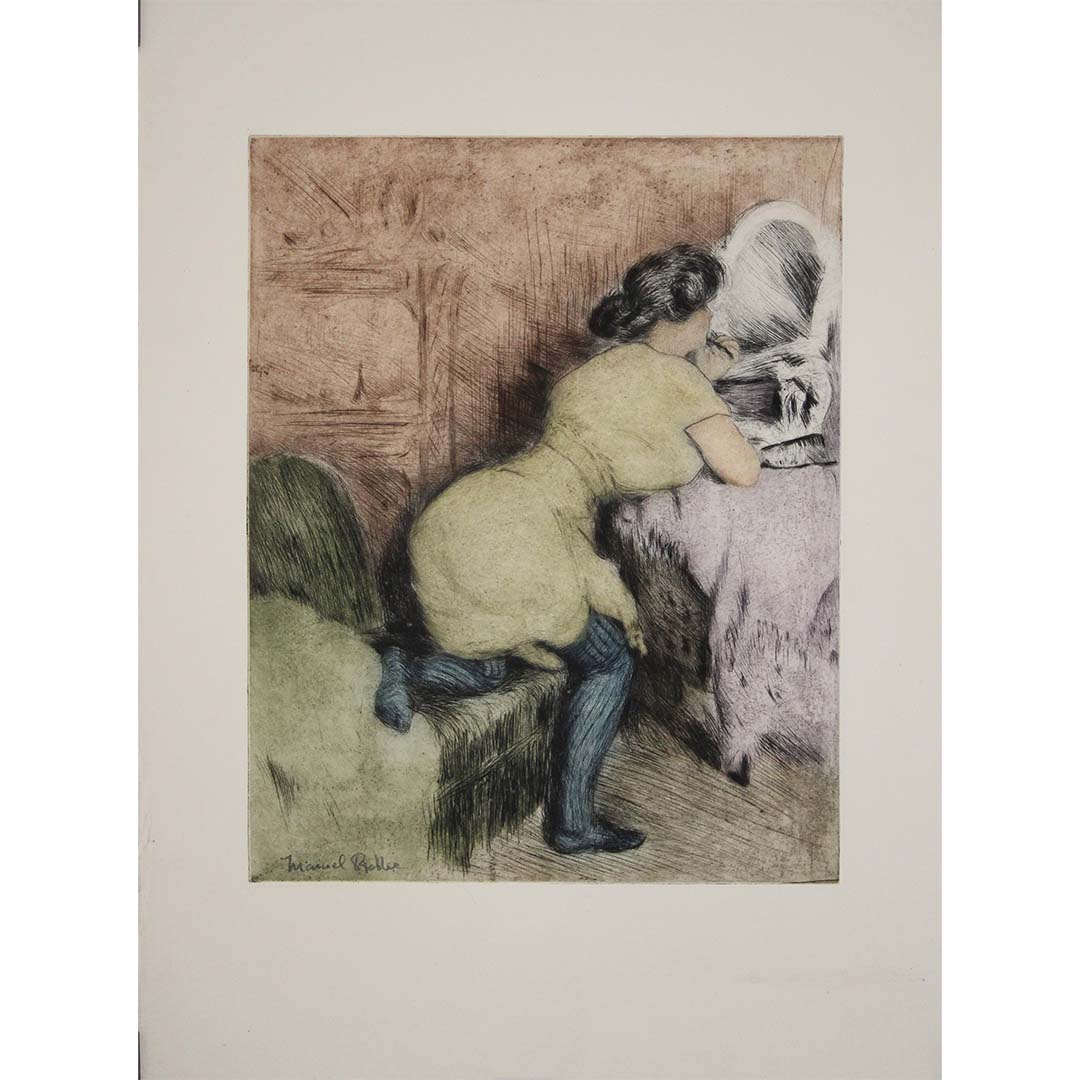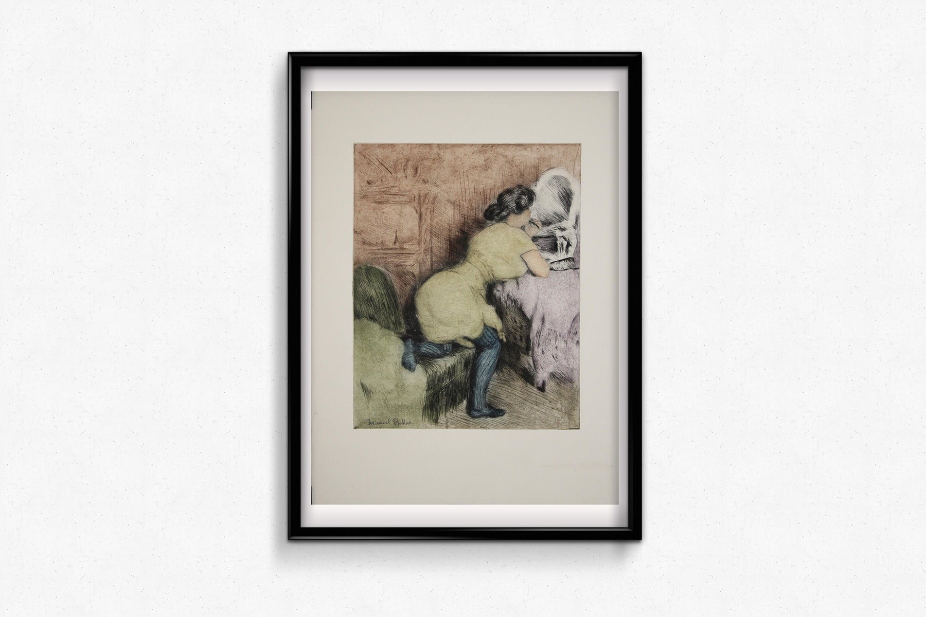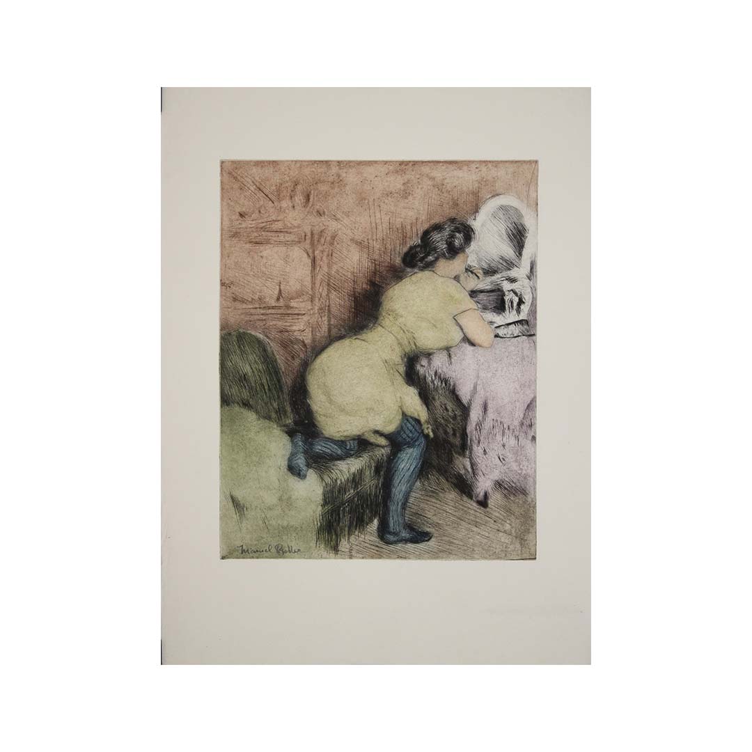 Dans « Le Maquillage » (1904), l'artiste français Manuel Robbe saisit un moment intime, presque voyeuriste, de beauté quotidienne : une jeune femme penchée vers son miroir, absorbée par le rituel du maquillage. Cette scène intime est rendue à l'aquatinte et à l'eau-forte, techniques que Robbe maîtrisait à la perfection pour obtenir des textures riches et des couleurs nuancées.