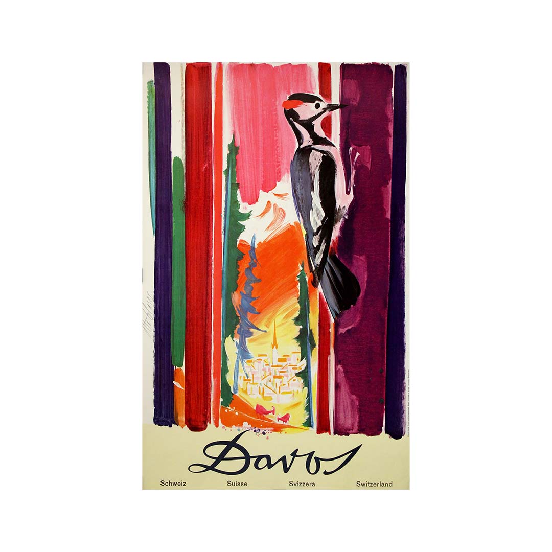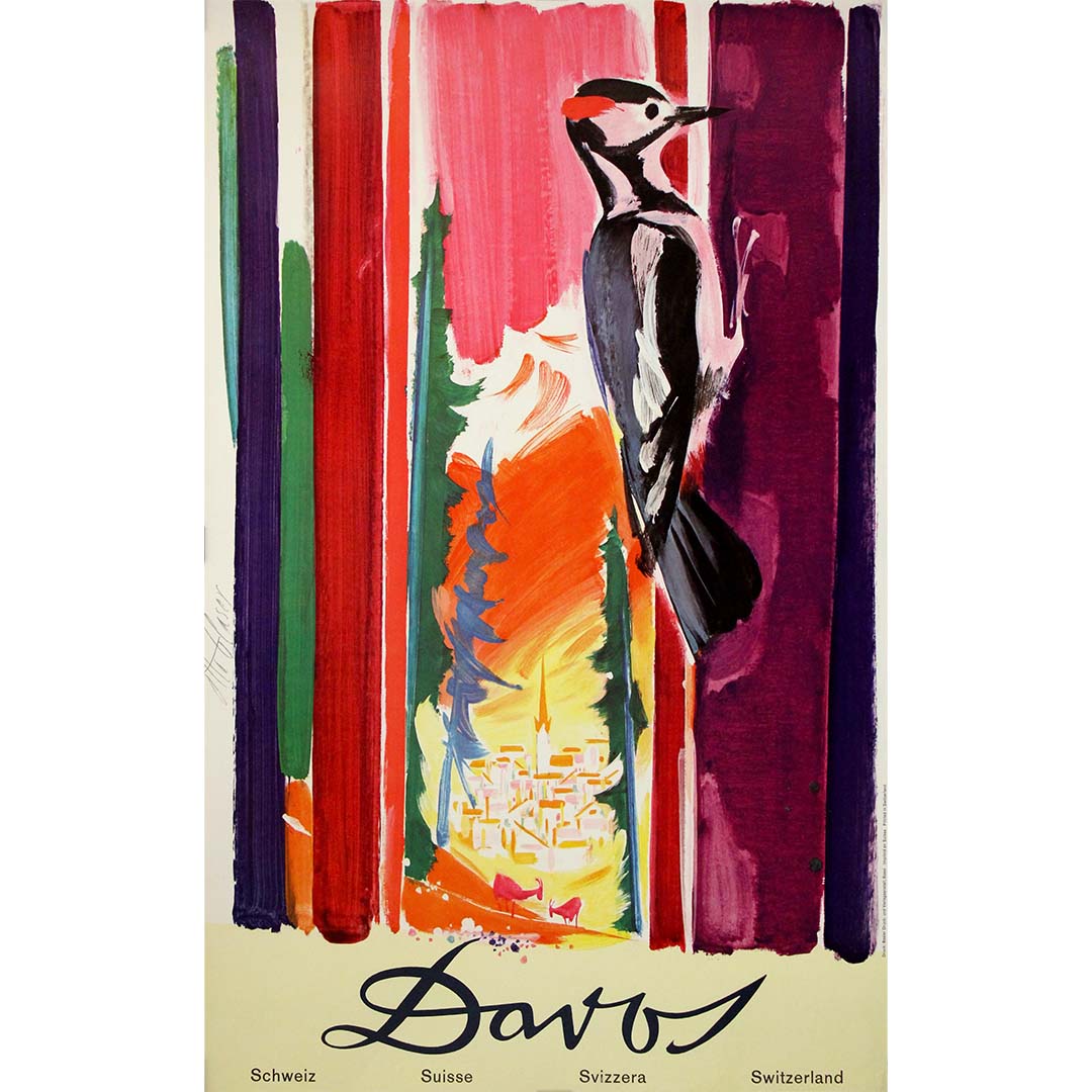 Today, this work stands as both a collectible travel poster and a refined example of Swiss modern graphic art, where expressive color, simplified form, and poetic imagery transform Davos into a visual emblem of alpine vitality.
