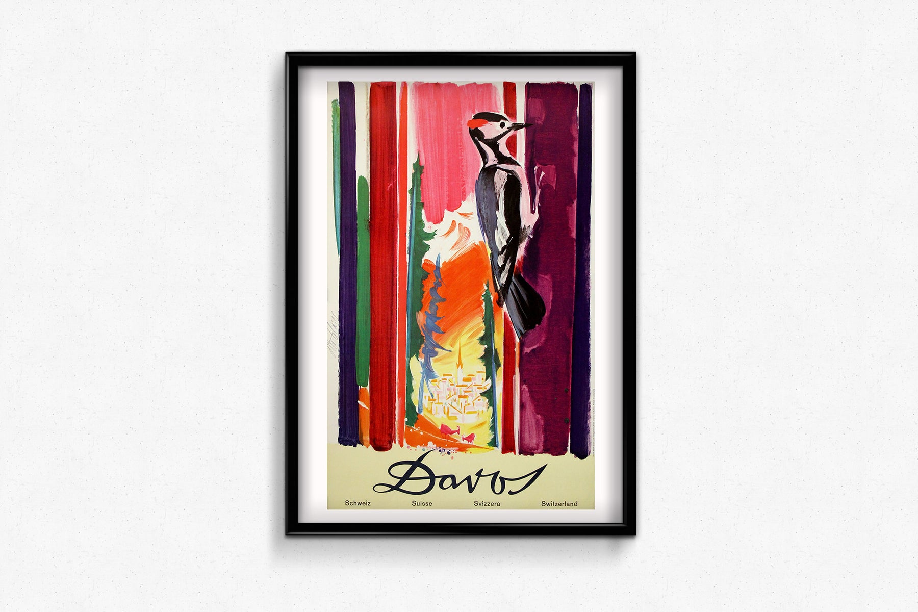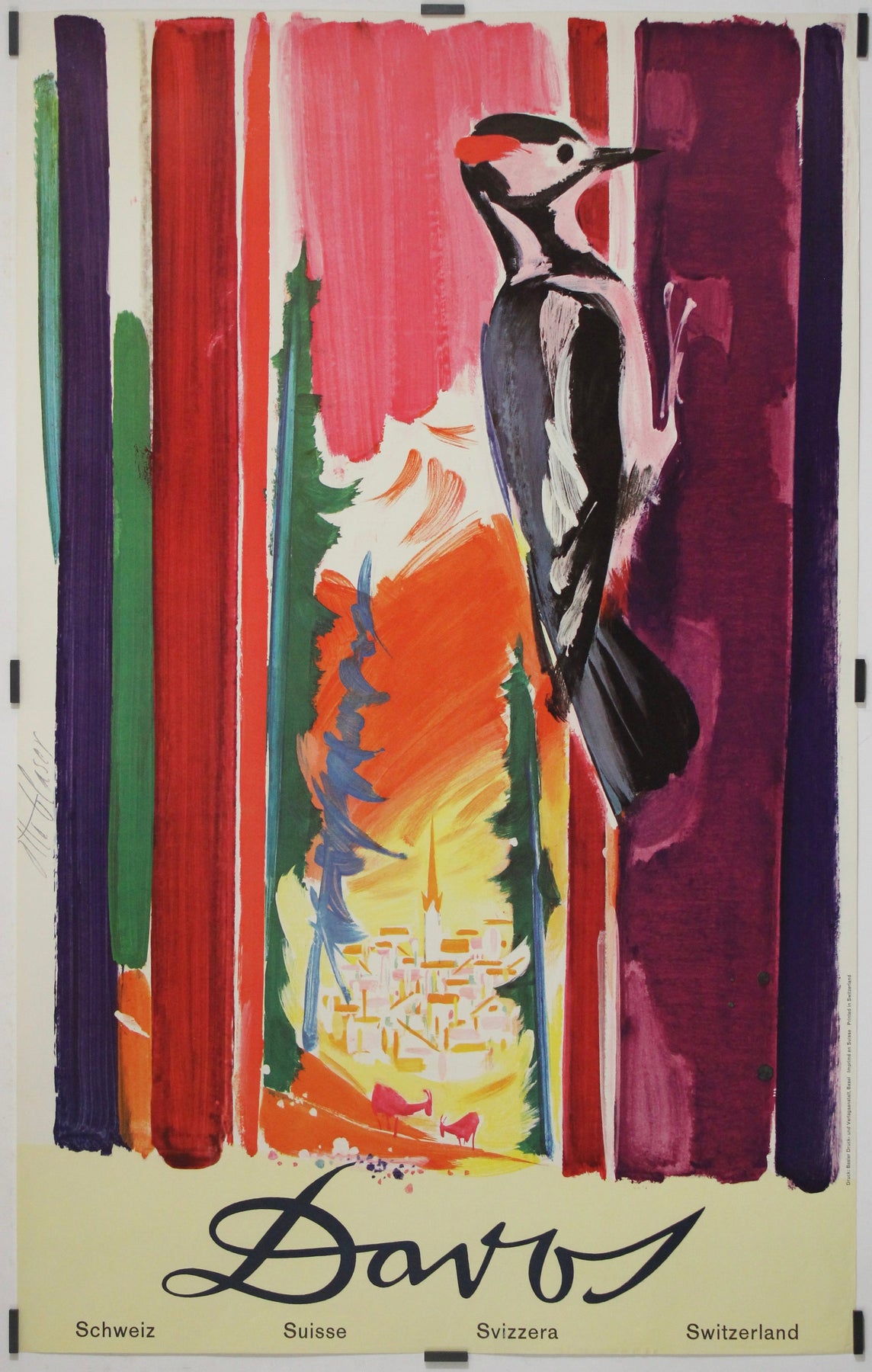 Rather than depicting a conventional landscape, Glaser constructs the scene through expressive color fields—deep purples, reds, greens, and blues—that evoke towering forest trunks and alpine depth. At the center, a glowing valley opens onto a stylized vision of Davos itself, bathed in warm yellows and oranges, suggesting sunlight, altitude, and clean mountain air. The bird, both sentinel and emblem, introduces a sense of scale and serenity, embodying harmony between nature and human settlement.