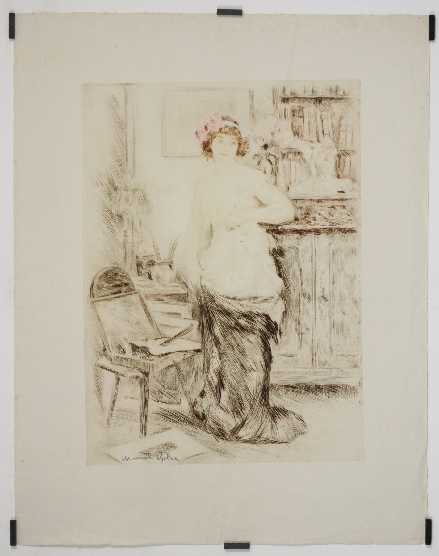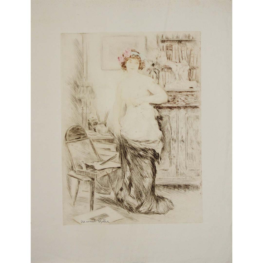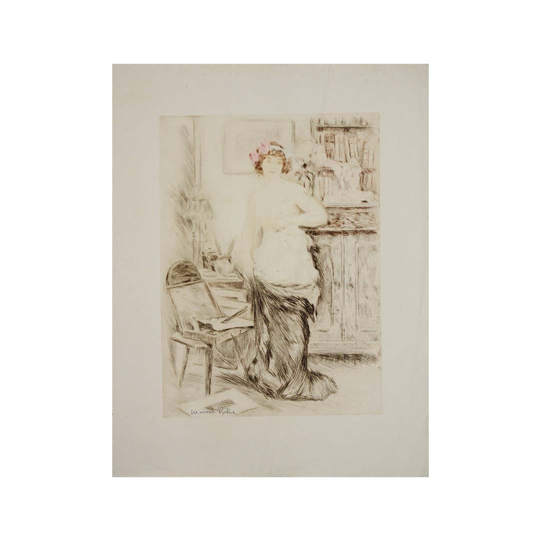 Avec La Jupe Ôtée (1906), Manuel Robbe saisit une fois encore la frontière subtile entre pudeur et sensualité, un thème récurrent dans ses célèbres estampes de la Belle Époque. Le titre, qui signifie « La jupe ôtée » , révèle un instant suspendu dans le temps : une femme, à demi dévêtue, se tient debout dans un intérieur intime et chaleureux, entre repos et rituel.
