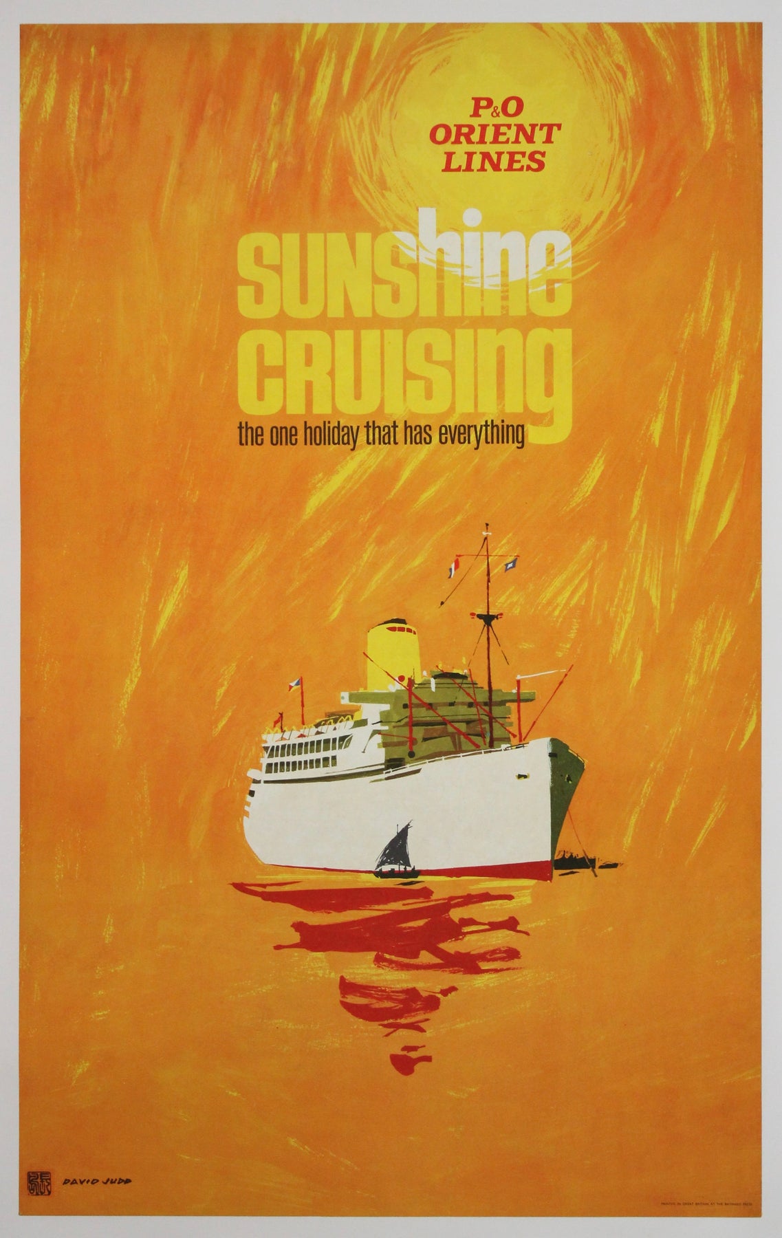 Rayonnante de chaleur et d'optimisme, cette affiche de voyage originale de 1955 pour P&O Orient Lines incarne à la perfection le charme graphique du milieu du XXe siècle et l'âge d'or des croisières de luxe. Créée par le designer britannique David Judd , elle invite à une escapade en haute mer, où le soleil brille toujours et où vous attendent des vacances de rêve.