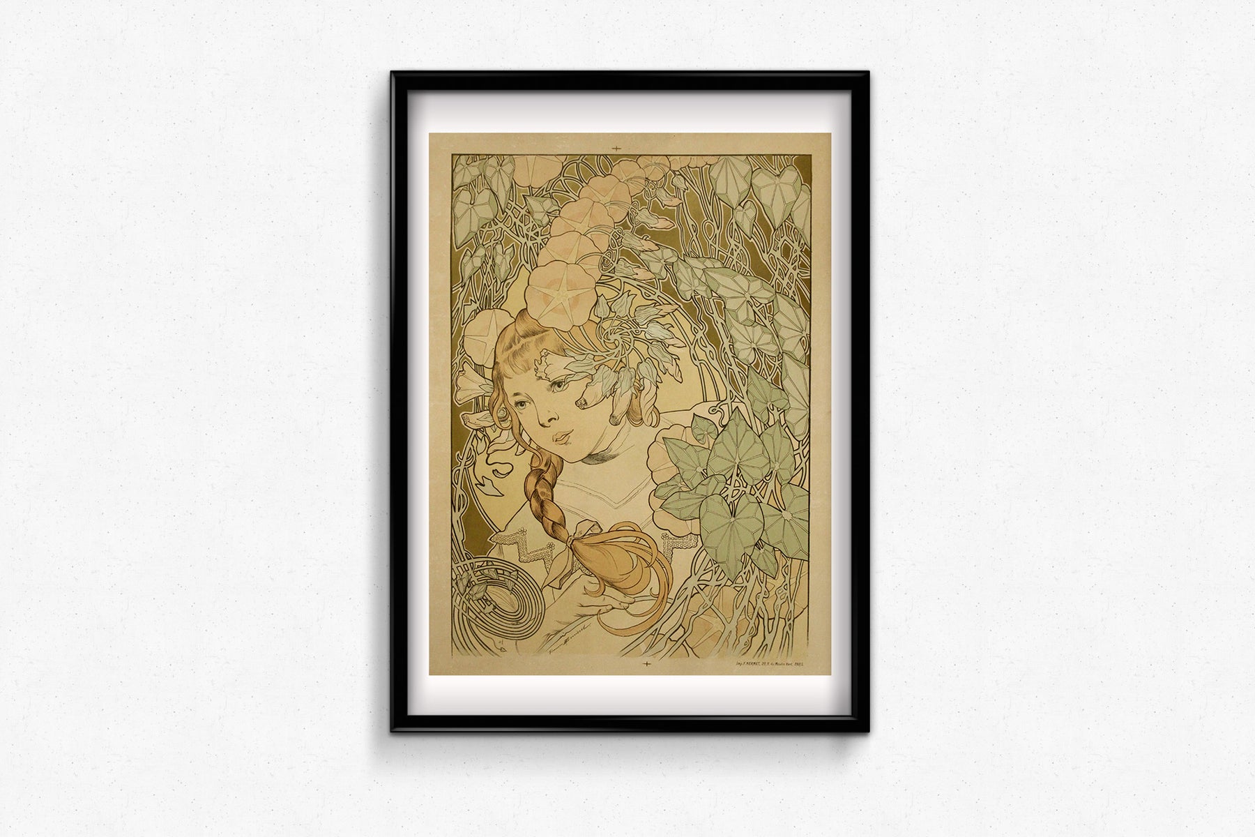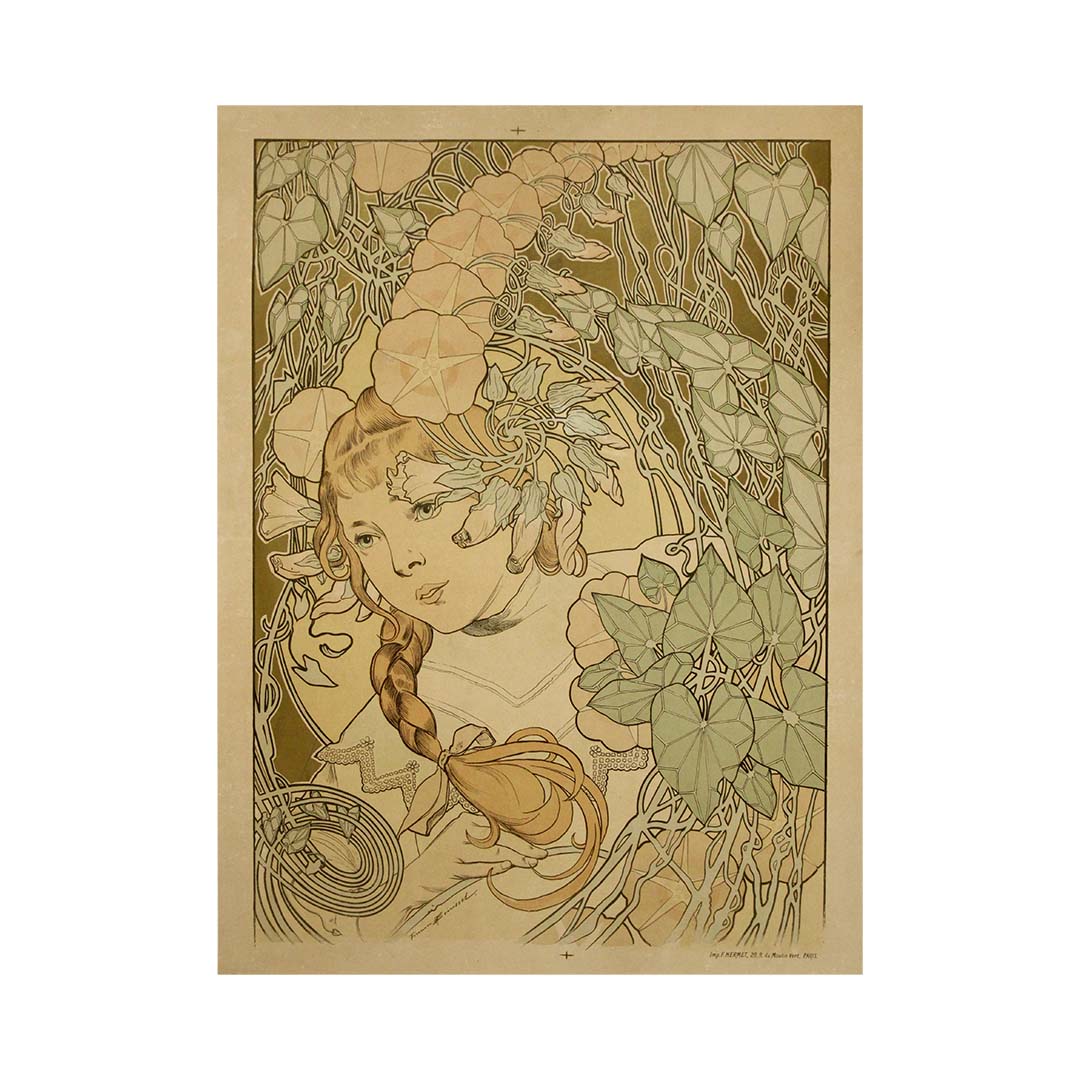 Le visage de la jeune fille, expressif et serein, est auréolé d'un halo onirique, entouré de lierre onirique et de fleurs de liseron stylisées. Son regard pensif et ses lèvres légèrement entrouvertes confèrent à l'image une intimité contemplative. Chaque ligne du feuillage est une étude de rythme décoratif : les lianes s'entrelacent avec une grâce lyrique qui évoque les vitraux ou les manuscrits enluminés.