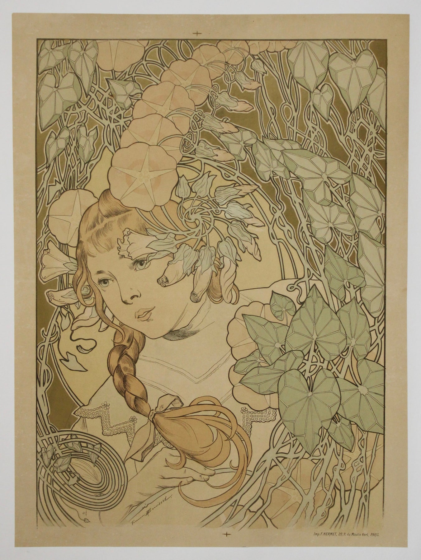 Cette affiche originale de Firmin Bouisset, datant d'environ 1900 et intitulée « Jeune fille à la tresse dans un décor de feuillages » , est un exemple délicat et enchanteur des débuts de l'Art nouveau. Elle représente une jeune fille aux longs cheveux tressés, délicatement encadrée par un agencement complexe de vignes fleuries et de vrilles. La composition célèbre l'élégance naturelle et l'innocence de la jeunesse, rendues dans une palette de verts sourds, d'ocres doux et de roses subtils qui évoquent à merveille la fluidité organique caractéristique du style Art nouveau.
