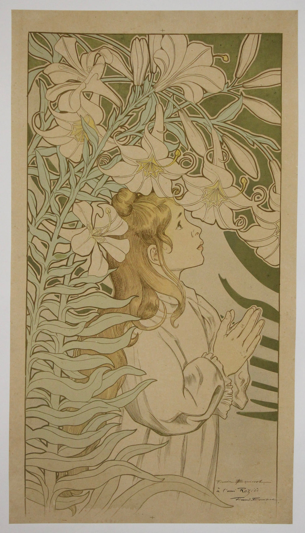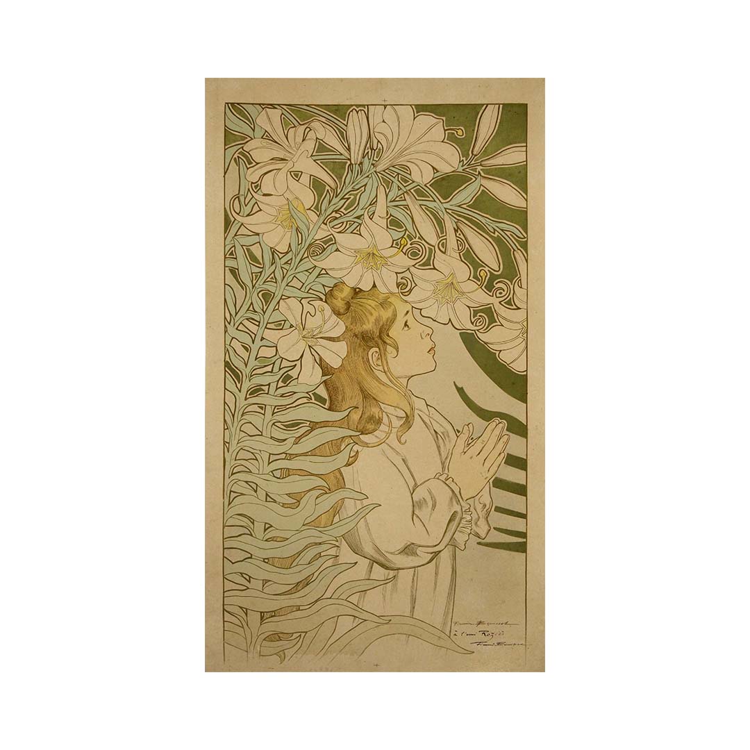 Cette exquise affiche Art nouveau de Firmin Bouisset — surtout connu pour ses iconographies publicitaires — révèle une facette tendre et introspective de son œuvre. Intitulée Jeune fille dans un décor de feuillages , la composition met en scène une jeune fille en prière, délicatement enveloppée par une symphonie de formes organiques : des lys blancs et des feuilles tourbillonnantes aux tons verts et ocres feutrés, qui font subtilement écho à l’innocence et à la pureté de l’enfant.