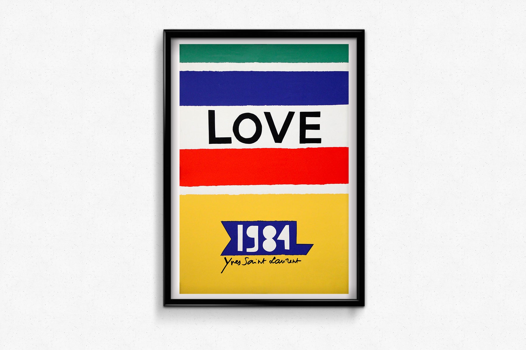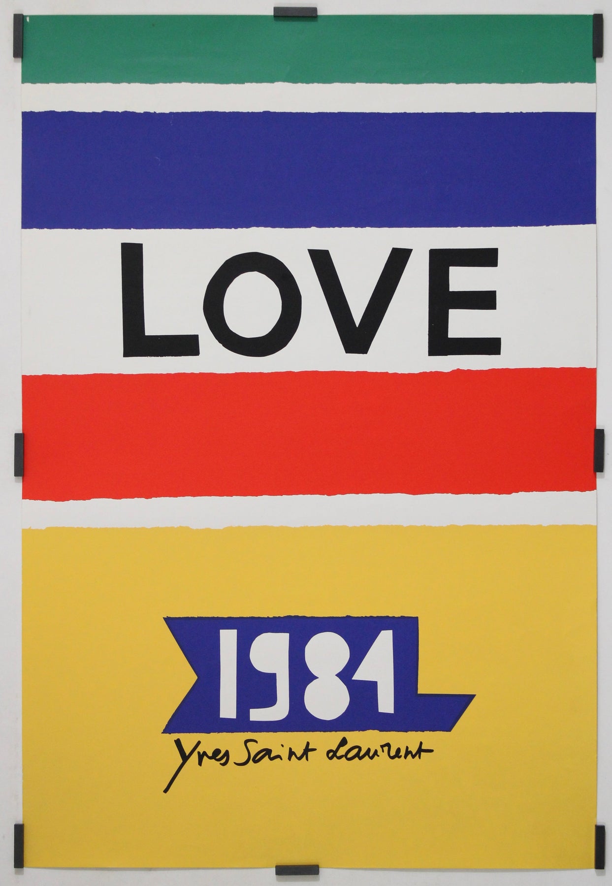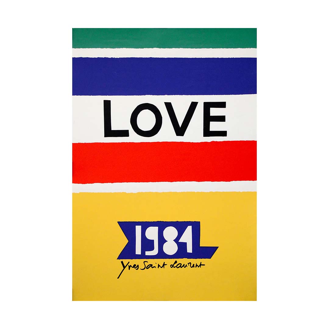 This vibrant “LOVE” poster by Yves Saint Laurent belongs to a joyful and highly recognizable series created by the couturier from the 1980s through the 1990s. Conceived not as a fashion advertisement but as an independent graphic work, this image was published as an annual visual and often distributed as a New Year’s greeting, exhibition graphic, or collectible print, reflecting Saint Laurent’s lifelong passion for art, color, and graphic design.