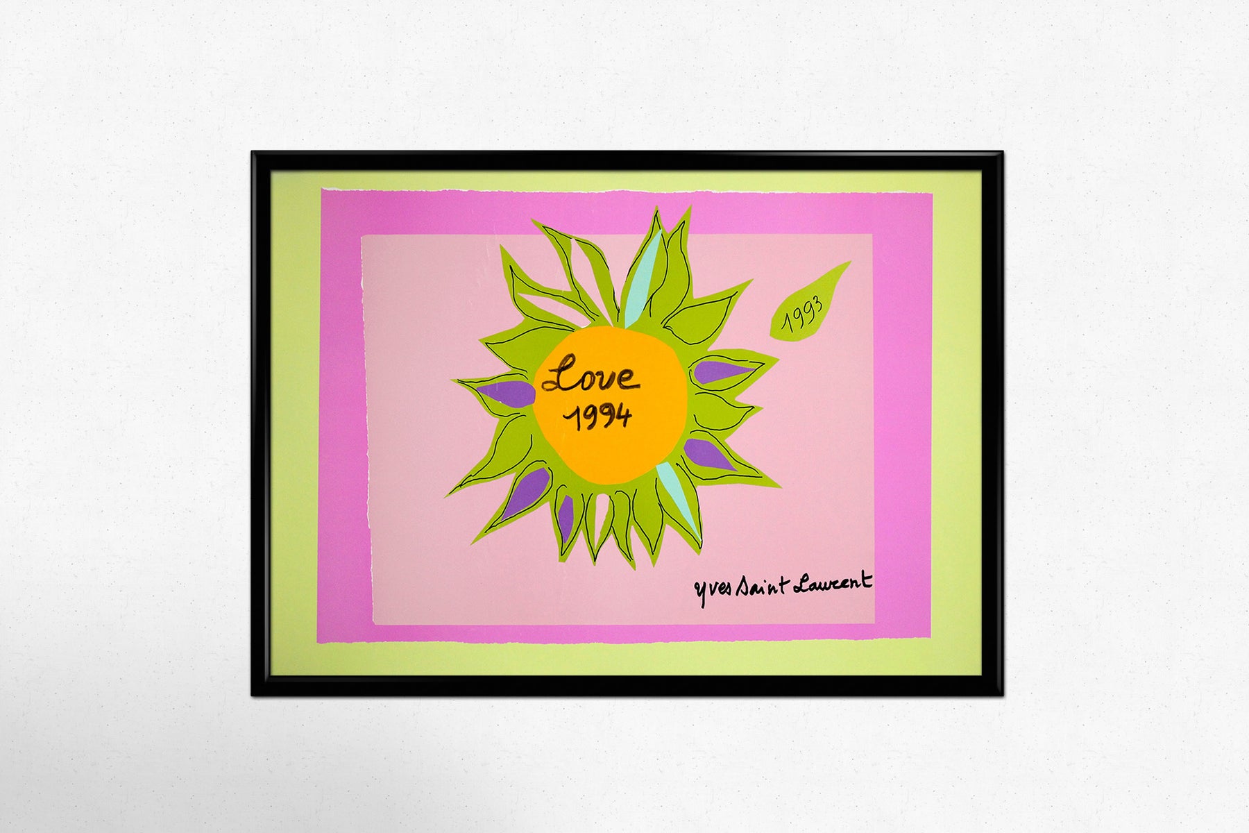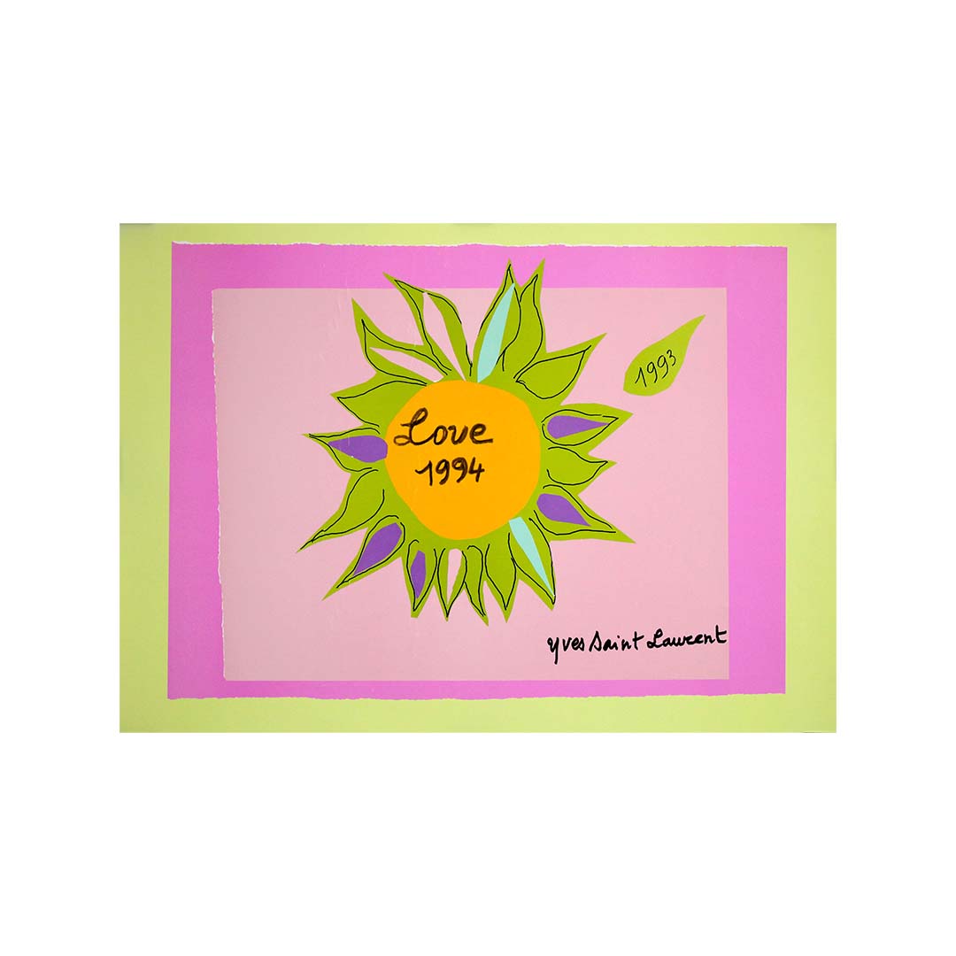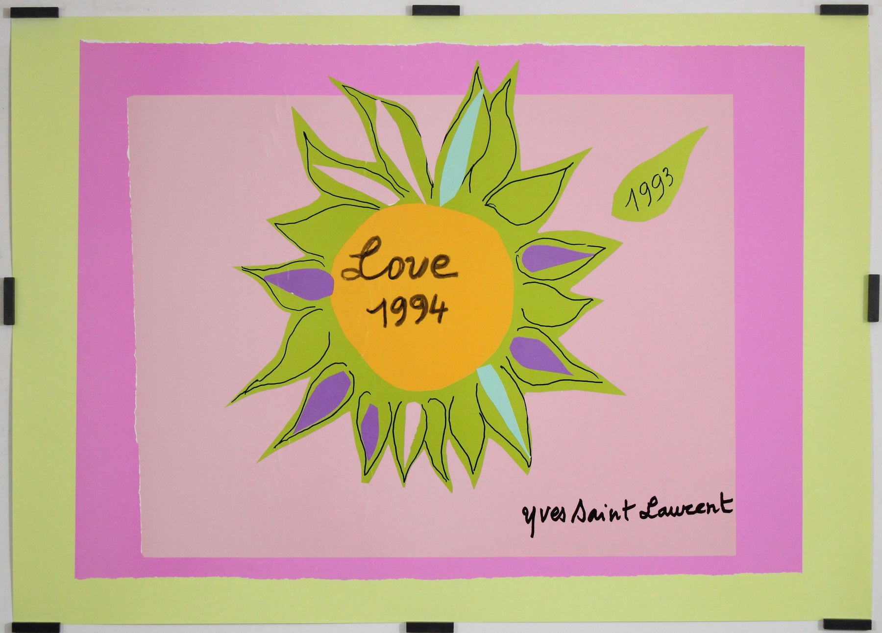 This vibrant “LOVE” poster by Yves Saint Laurent belongs to a joyful and highly recognizable series created by the couturier from the 1980s through the 1990s. Conceived not as a fashion advertisement but as an independent graphic work, this image was published as an annual visual and often distributed as a New Year’s greeting, exhibition graphic, or collectible print, reflecting Saint Laurent’s lifelong passion for art, color, and graphic design.