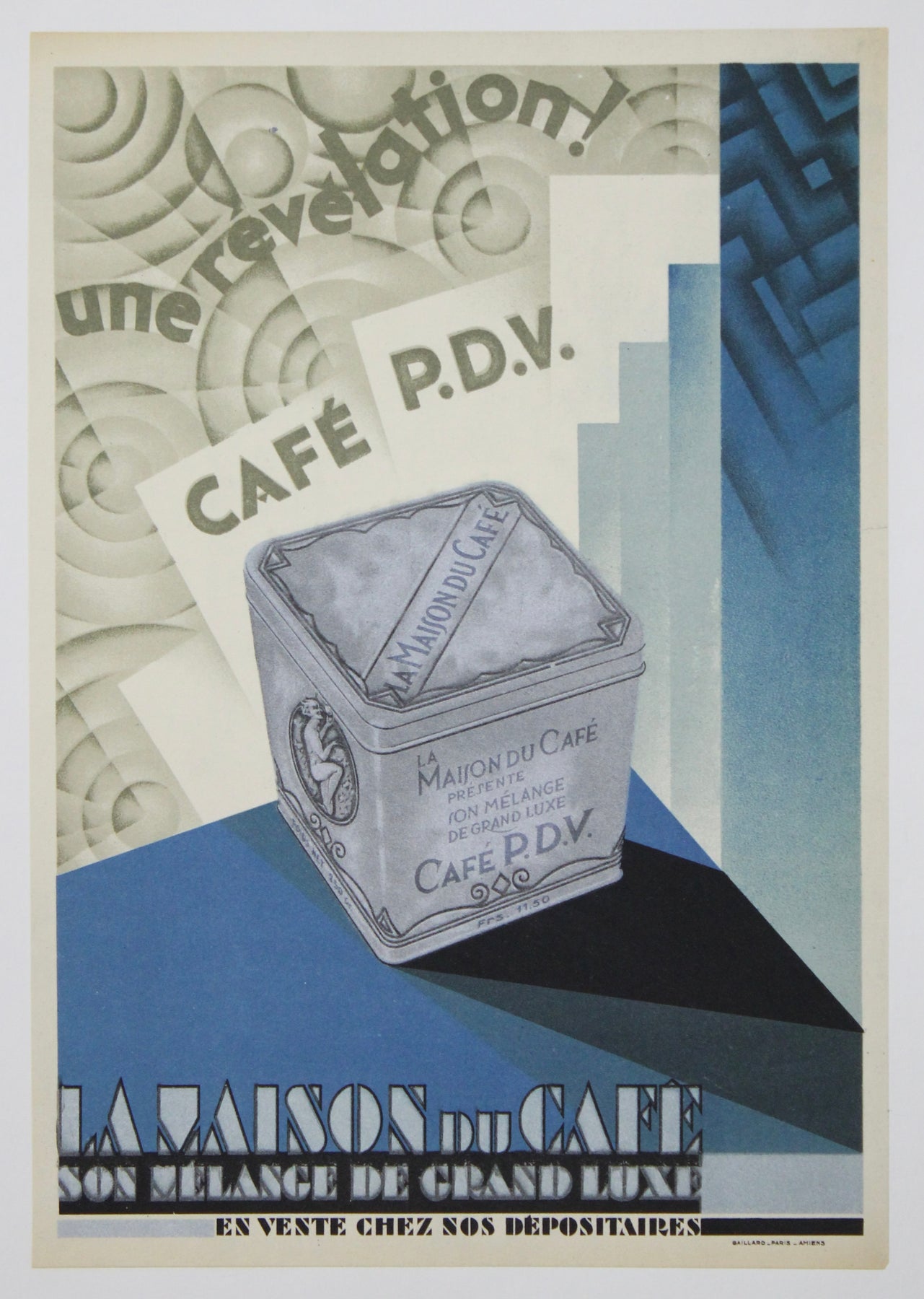 Dans les années 1930, les affiches étaient un puissant outil publicitaire, exploitant le talent artistique pour influencer le comportement des consommateurs. Cette affiche du Café PDV ne fait pas exception, utilisant l'art pour créer un lien émotionnel avec le spectateur. L'image suggère que choisir le Café PDV, c'est opter pour une expérience café d'exception, synonyme de confort, de plaisir et d'une touche d'élégance dans chaque tasse.