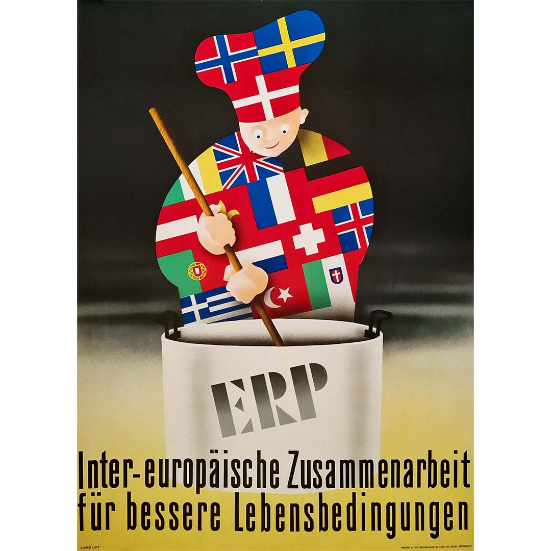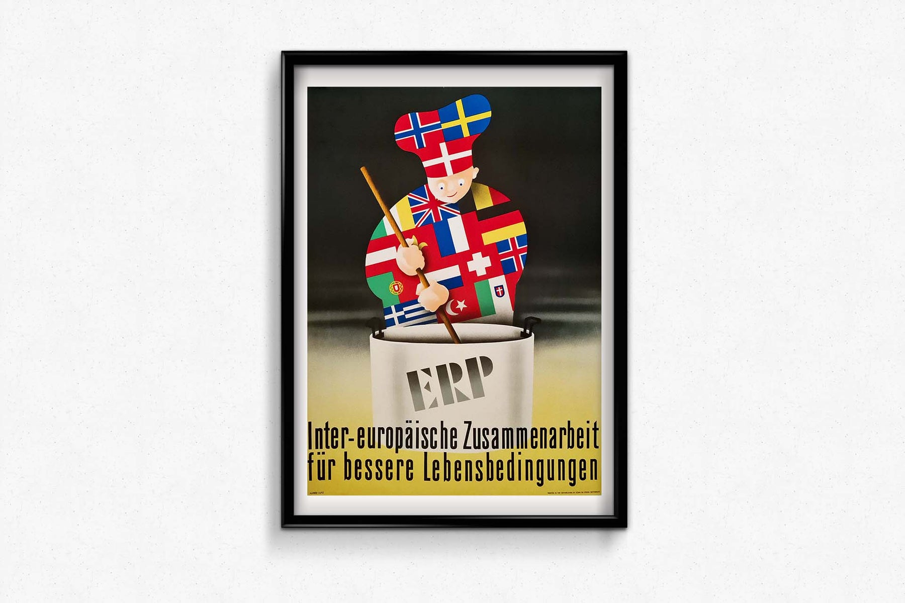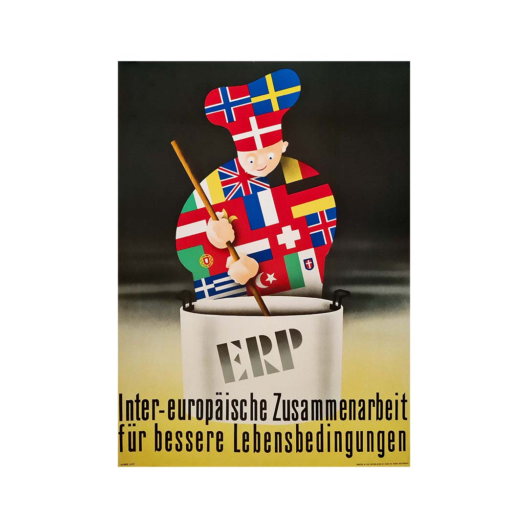 Affiche originale du Programme européen de réunification (ERP), intitulé « Inter-europaische Zusammenarbeit für bessere Lebenbedingungen », soit « Collaboration intereuropéenne pour de meilleures conditions de vie ». Le Programme européen de rétablissement (ERP), plus tard connu sous le nom de plan Marshall, était un programme américain destiné à relancer les économies européennes après la Seconde Guerre mondiale. Les entreprises allemandes bénéficiaires de l'ERP devaient rembourser l'État allemand, qui prêtait ensuite les fonds à d'autres entreprises. Ce processus se poursuit aujourd'hui par le biais de la banque publique KfW, qui finance plusieurs programmes – les « programmes ERP » – grâce aux actifs spécifiques de l'ERP.