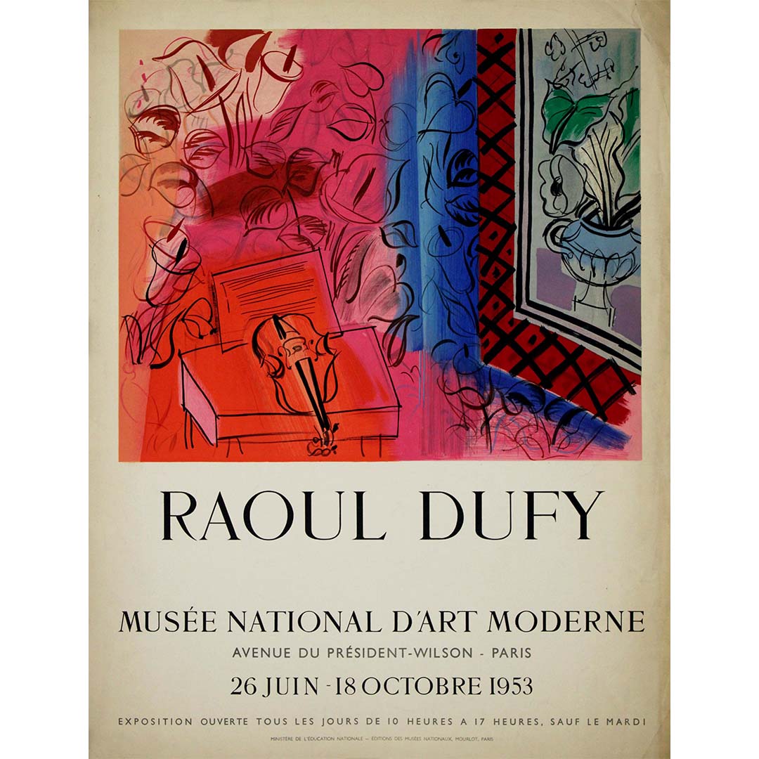 L'affiche originale de l'exposition de 1953, conçue par Raoul Dufy pour le Musée National d'Art Moderne, est une œuvre vibrante et captivante qui saisit l'essence du style emblématique de Dufy et célèbre l'art moderne. Réputé pour ses compositions colorées et dynamiques, Dufy fut une figure majeure du monde de l'art au début du XXe siècle, reconnu pour son mélange unique de fauvisme et de cubisme.