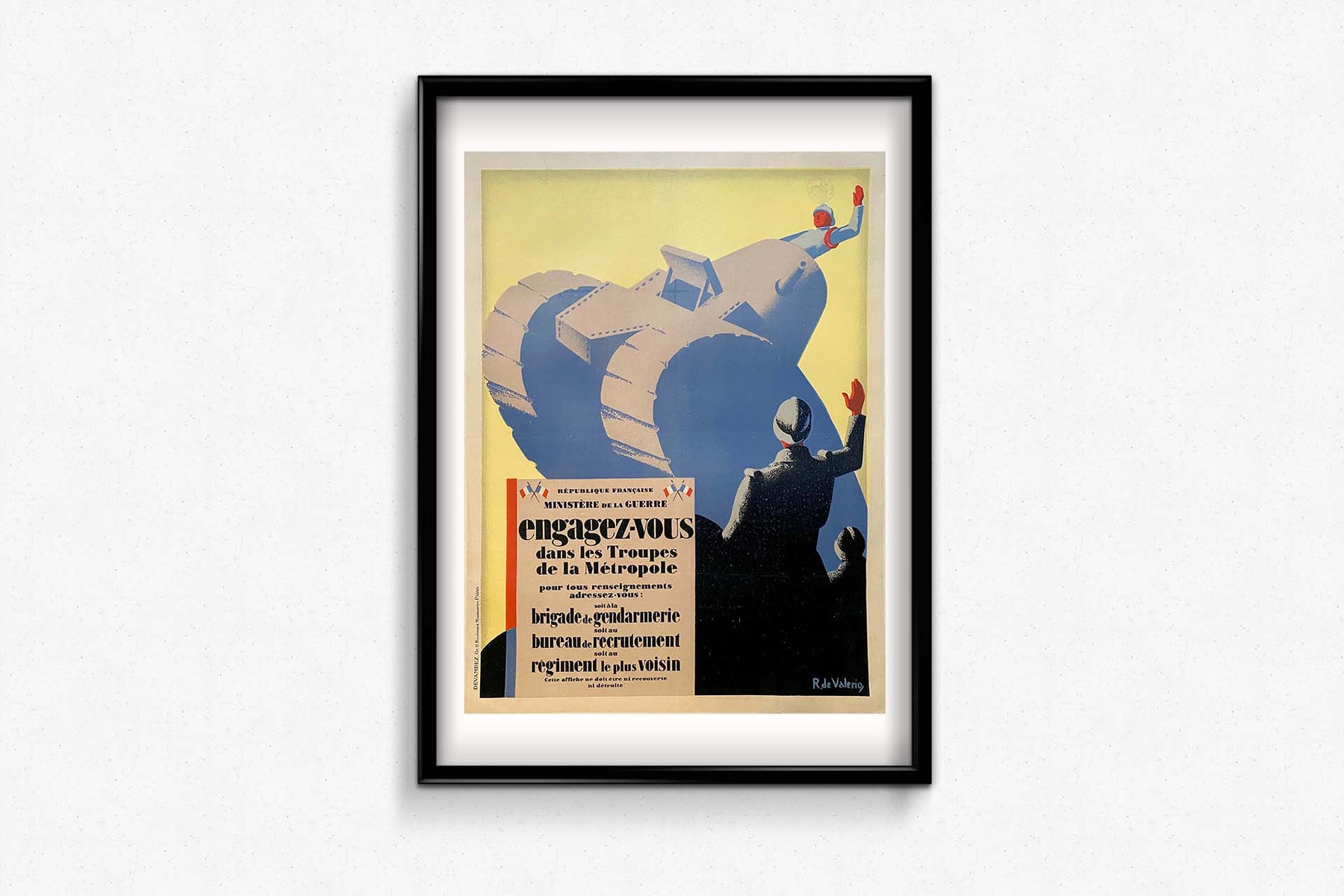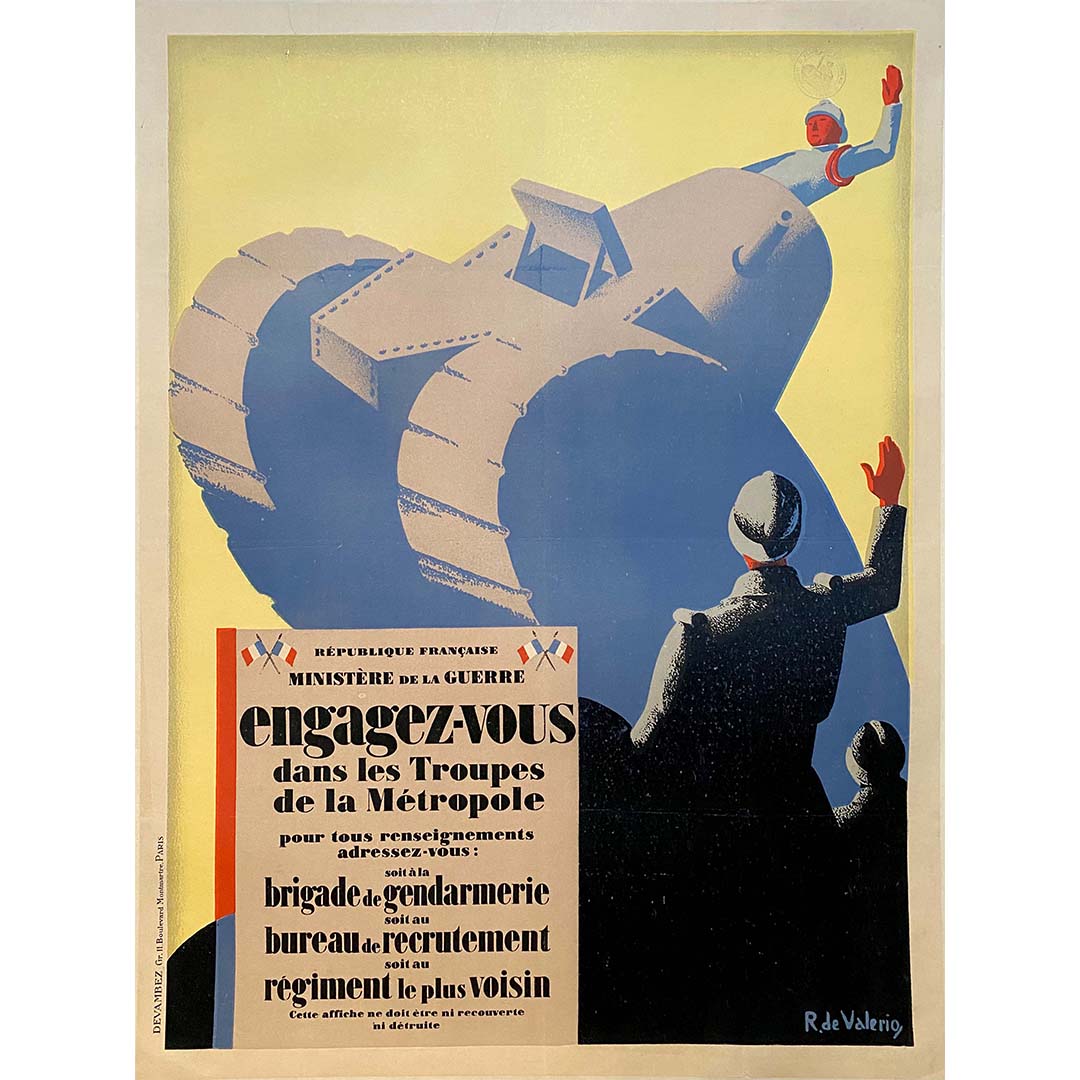 Cette affiche a été réalisée en 1916 pour le ministère de la Guerre ; elle montre un soldat saluant un autre soldat dont le buste sort de la tourelle d'un char de l'usine Renault, accompagnée de la formule « Rejoignez les troupes de la Métropole ».