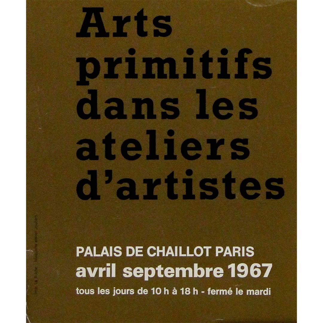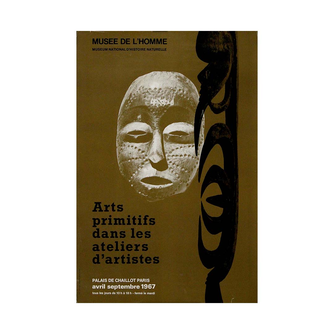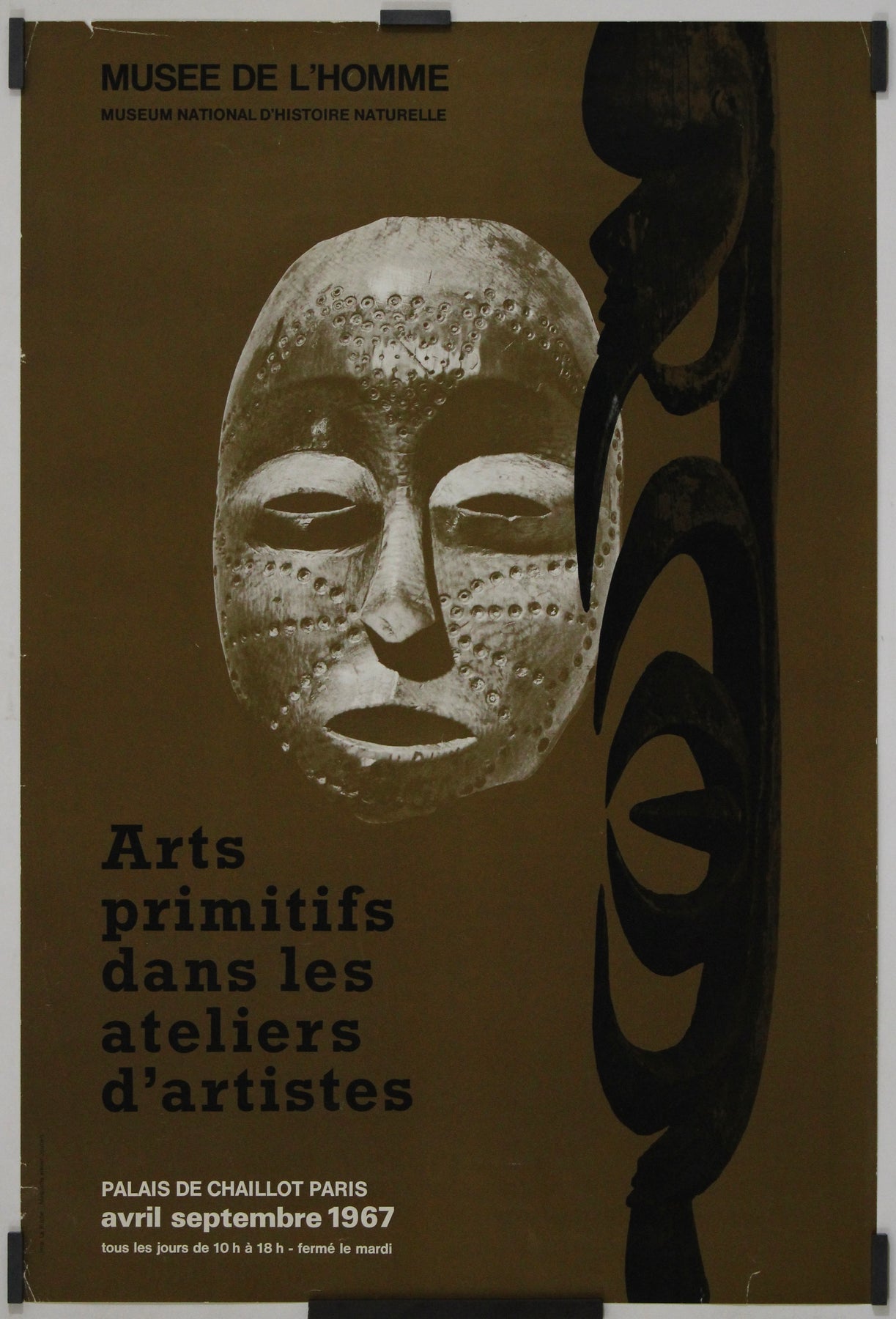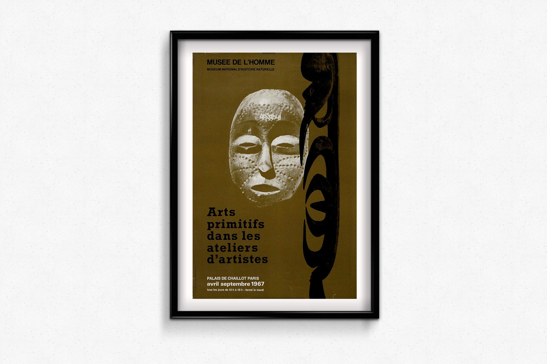Cette affiche originale de 1967, conçue par l'Atelier Joubert, a été créée pour l'exposition « Arts Primitifs dans les Ateliers d'Artistes » au Musée de l'Homme, situé au Palais de Chaillot à Paris. L'exposition explorait l'influence des arts africains, océaniens et indigènes sur les artistes européens modernes, notamment au sein des mouvements d'avant-garde du XXe siècle.