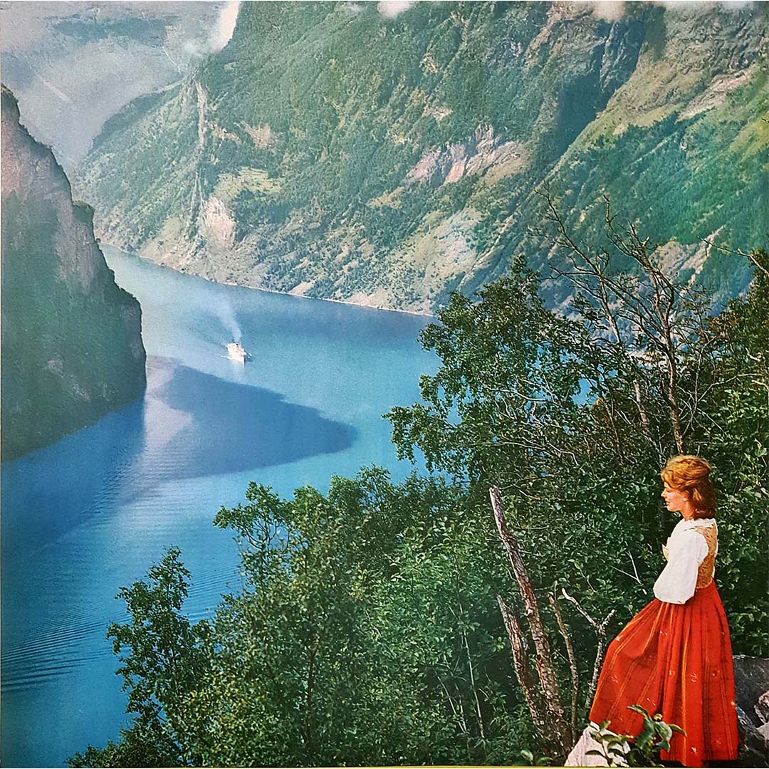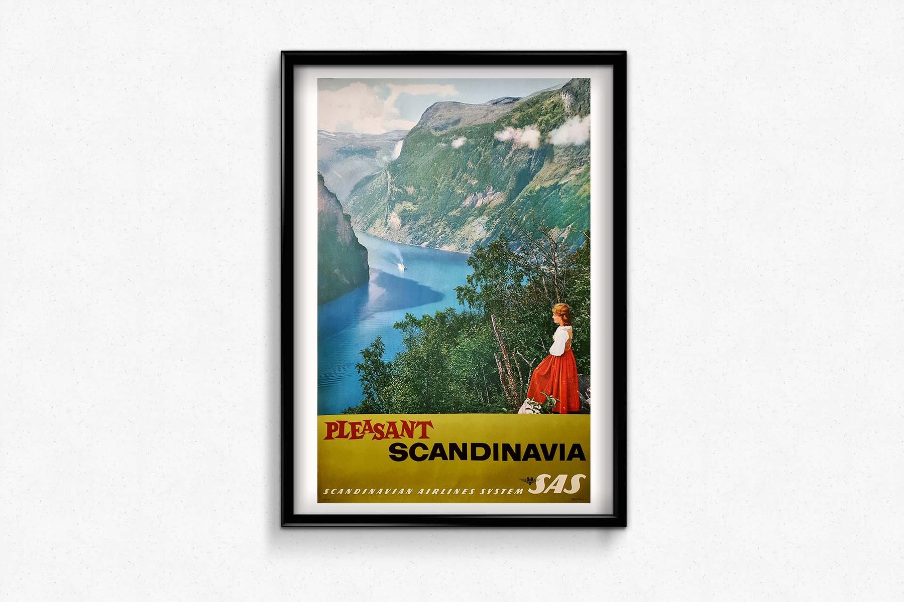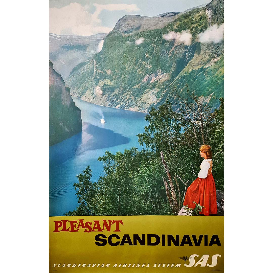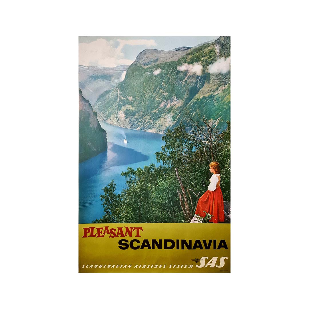 Belle affiche de la compagnie aérienne SAS (Scandinavian Airlines System) avec une belle photo du Geirangerfjord en Norvège.