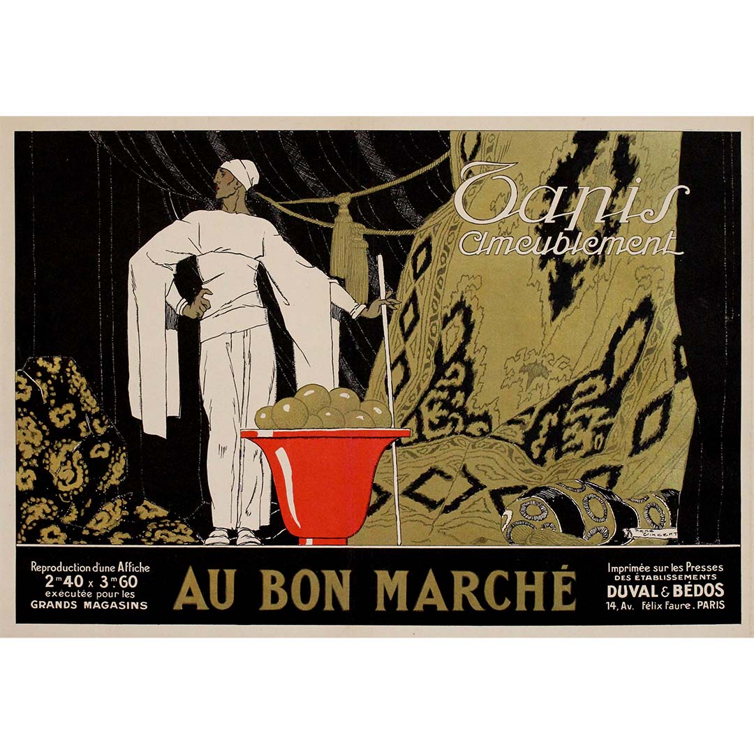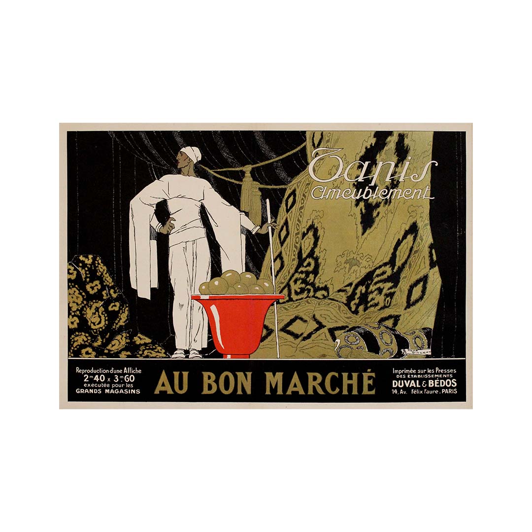 Cette affiche a été commandée par Au Bon Marché, l'un des premiers grands magasins parisiens, qui a joué un rôle clé dans la révolution du commerce de détail et de la culture de consommation à la fin du XIXe et au début du XXe siècle. En tant que support publicitaire, elle reflète à la fois le faste de la décoration intérieure de l'époque et l'influence croissante du graphisme dans le marketing du luxe.