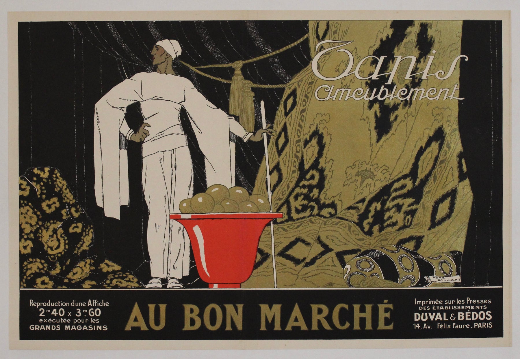 Cette affiche originale de René Vincent, datant d'environ 1930, a été conçue pour promouvoir le tapis d'ameublement au prestigieux grand magasin Au Bon Marché à Paris. Reflet de l'élégance raffinée et des tendances décoratives du début de l'Art déco, elle témoigne du style sophistiqué de Vincent, qui mêle illustration de mode, composition graphique audacieuse et esthétique luxueuse.