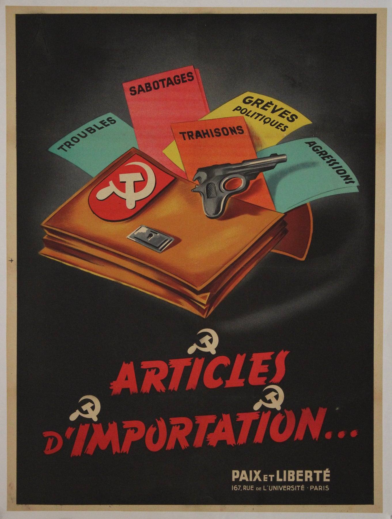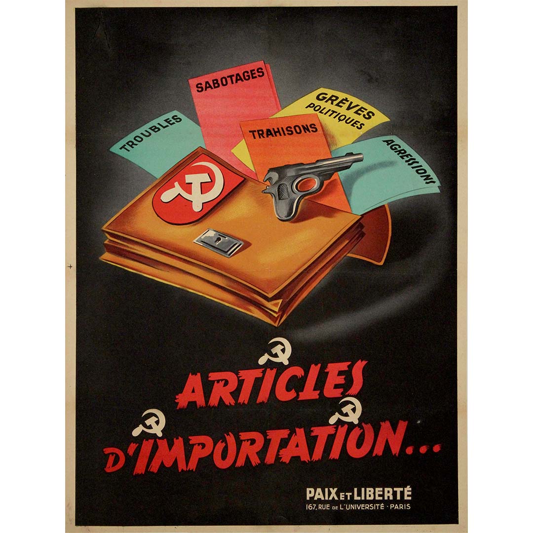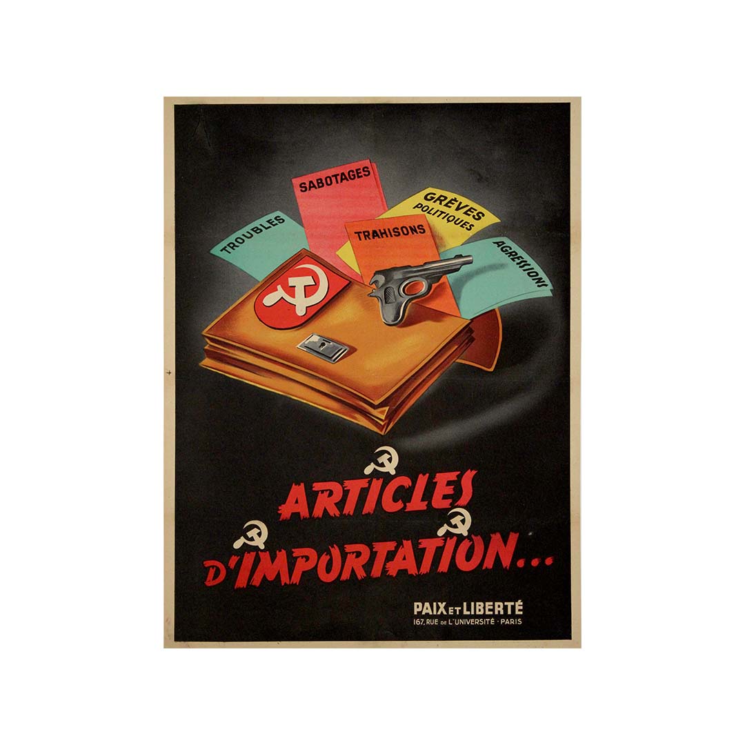 Prix régulier €750,00Cette affiche originale, audacieuse et saisissante, intitulée « Articles d'importation… », a été produite vers 1950 par l'organisation anticommuniste française Paix et Liberté. Elle constitue un témoignage marquant de la propagande de la Guerre froide, emblématique de la lutte idéologique qui s'est déroulée en Europe après la guerre entre le capitalisme démocratique et le communisme soutenu par l'Union soviétique.