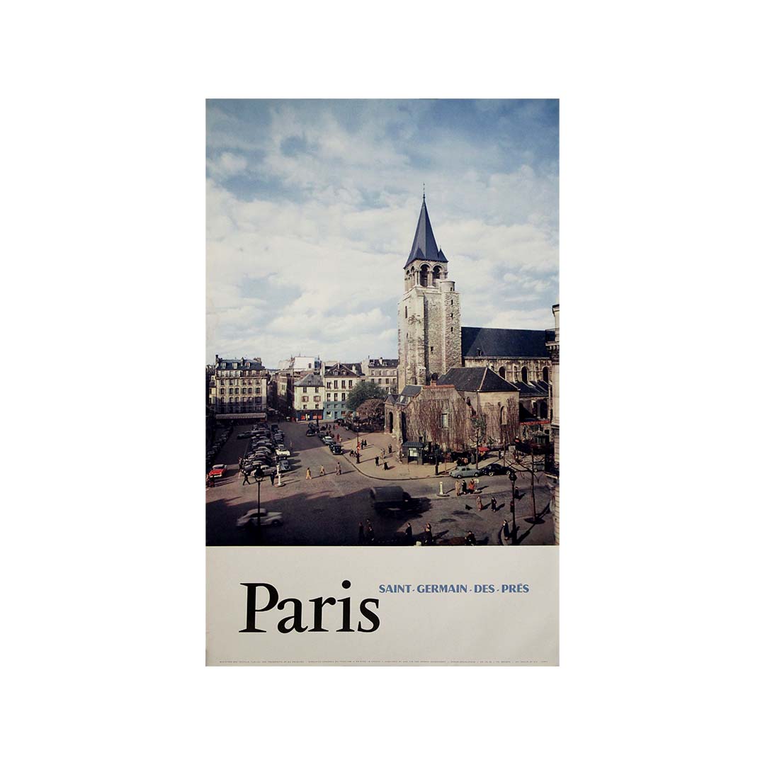 Cette affiche touristique originale de 1958, photographiée par Delmas, capture l'esprit de Saint-Germain-des-Prés, l'un des quartiers les plus emblématiques et culturellement riches de Paris. Publiée dans le cadre d'une campagne touristique française de l'après-guerre, cette image invite les spectateurs à découvrir le cœur intellectuel et artistique de la Rive Gauche.