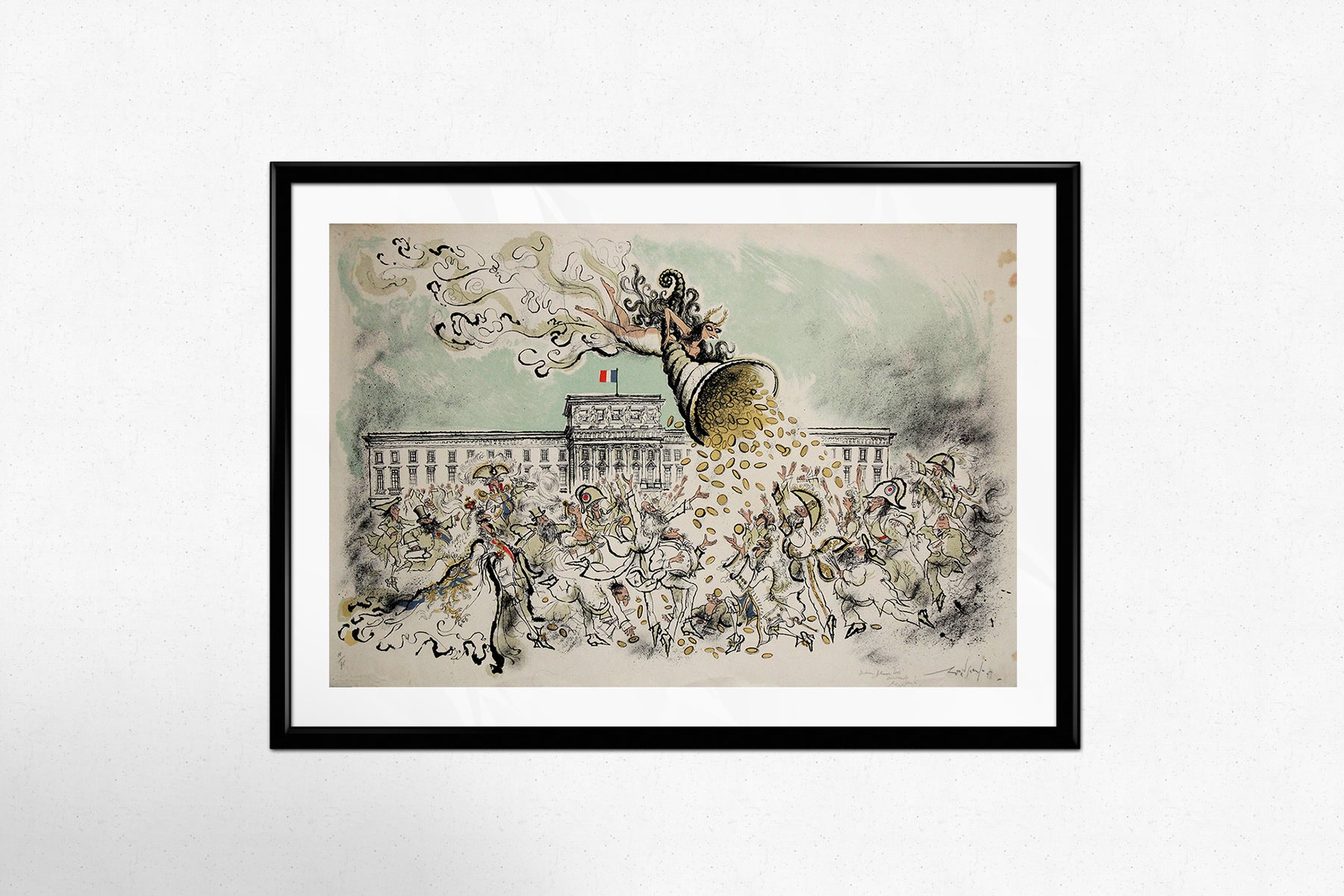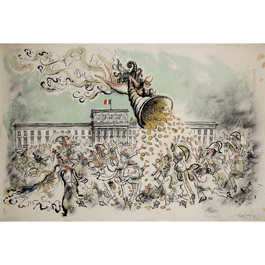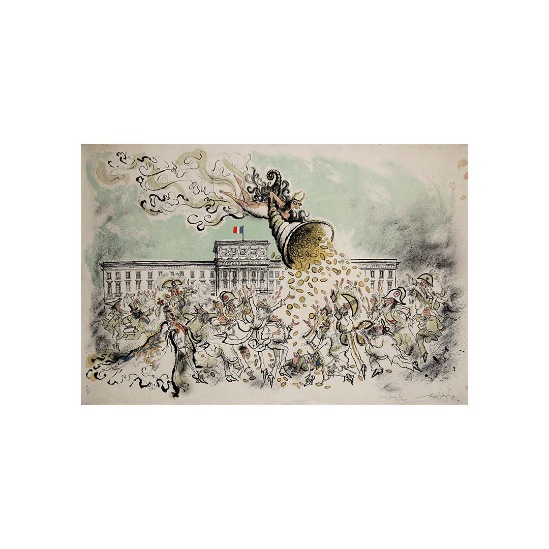 Créée pour la Monnaie de Paris, cette œuvre mêle l'humour mordant et la satire incisive caractéristiques de Searle à un monument culturel parisien. Reconnu internationalement pour son style visuel acerbe et son dessin immédiatement reconnaissable, Searle s'attaque ici au cœur symbolique et institutionnel de la monnaie et du patrimoine français.