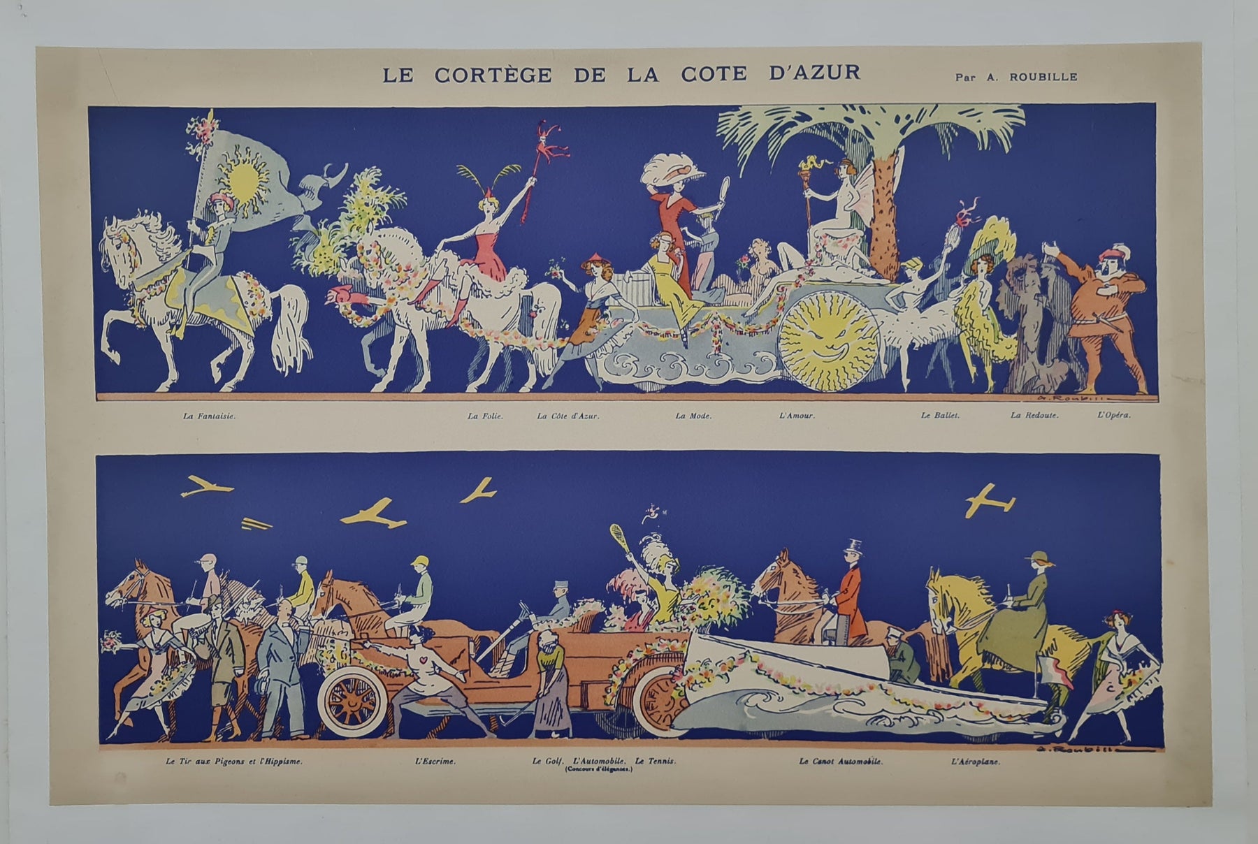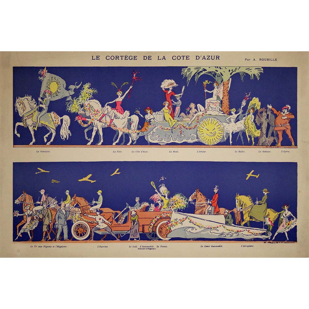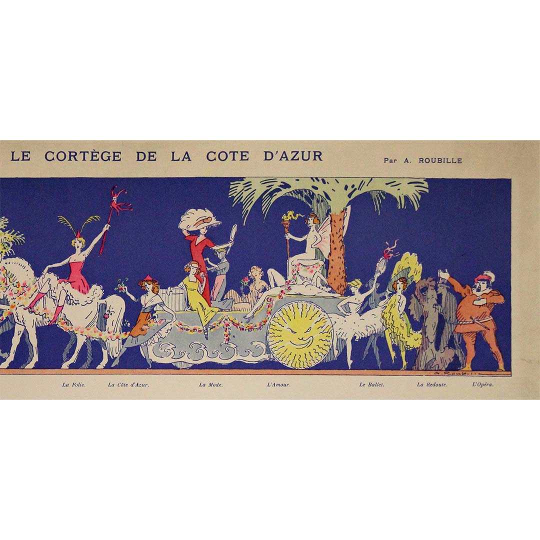 Cette superbe affiche originale d'exposition, datant d'environ 1920 et intitulée « Le Cortège de la Côte d'Azur » , est une œuvre remarquable d'Auguste Roubille (1872-1955), célèbre illustrateur et affichiste français. L'œuvre capture l'esprit vibrant et glamour de la Côte d'Azur, réputée pour son art de vivre luxueux, ses fêtes fastueuses et ses réceptions mondaines du début du XXe siècle.