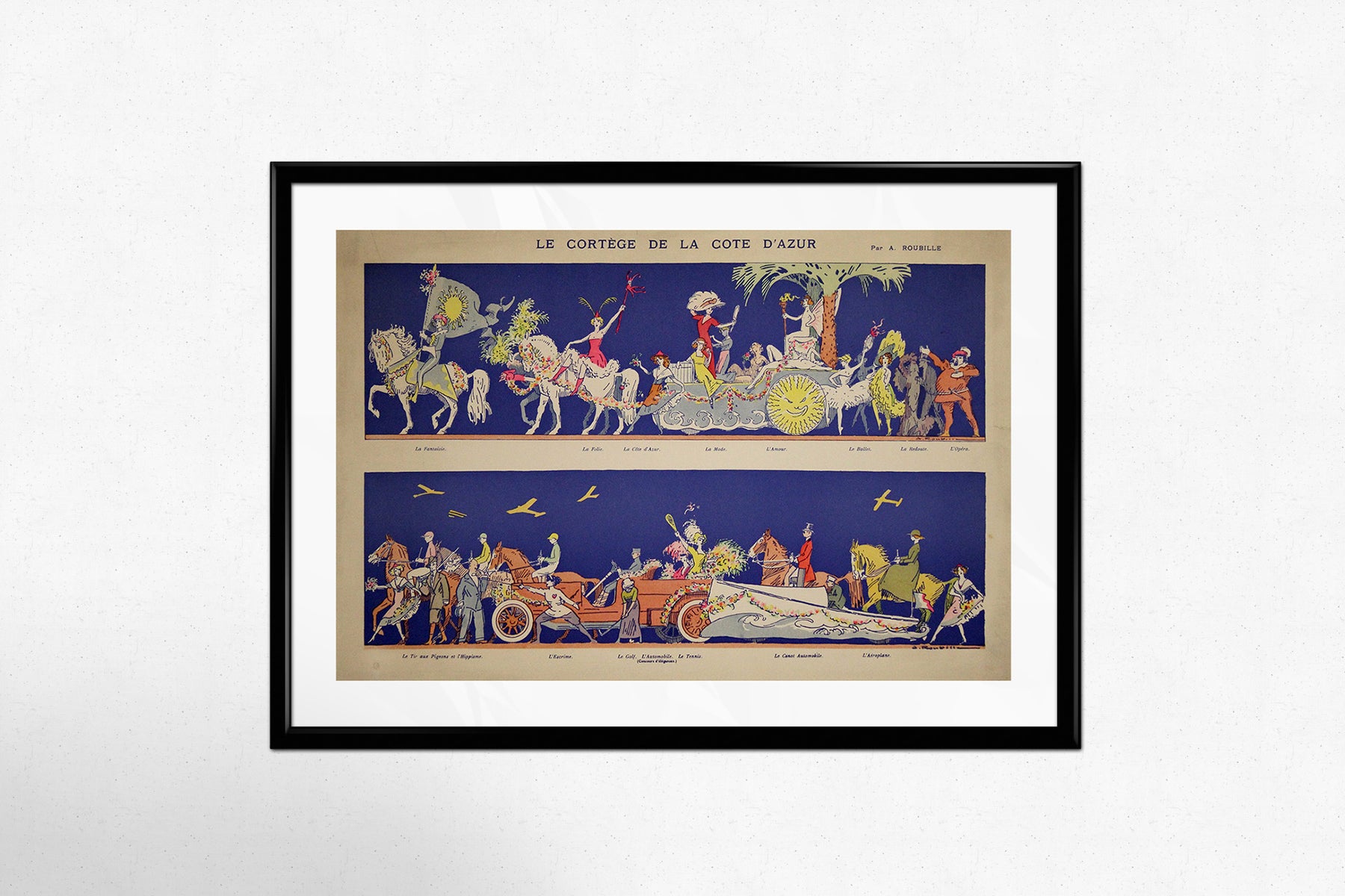 Réalisée dans un style Art déco et Belle Époque flamboyant, l'affiche présente un défilé féerique de personnages élégamment vêtus, de carrosses somptueux et de chevaux magnifiquement harnachés, le tout sur un fond d'un bleu profond saisissant. Chaque section représente différents aspects de la vie sur la Côte d'Azur, de la mode et de la haute société aux loisirs et au sport, notamment le polo, le golf et l'aviation – symboles de la culture aristocratique et cosmopolite de l'époque.
