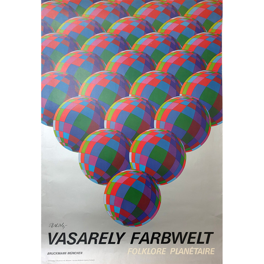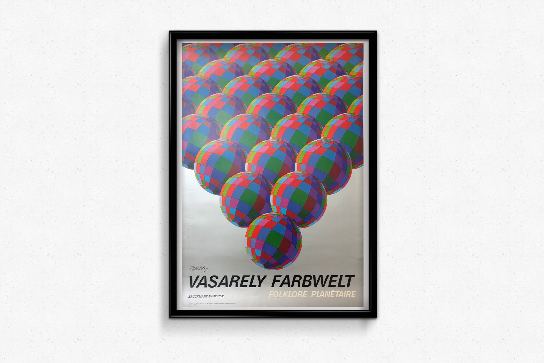 Affiche originale de 1973 réalisée par Victor Vasarely pour l'exposition Folklore Planétaire. Victor Vasarely était un artiste franco-hongrois, considéré comme un précurseur et un chef de file du mouvement Op Art. Son œuvre intitulée Zèbre, créée en 1937, est considérée par certains comme l'un des premiers exemples d'Op Art.