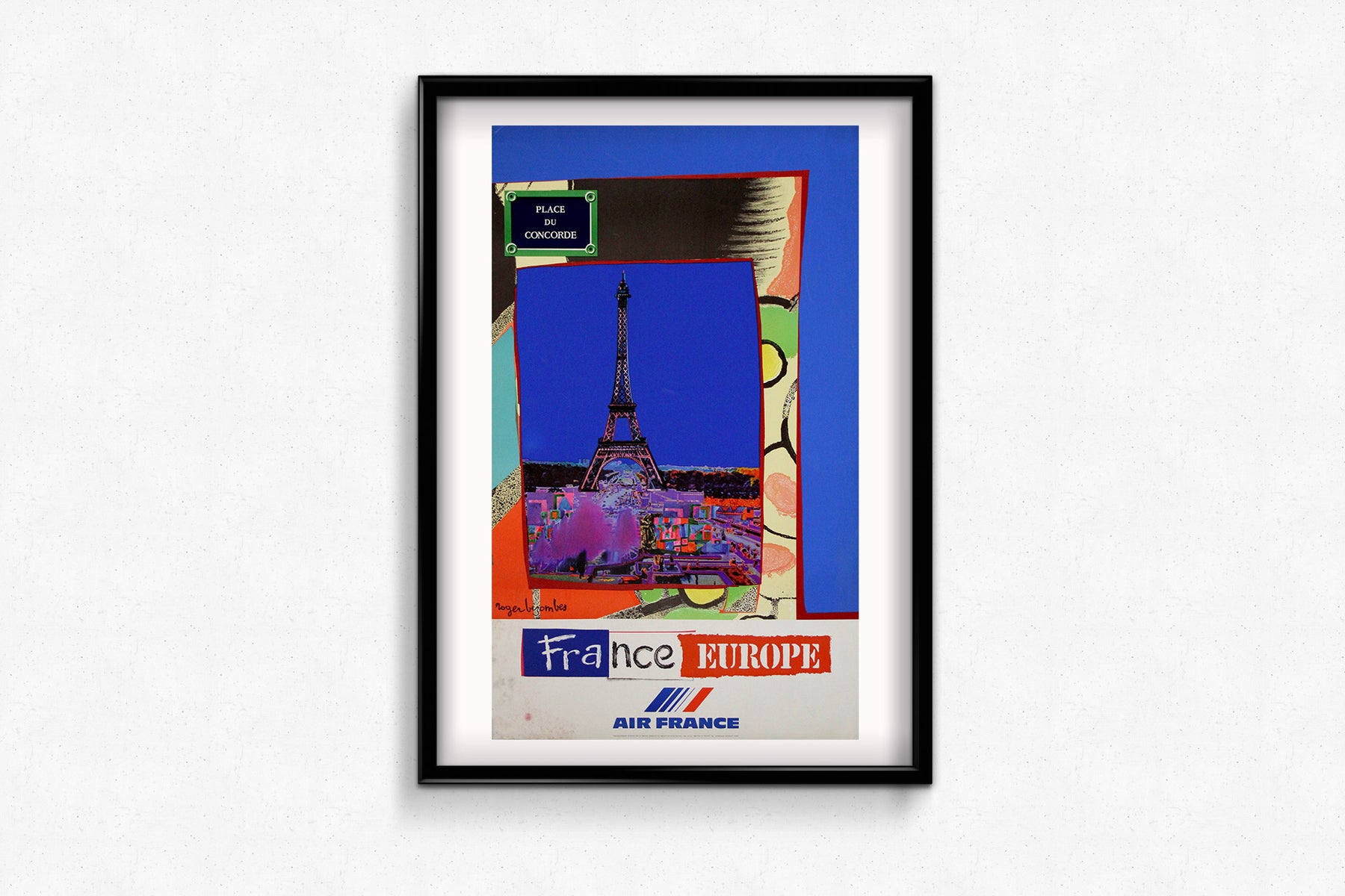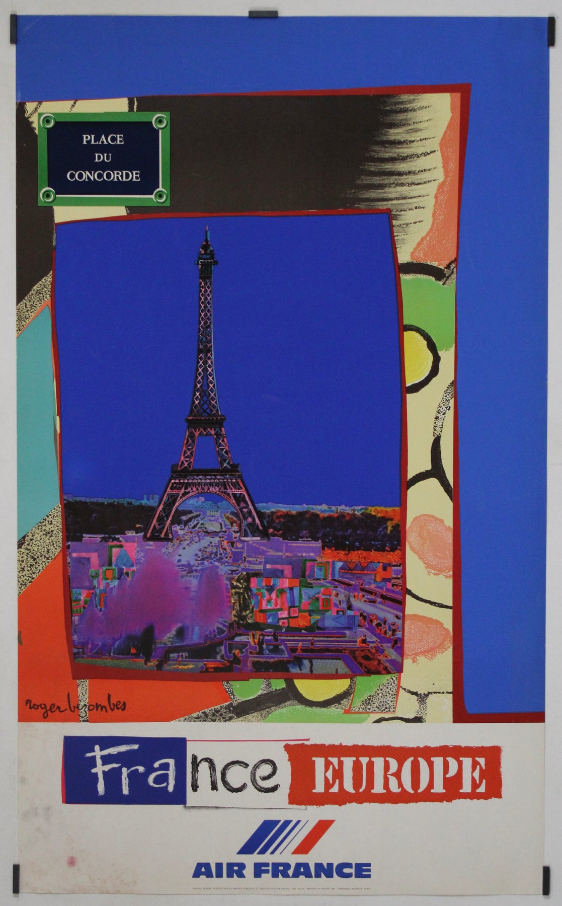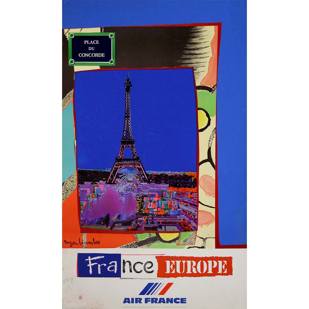 Cette affiche de voyage originale et dynamique de 1981, signée Roger Bezombes pour Air France, est un mélange saisissant de design contemporain et de fierté nationale. Commandée pour promouvoir le tourisme en France et en Europe, elle présente une représentation stylisée et audacieuse de la Tour Eiffel, encadrée en son centre par un collage surréaliste de blocs de couleur, de formes abstraites et de textures qui évoquent d'emblée l'enthousiasme des voyages.