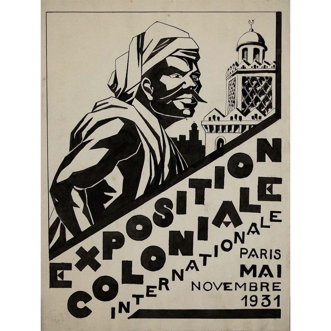 Ce projet d'encre, conçu comme une esquisse préliminaire, s'inscrivait probablement dans un effort plus vaste visant à développer l'identité visuelle de l'Exposition coloniale, l'une des expositions internationales les plus importantes de son époque. Organisée au Bois de Vincennes, l'exposition avait pour objectif de présenter les réalisations culturelles, économiques et artistiques de l'empire colonial français, avec des pavillons représentant des territoires tels que l'Afrique du Nord, l'Indochine et l'Afrique de l'Ouest.