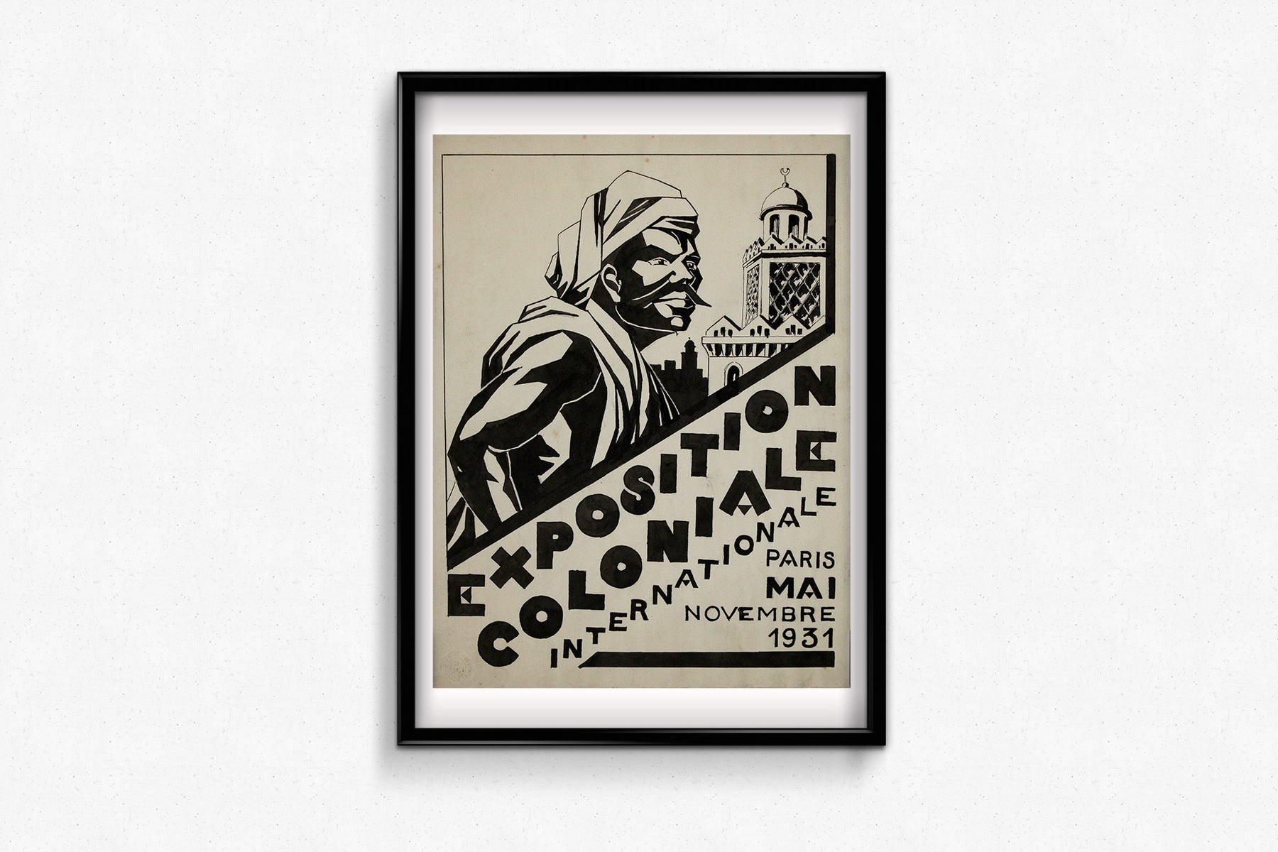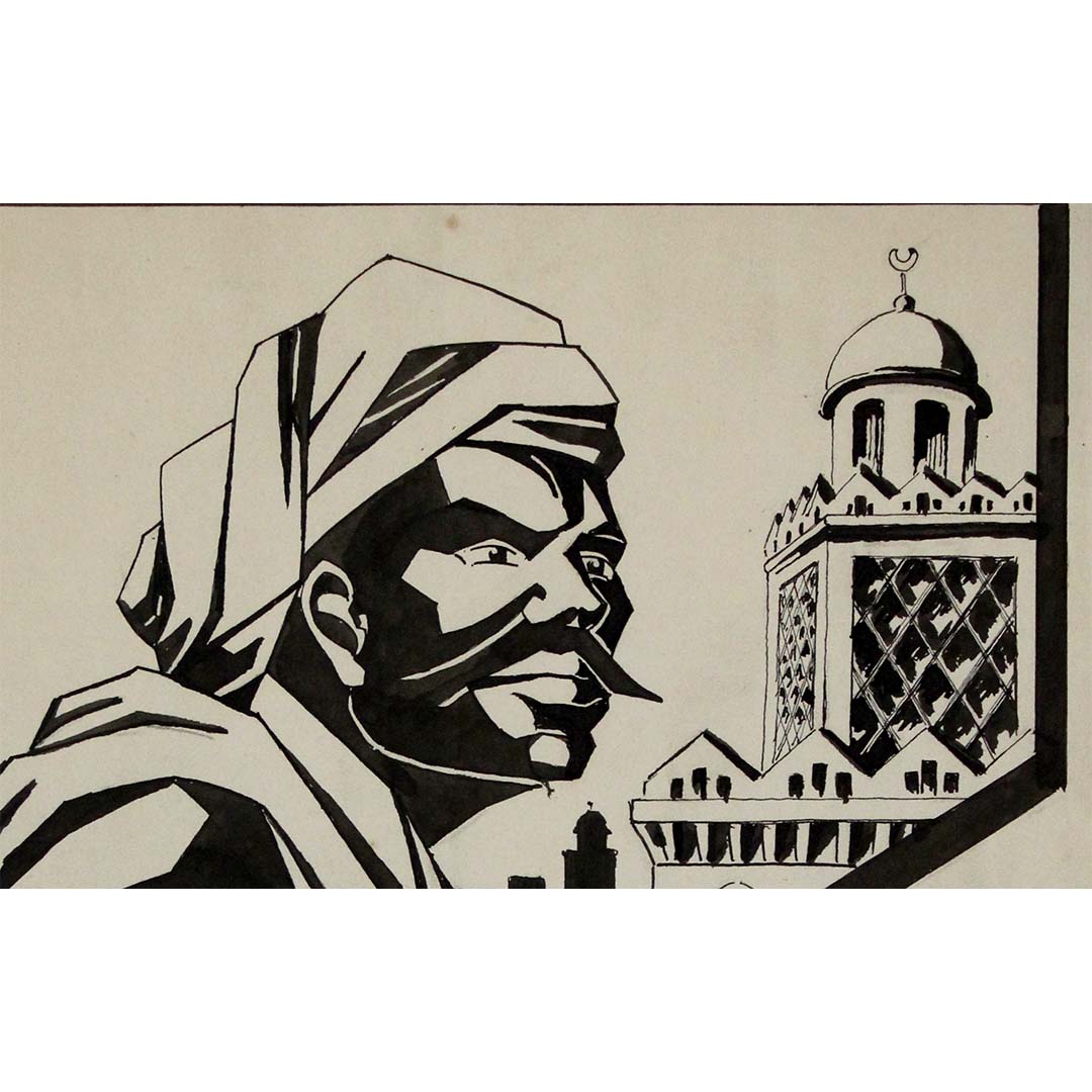 Cette affiche originale à l'encre, créée en 1931, était conçue pour l'Exposition coloniale internationale de Paris, qui s'est tenue de mai à novembre 1931. La composition en noir et blanc, saisissante, présente une représentation angulaire et audacieuse d'un homme en costume traditionnel nord-africain, sur fond architectural évoquant les influences islamiques et coloniales. La typographie, disposée en diagonale dynamique, confère à l'ensemble une impression de force et de mouvement.