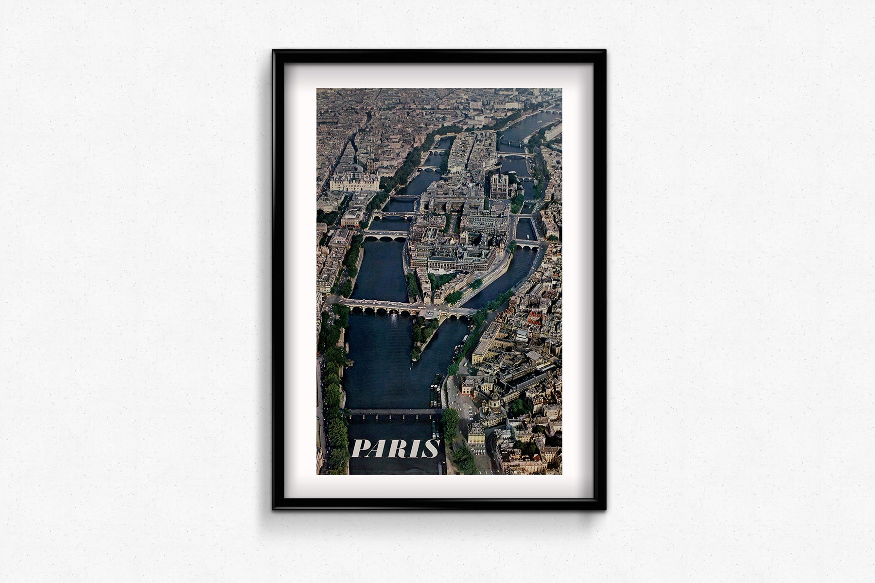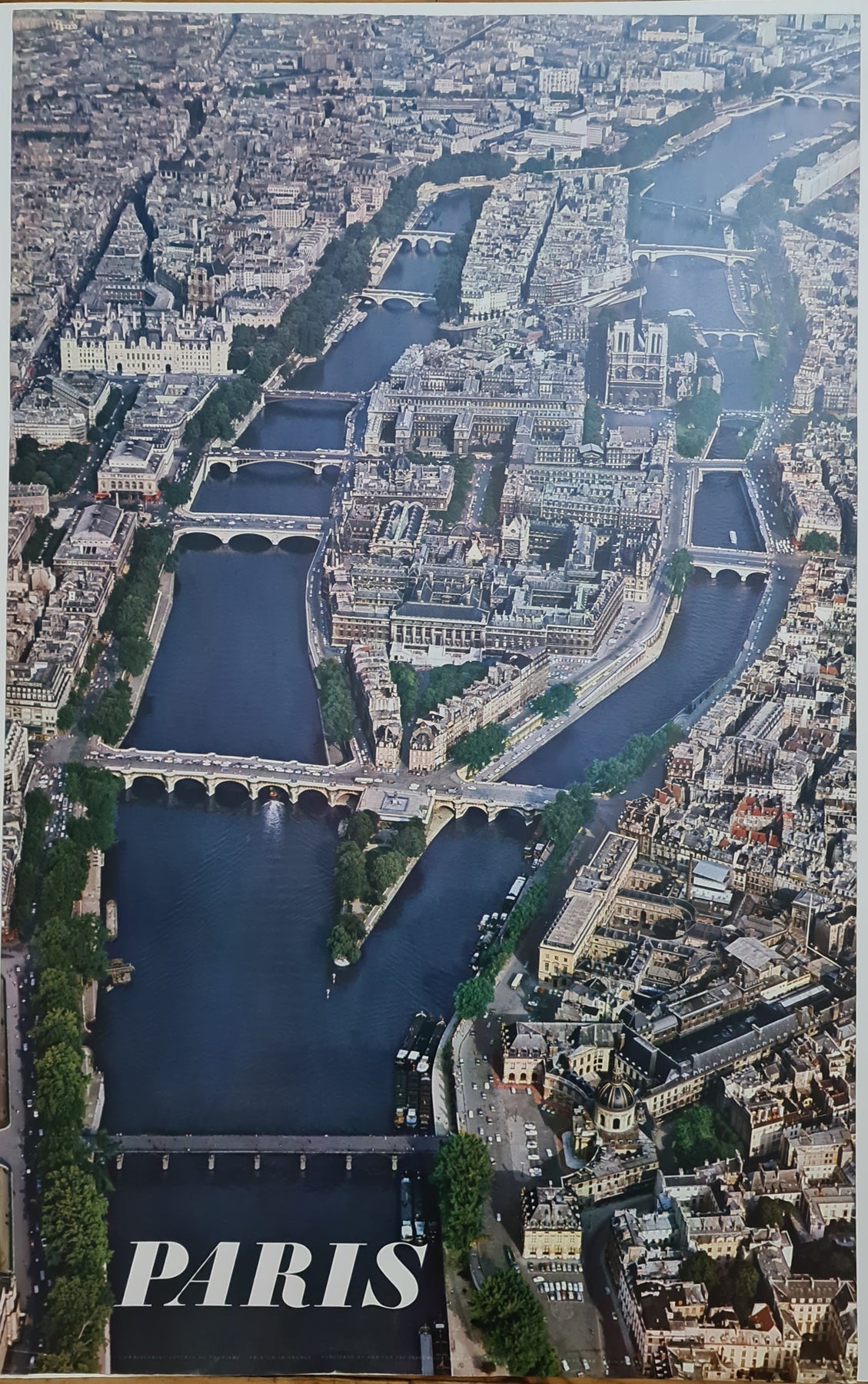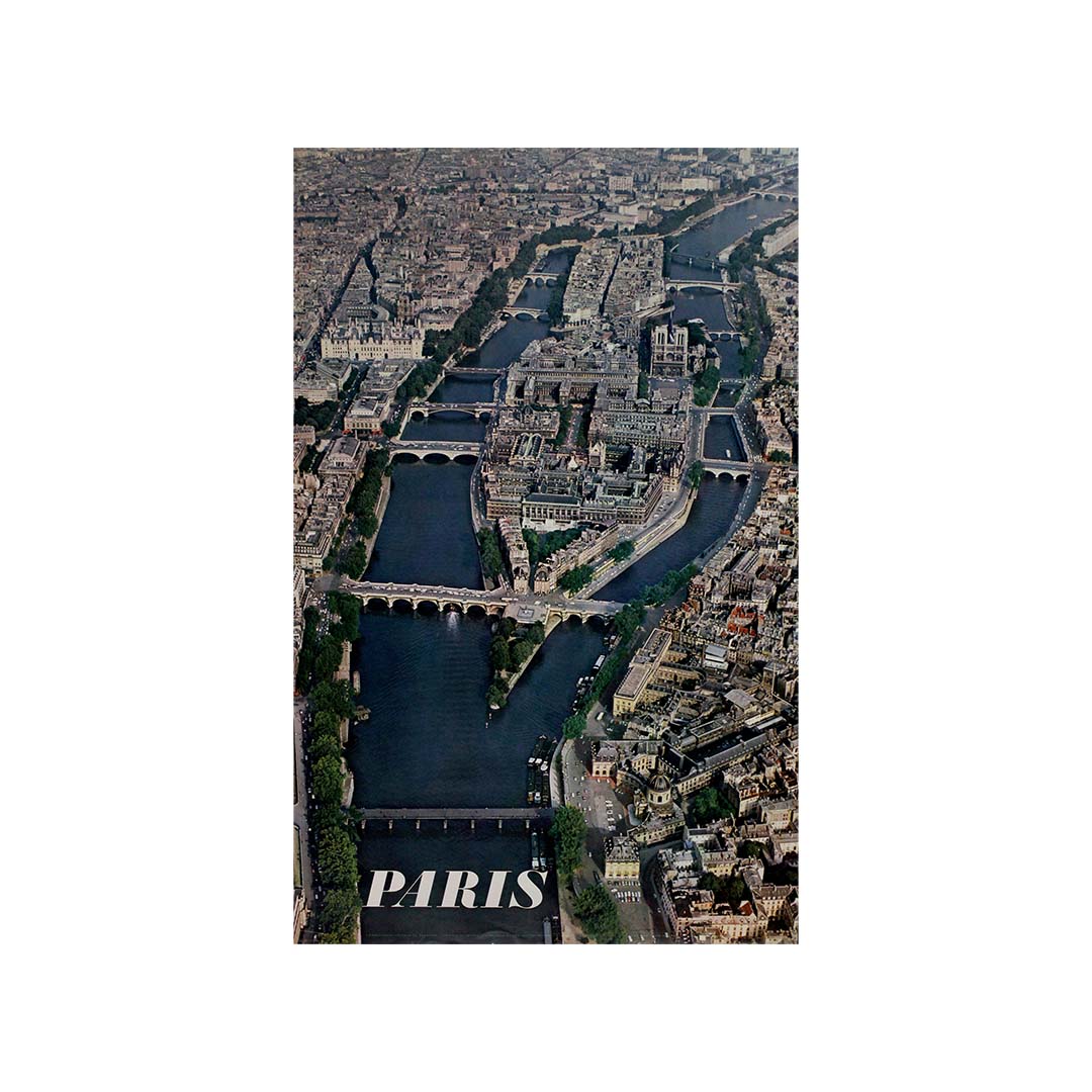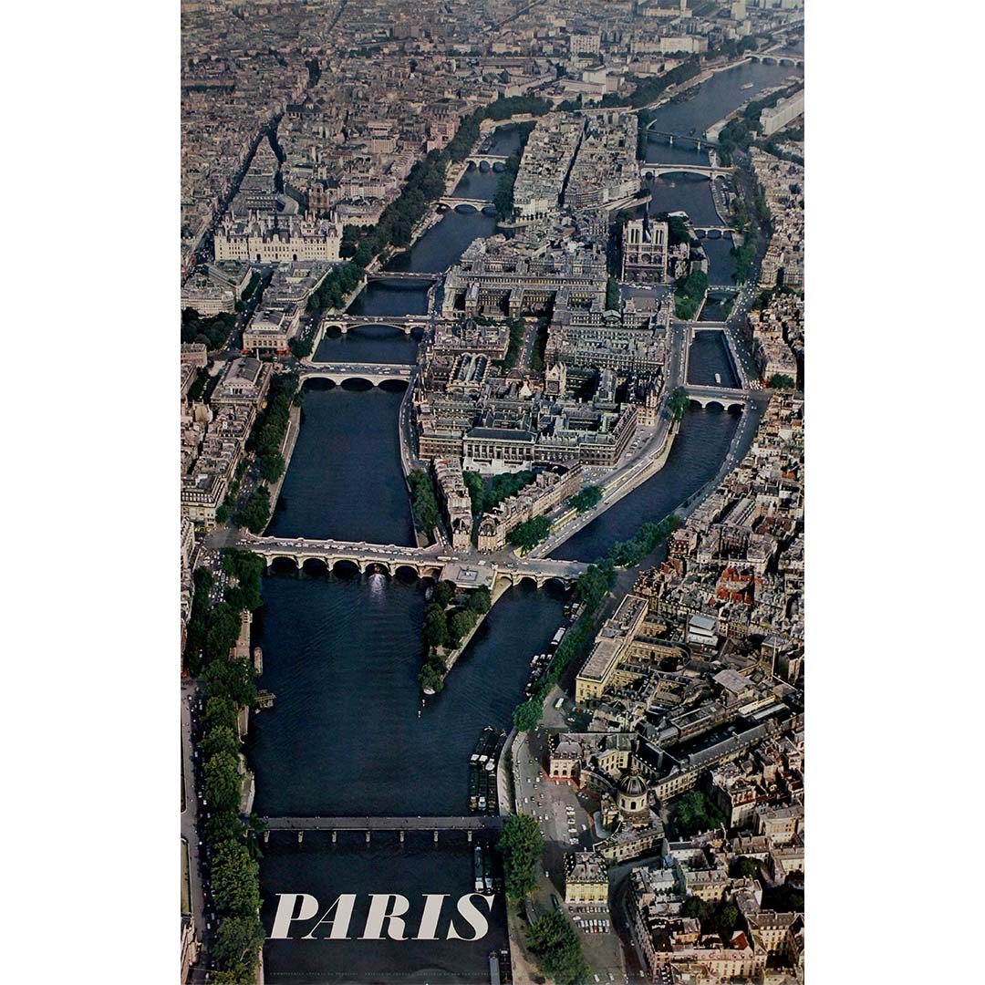Cette affiche de voyage originale de 1965, signée Alain Perceval, offre une vue aérienne époustouflante de Paris, mettant en lumière son cœur historique : l’Île de la Cité et l’Île Saint-Louis. La Seine, enjambée par d’élégants ponts, serpente à travers la ville, guidant le regard vers certains de ses monuments les plus emblématiques. La cathédrale Notre-Dame, avec son architecture gothique remarquable, se dresse majestueusement, ancrant la composition dans un tableau d’une beauté intemporelle.