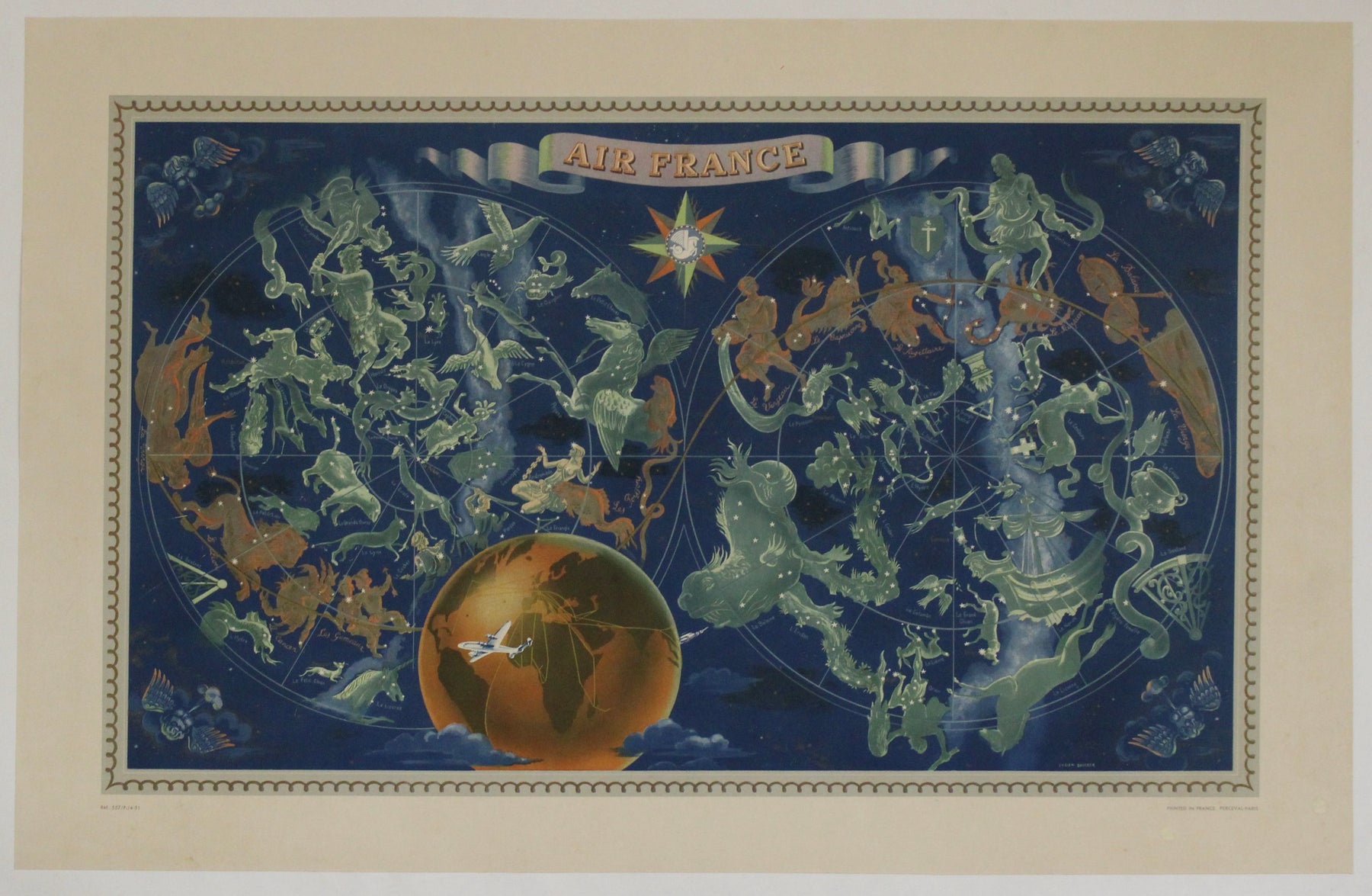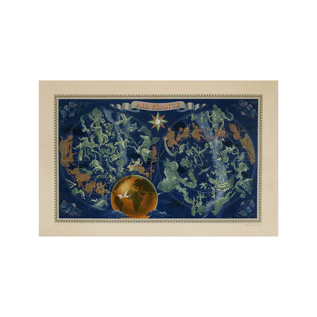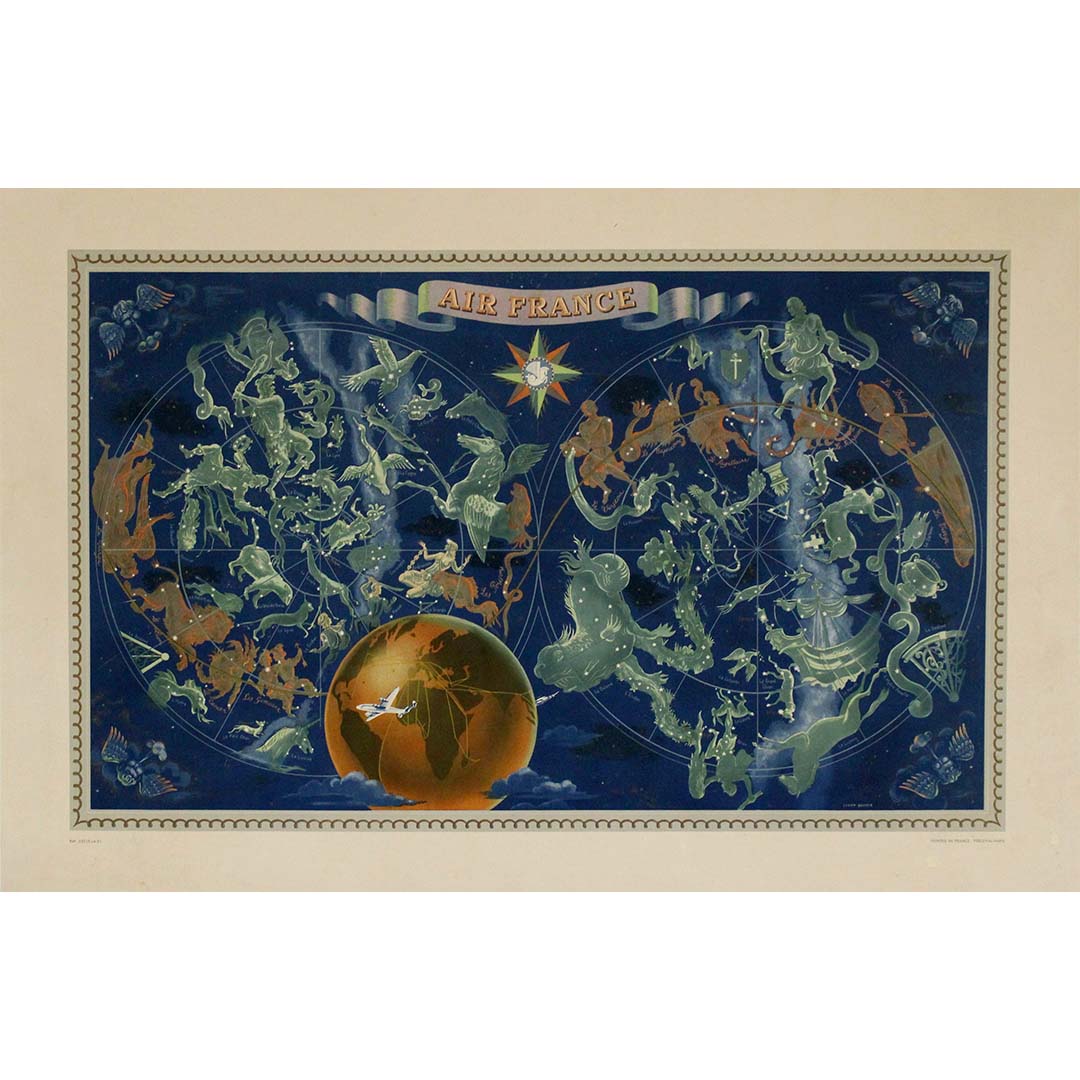 Mélange lumineux de cosmologie et de cartographie, cette affiche originale d'Air France de 1951, signée Lucien Boucher, transforme le ciel nocturne en une élégante célébration du vol, du mystère et de la modernité. Reconnu pour ses illustrations imaginatives, semblables à des cartes, Boucher nous offre ici une carte céleste unique en son genre : les constellations scintillent sur un fond indigo profond, et les symboles du zodiaque guident le réseau en expansion d'Air France.