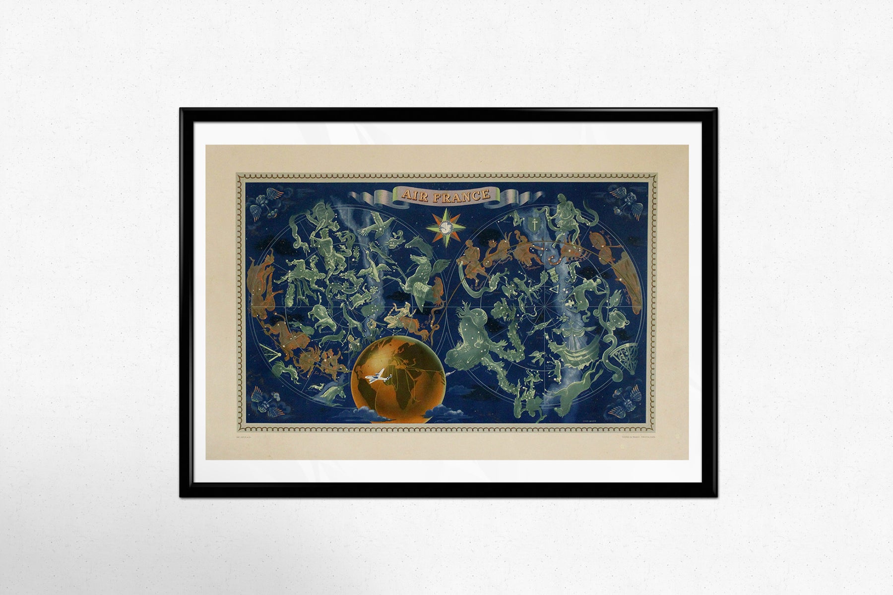 Commandée par Air France à l'apogée du transport aérien commercial, cette affiche faisait partie d'une série célèbre qui positionnait la compagnie aérienne non seulement comme un moyen de transport, mais aussi comme une porte ouverte sur le monde et au-delà. La création de Boucher, inspirée du zodiaque, invite le spectateur à imaginer le vol comme une forme moderne de voyage cosmique, poétique et sans limites.