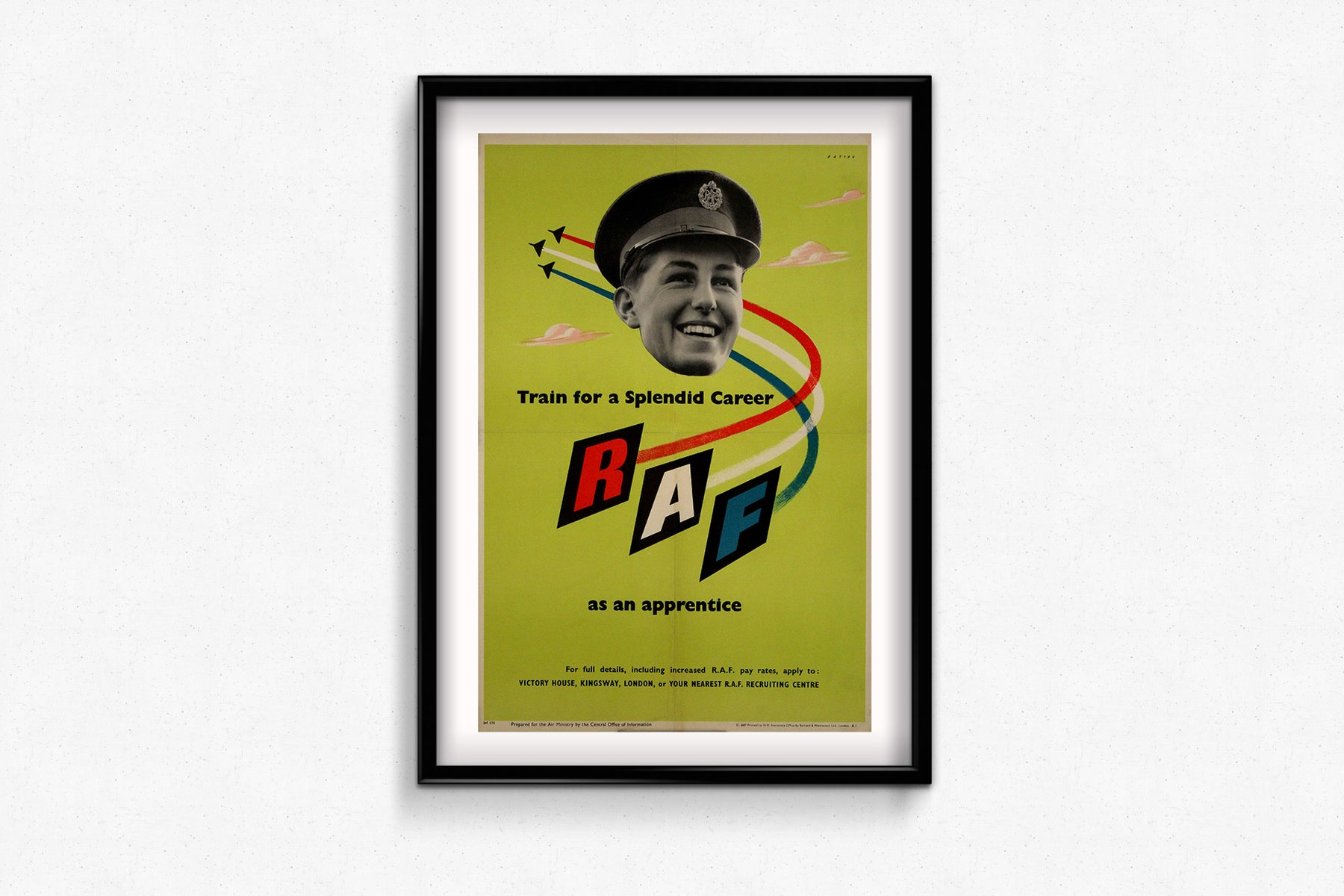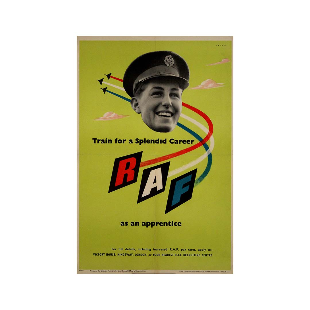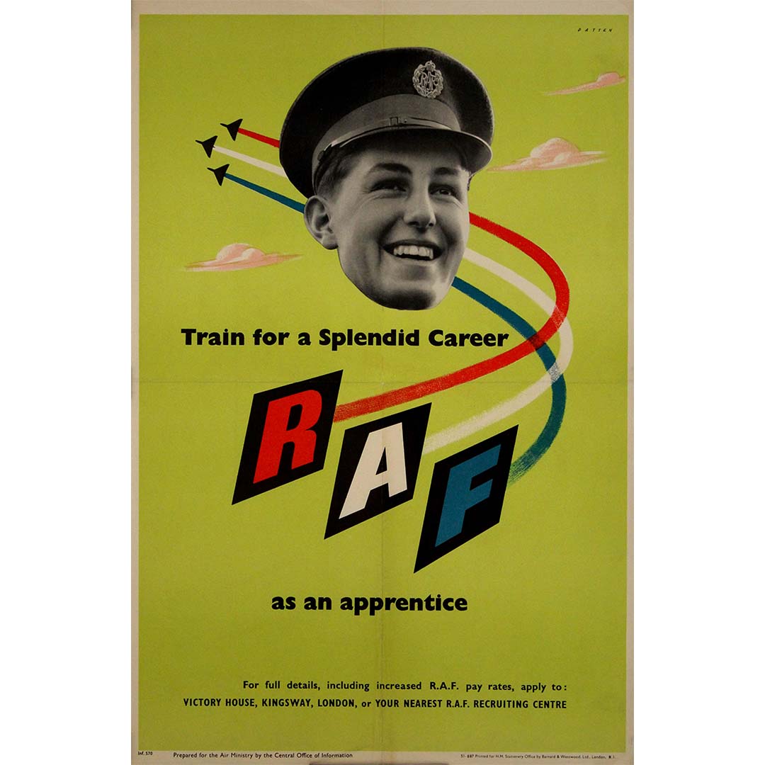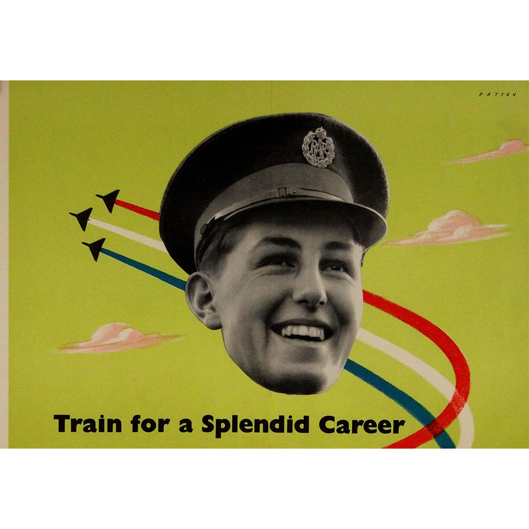 Cette affiche de recrutement originale de la RAF de 1951, conçue par Patten, est une œuvre graphique dynamique et optimiste du milieu du siècle, encourageant les jeunes hommes à « se former pour une brillante carrière » dans la Royal Air Force (RAF) en tant qu'apprentis.