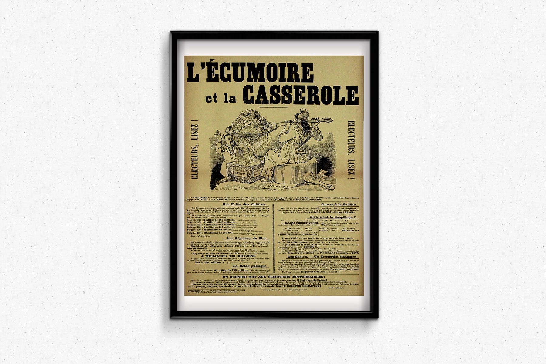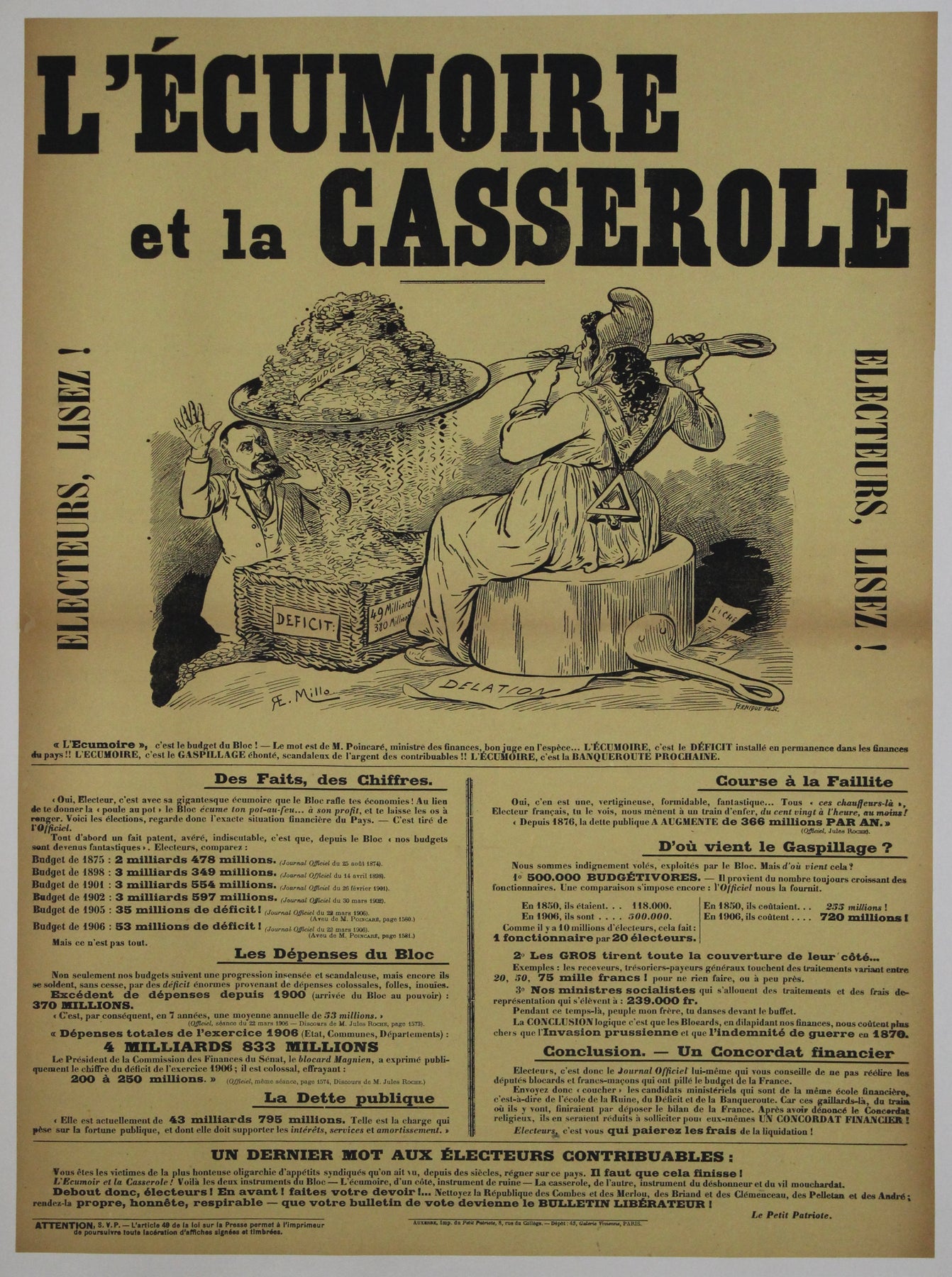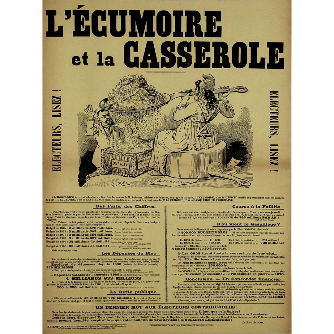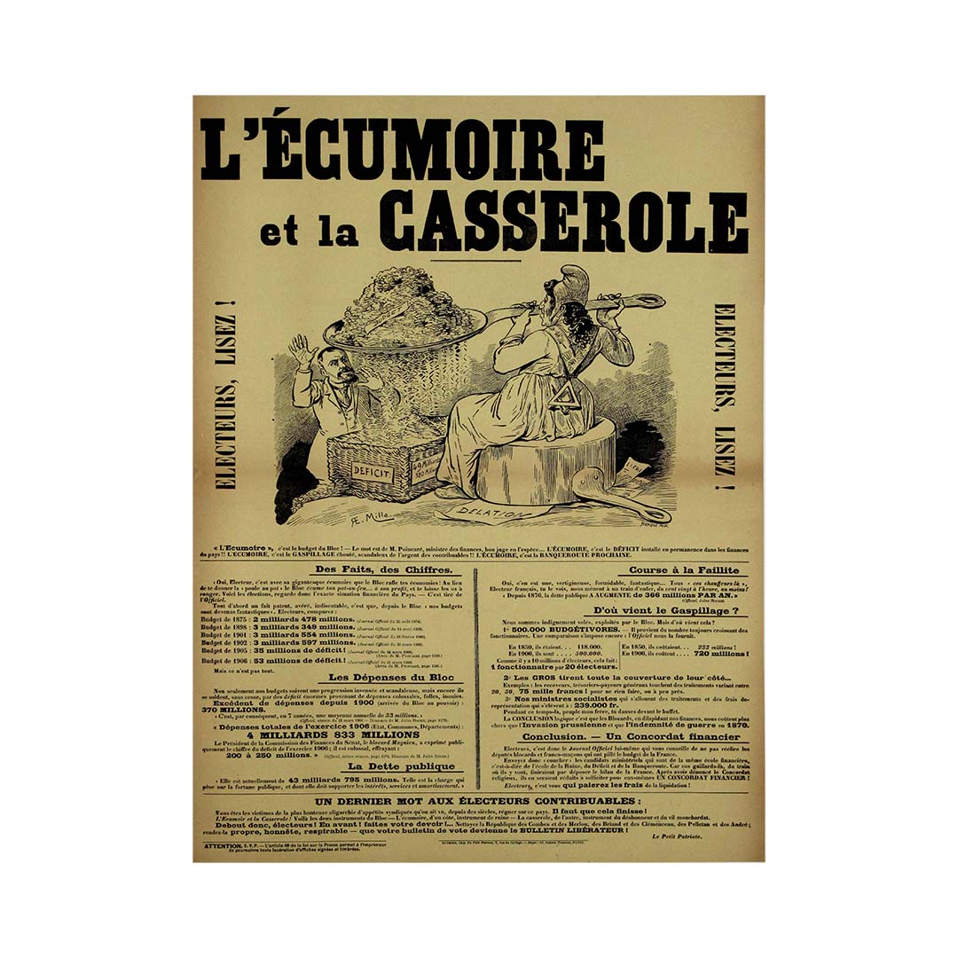 Cette affiche politique datant d'environ 1908, illustrée par E. Millo et intitulée « L'Écumoire et la Casserole », est un exemple éloquent de satire politique française du début du XXe siècle. Publiée par Le Petit Patriote , elle utilise une typographie audacieuse, la caricature et des données financières critiques pour interpeller et convaincre l'électorat sur la prétendue mauvaise gestion des finances publiques par l'État français.