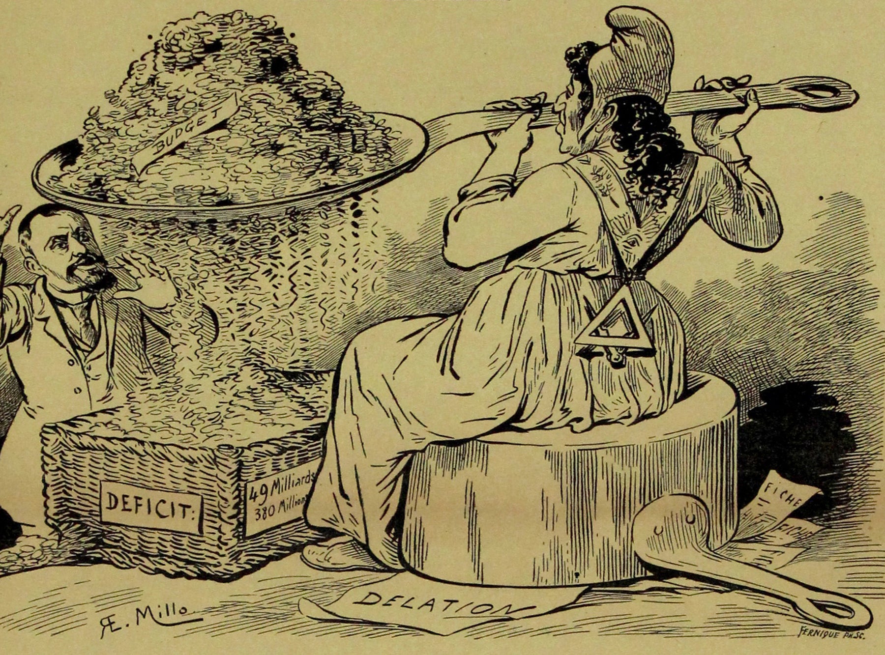 Cette illustration est une allégorie politique saisissante. Une femme, représentant la République et coiffée d'un bonnet phrygien (symbole de la Révolution française et de la liberté), est représentée utilisant une écumoire pour récupérer des fonds publics. Cependant, à l'instar d'une écumoire de cuisine, l'argent s'échappe par les trous, symbolisant l'inefficacité, la corruption et le gaspillage. En dessous, un homme paniqué, représentant peut-être un fonctionnaire ou un contribuable, tente désespérément de récupérer les fonds perdus, debout près d'une caisse étiquetée « Déficit ». La composition est conçue pour un impact immédiat et percutant, grâce à des contrastes saisissants, des gestes expressifs et des expressions exagérées – caractéristiques de la caricature politique de l'époque.