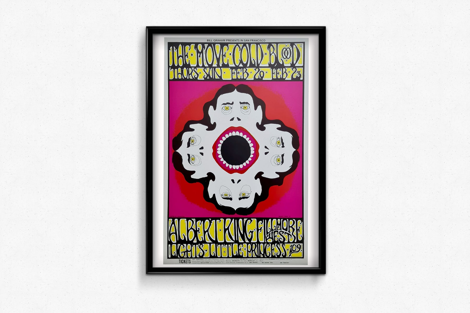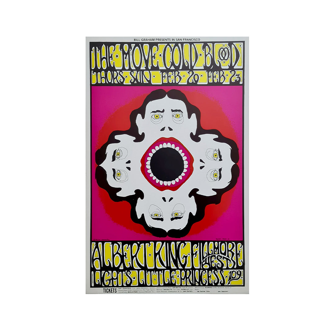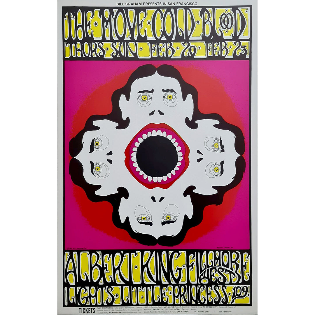 Bon Affiche psychédélique réalisée en 1969 pour Albert King, Cold Blood et The Move, qui se produisaient au Fillmore West de San Francisco.