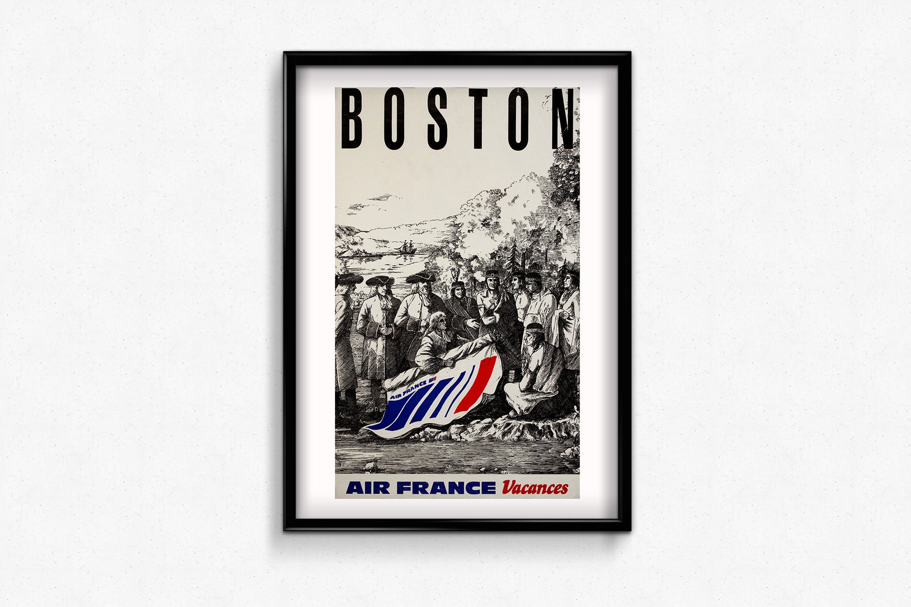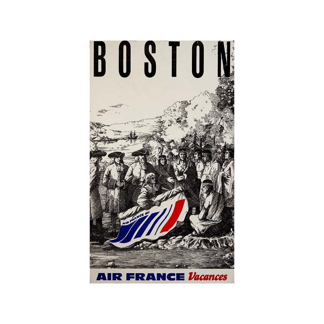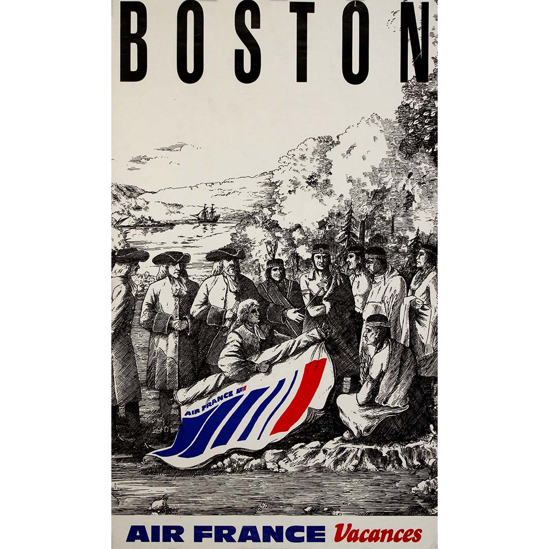 Spirituelle, inattendue et délicieusement anachronique, cette affiche de voyage originale d'Air France Vacances, datant des années 1970, mêle histoire coloniale et image de marque moderne dans une composition d'une originalité ludique. Conçue pour promouvoir Boston comme destination touristique, l'affiche juxtapose une scène classique de style gravure du XVIIe siècle — représentant vraisemblablement les premiers colons de Nouvelle-Angleterre et les Amérindiens — à une touche contemporaine audacieuse : le logo d'Air France drapé dans les couleurs tricolores emblématiques de la compagnie.