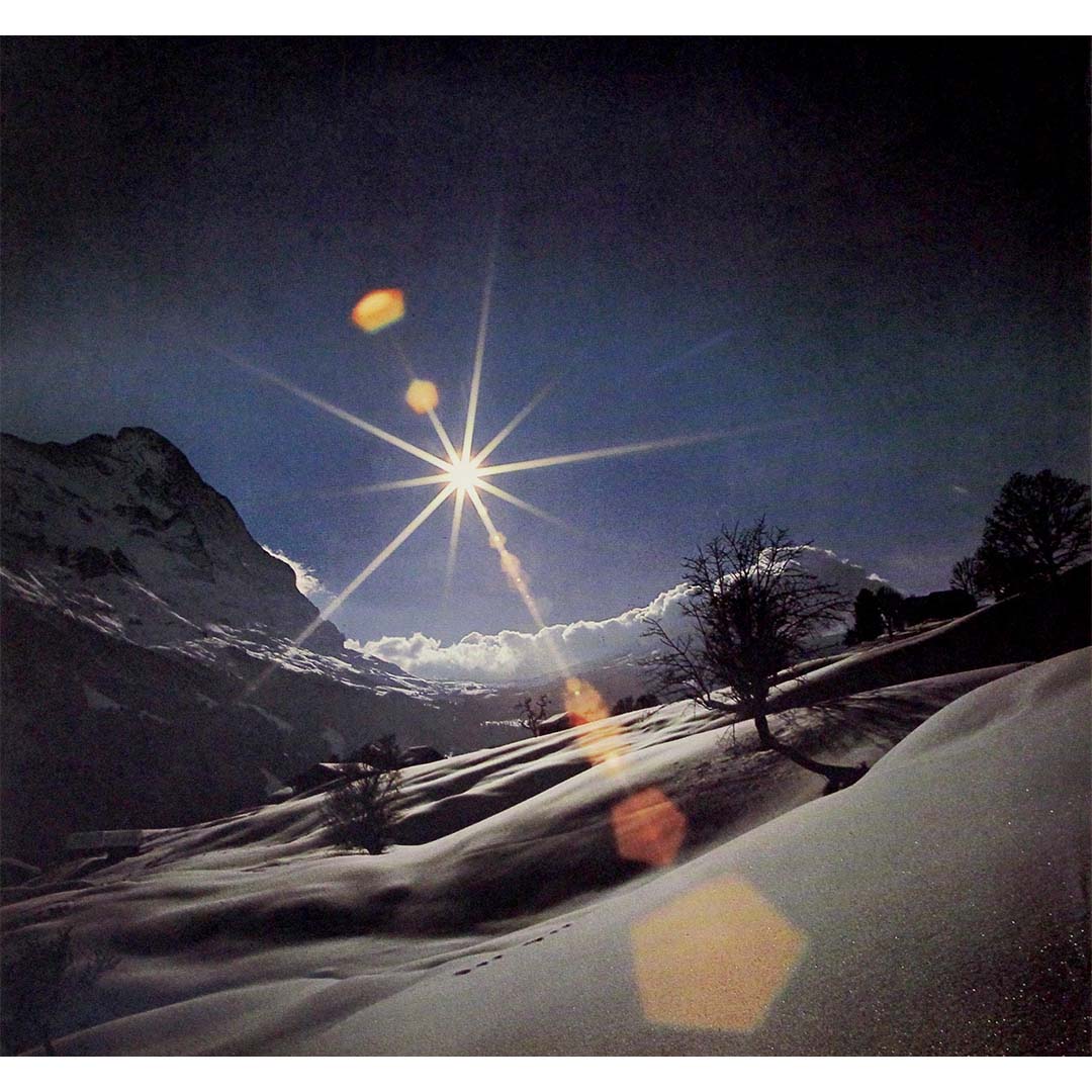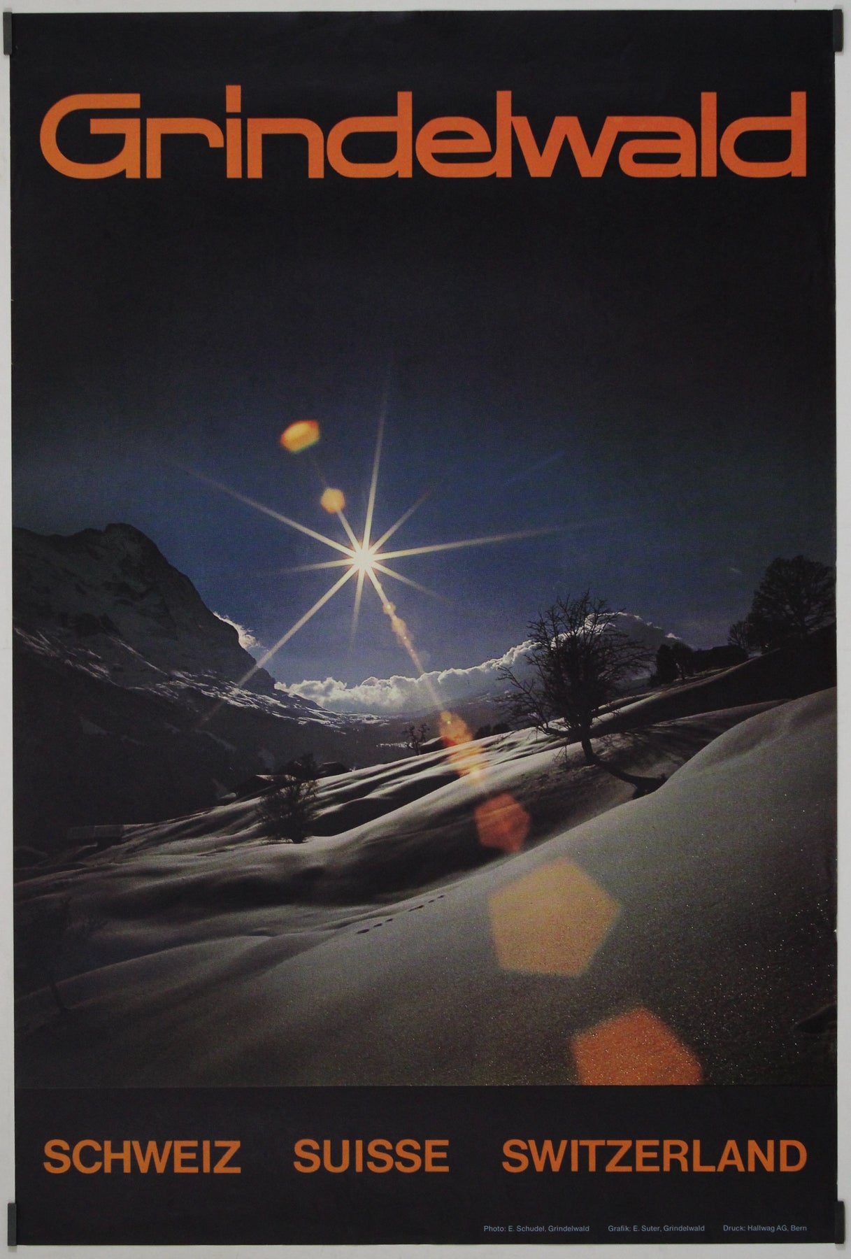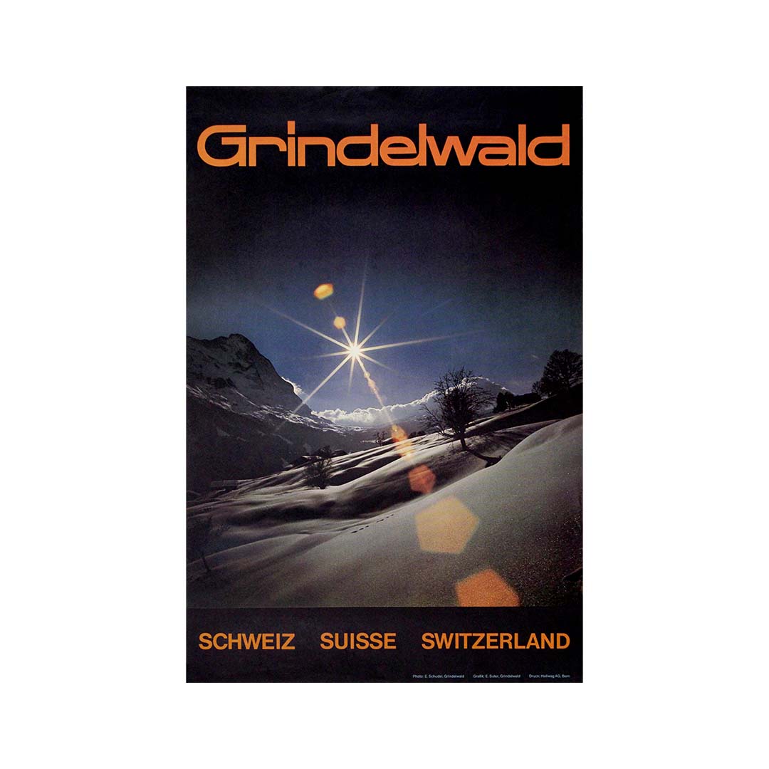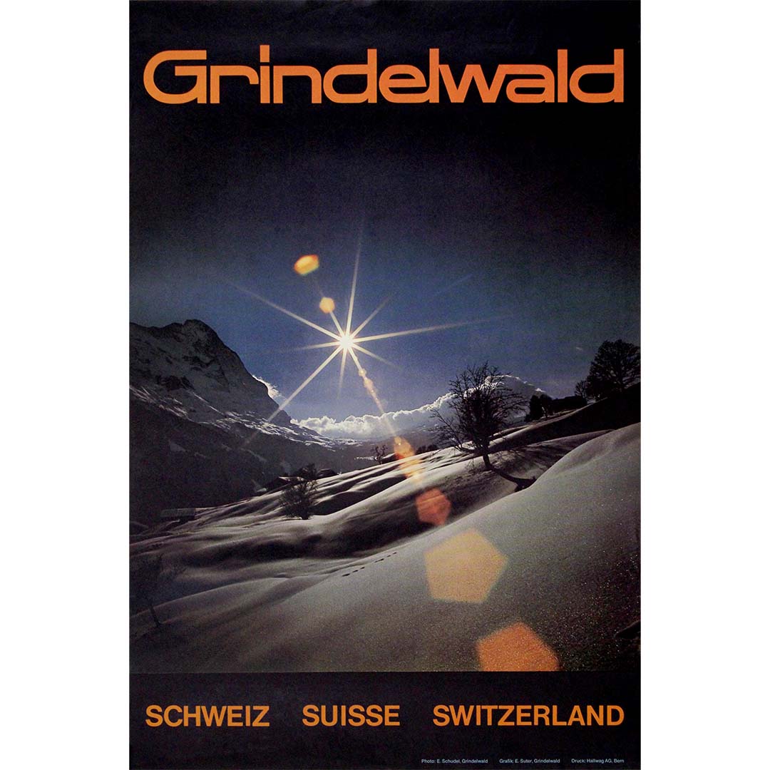 Cette superbe affiche de voyage originale, datant des années 1970, capture la beauté immaculée de Grindelwald en Suisse, photographiée par E. Schudel. La composition plonge le spectateur dans un paysage hivernal féérique où un soleil éclatant perce le ciel alpin limpide, projetant des reflets dorés sur la vallée enneigée. La typographie orange vif, « Grindelwald » en haut et « Schweiz Suisse Switzerland » en bas, ancre la composition dans la pure tradition graphique moderniste suisse.
