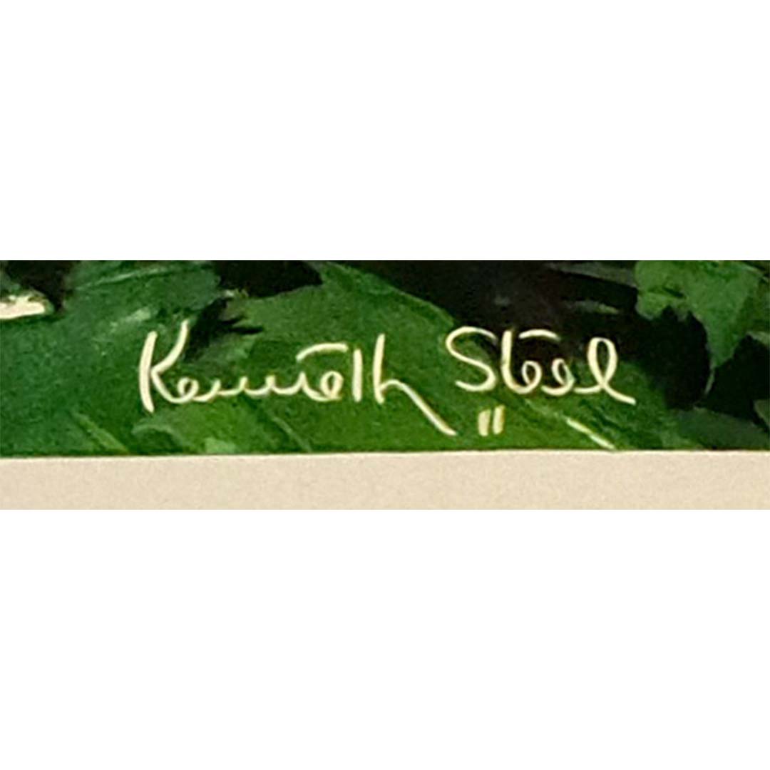 Kenneth Steel, reconnu pour sa maîtrise de l'aquarelle et de la lithographie, immortalise le château de Lancaster avec une grandeur et une profondeur historique saisissantes. L'édifice, à l'architecture normande imposante, est magnifiquement représenté dans des tons chauds qui soulignent la texture des murs de pierre et la végétation luxuriante qui entoure la forteresse. Le talent de Steel pour le jeu d'ombre et de lumière donne vie à la scène, créant une atmosphère à la fois accueillante et majestueuse qui invite au voyage et à la découverte.