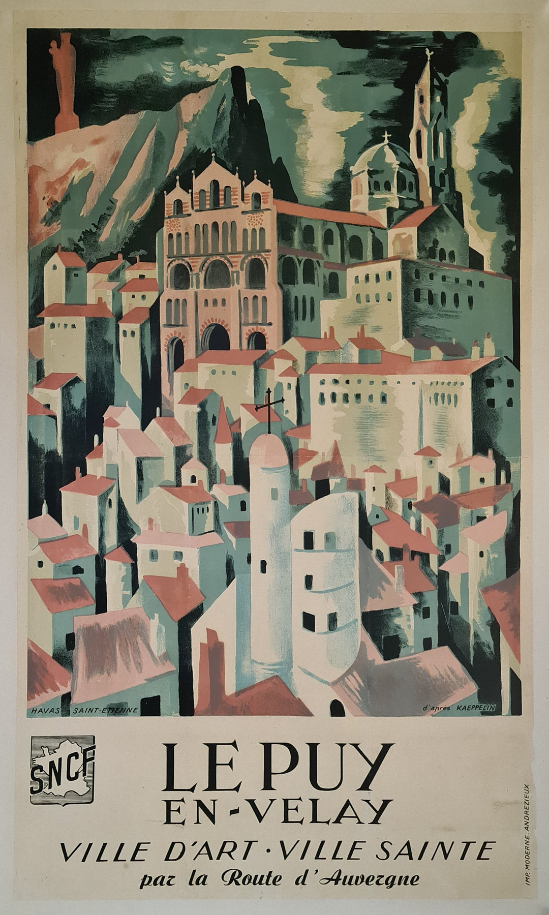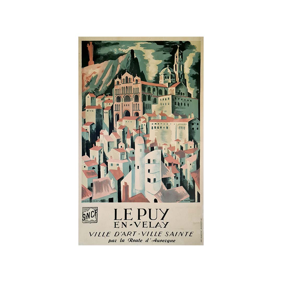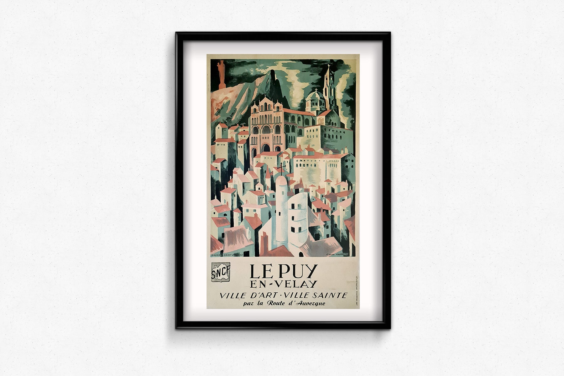 Ornée de l'élégant sous-titre « Ville d'Art – Ville Sainte » , cette affiche témoigne du mélange unique de patrimoine artistique et d'importance religieuse du Puy-en-Provence — un lieu de pèlerinage et le point de départ de l'un des chemins vers Saint-Jacques-de-Compostelle.