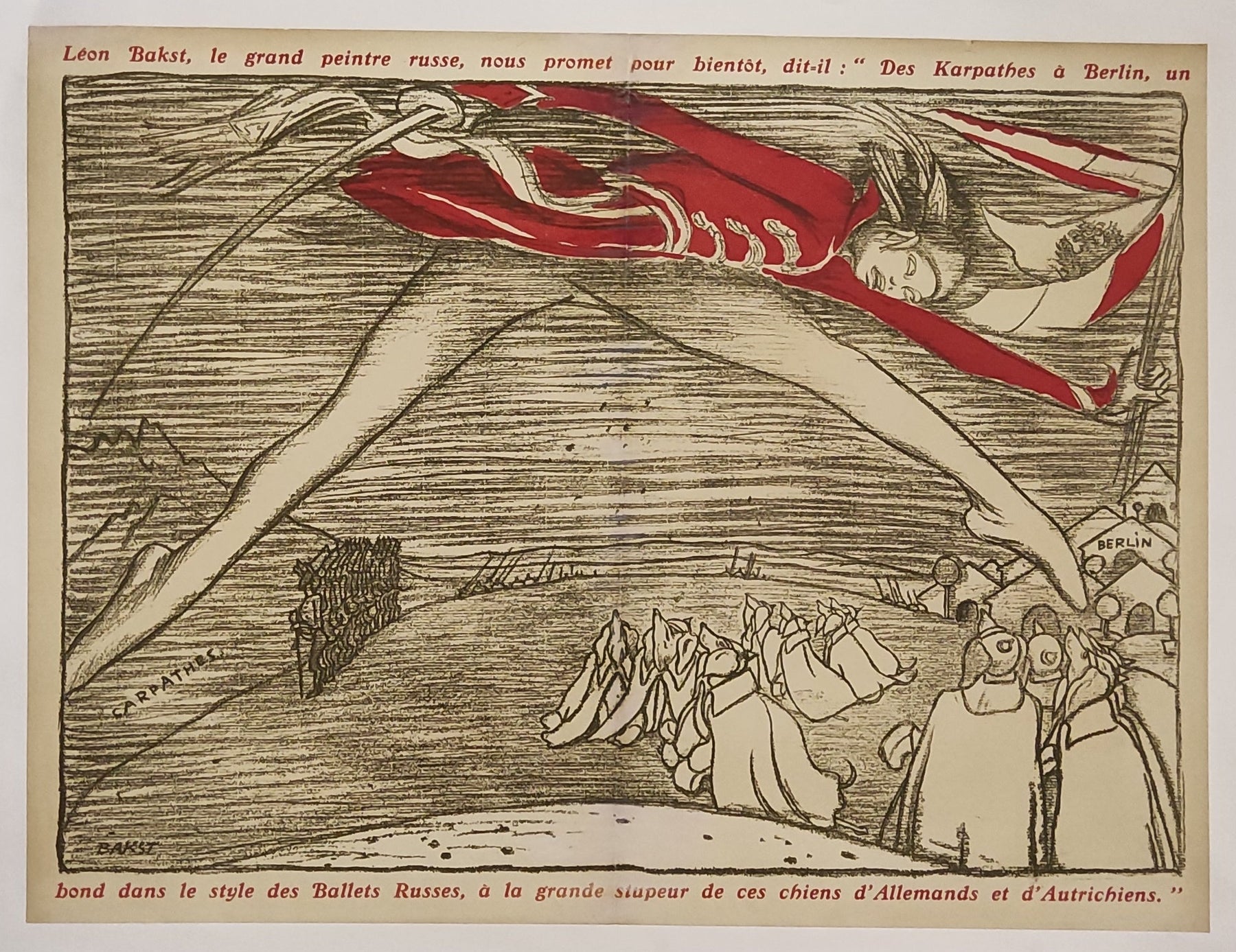 Le texte en haut se traduit approximativement par : « Le grand peintre russe, Léon Bakst, nous promet bientôt : “Des Carpates à Berlin, un saut dans le style des Ballets russes, à la grande stupéfaction de ces chiens allemands et autrichiens !” » Cette phrase renforce l'optimisme audacieux de l'œuvre, qui dépeint les forces allemandes et autrichiennes en des termes désobligeants afin de galvaniser le sentiment français ou russe. Durant la Première Guerre mondiale, de telles représentations étaient courantes, les artistes utilisant la caricature et les symboles nationaux pour remonter le moral des troupes et influencer l'opinion publique.