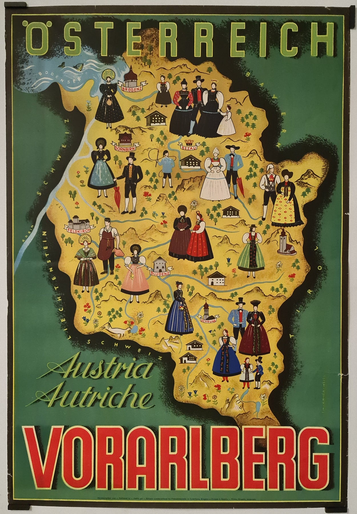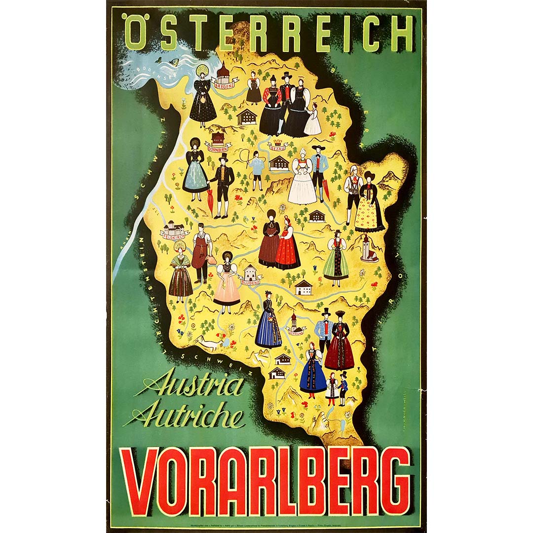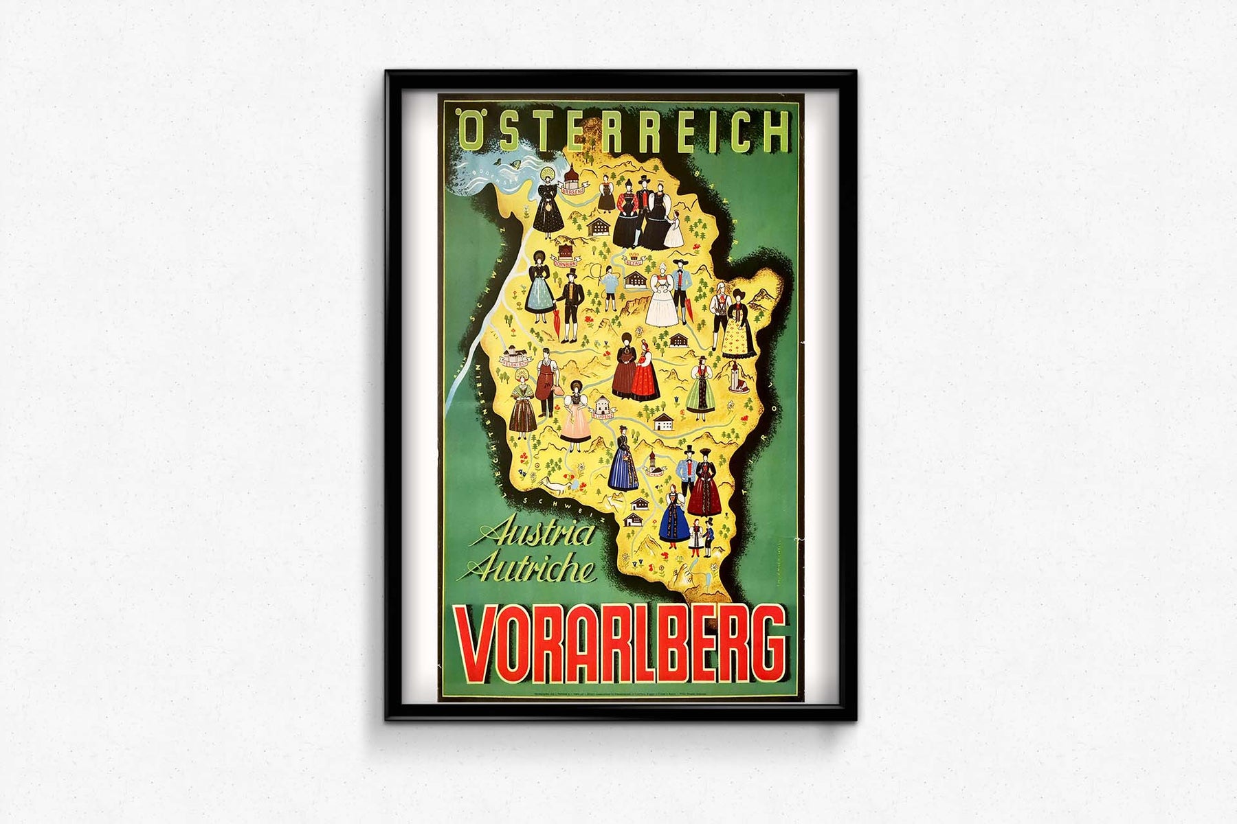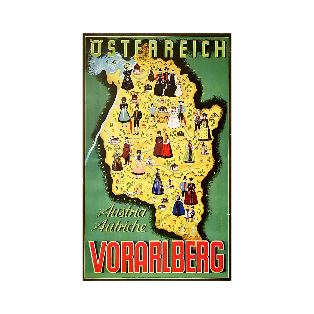 Affiche originale de Thurnher Weiss représentant une carte illustrée du Vorarlberg, une région d'Autriche.