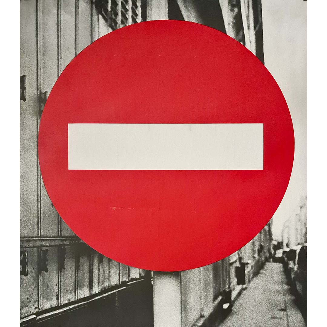 L'exposition « Sens Interdit » de Raynaud, telle que représentée par cette affiche, reflétait probablement son intérêt plus large pour l'interaction entre liberté individuelle et contraintes sociales. Le titre lui-même est emblématique de son utilisation de la signalisation routière, un thème récurrent dans son œuvre, symbolisant l'interdiction et le contrôle. Ce motif de circulation restreinte ou d'« entrée interdite » renvoie à sa réflexion plus générale sur la manière dont les individus évoluent au sein de sociétés structurées et régies par des règles.